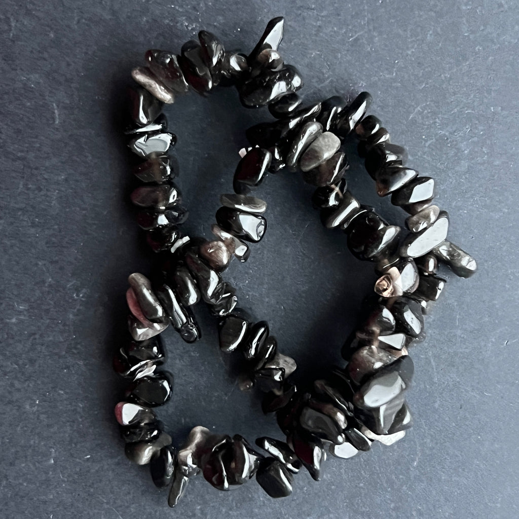 Această brățară din obsidian argintiu, realizată din chipsuri naturale, este o piesă elegantă și misterioasă, ce captează lumina și o reflectă în nuanțe subtile de auriu. Fiecare fragment de piatră are jocuri cromatice unice, transformând brățara într-un accesoriu rafinat și deosebit.