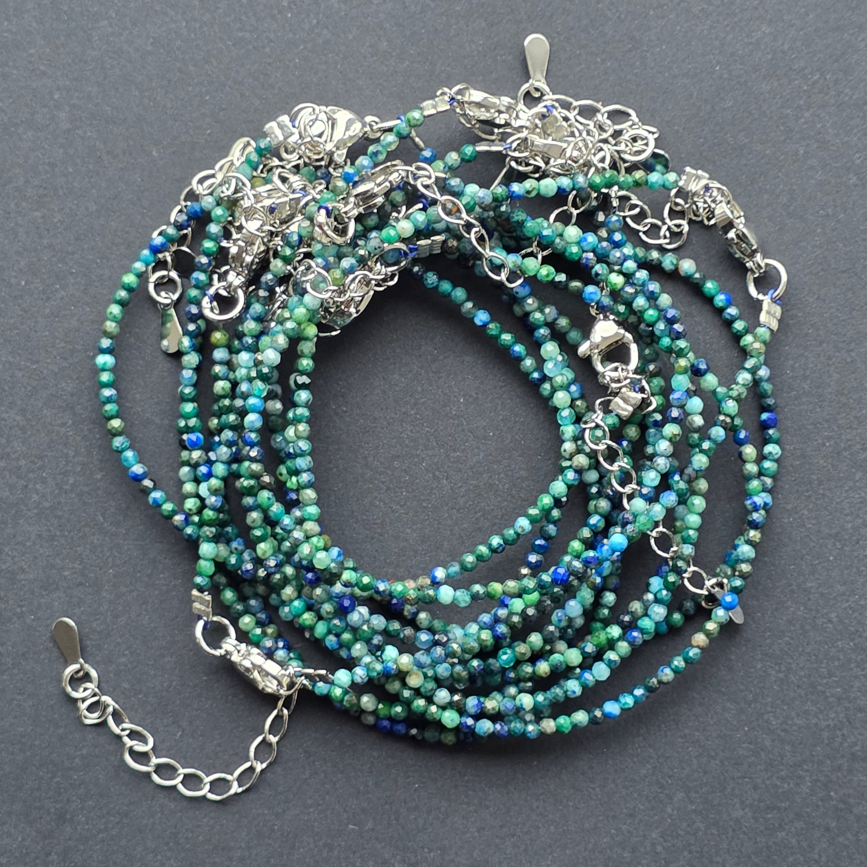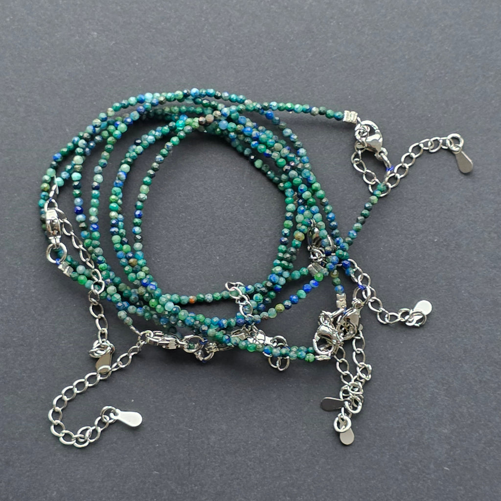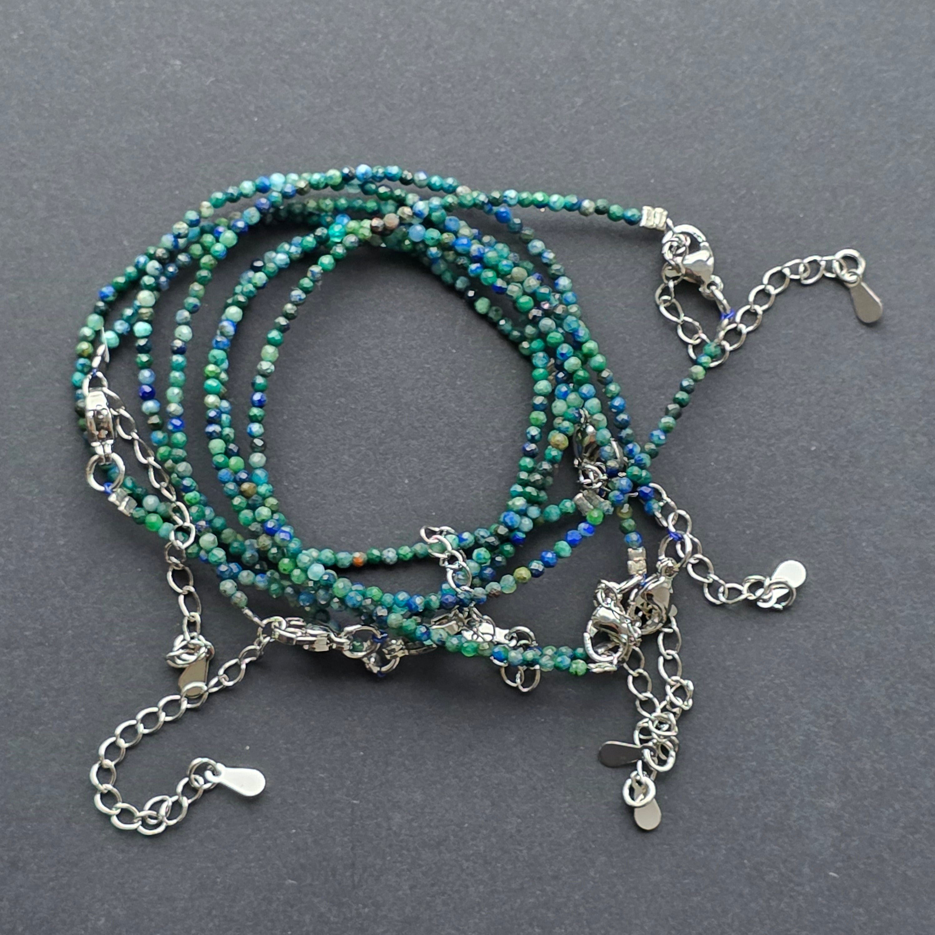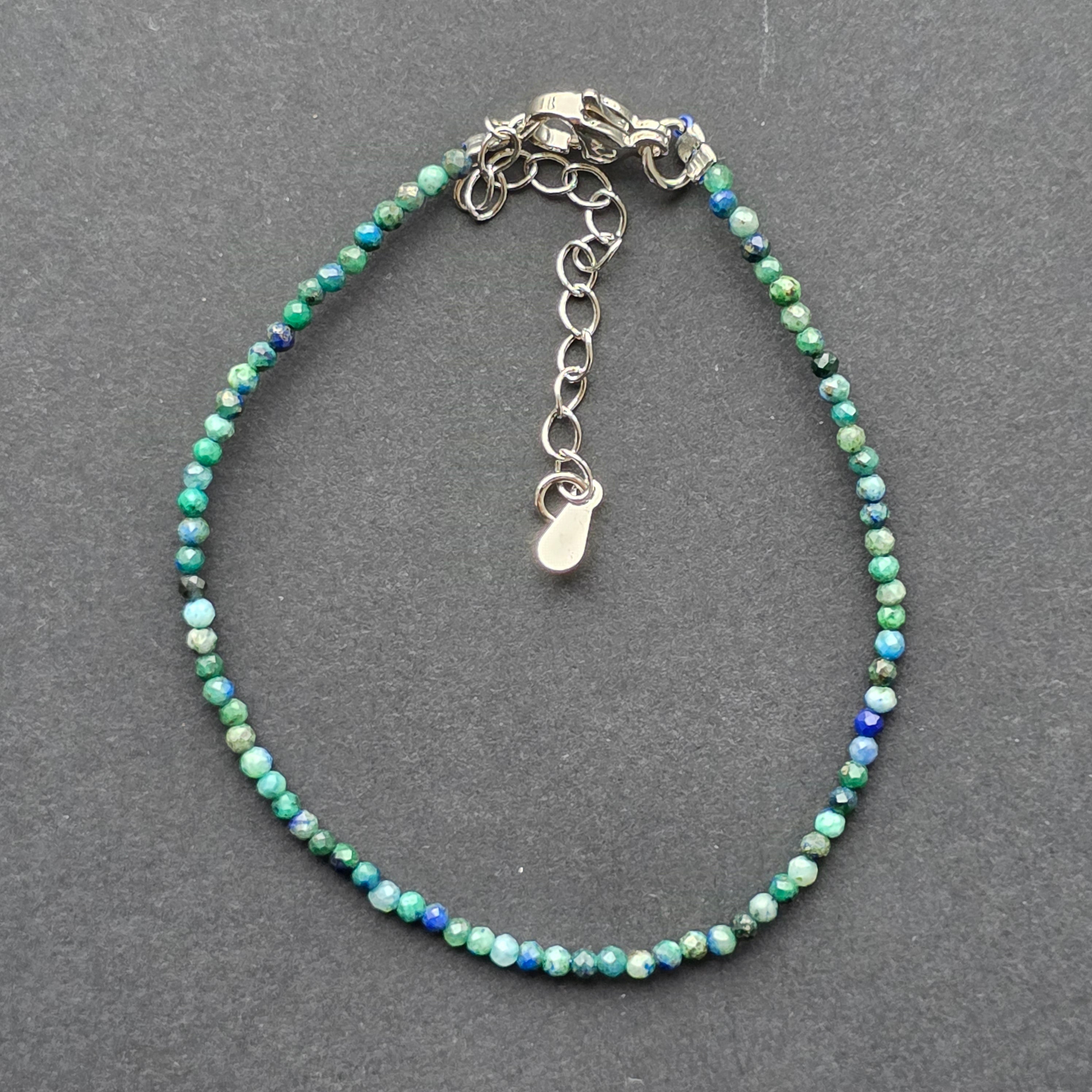 Într-o brățară delicată, aproape eterică, azurit-malachitul prinde viață în mărgele sferice de doar 2 mm, fațetate pentru a surprinde lumina în mici scântei verzi si albastre. Fiecare granulație poartă nuanțe unice, ca niște cercuri concentrice formate în timp, sculptate de natură cu răbdare.