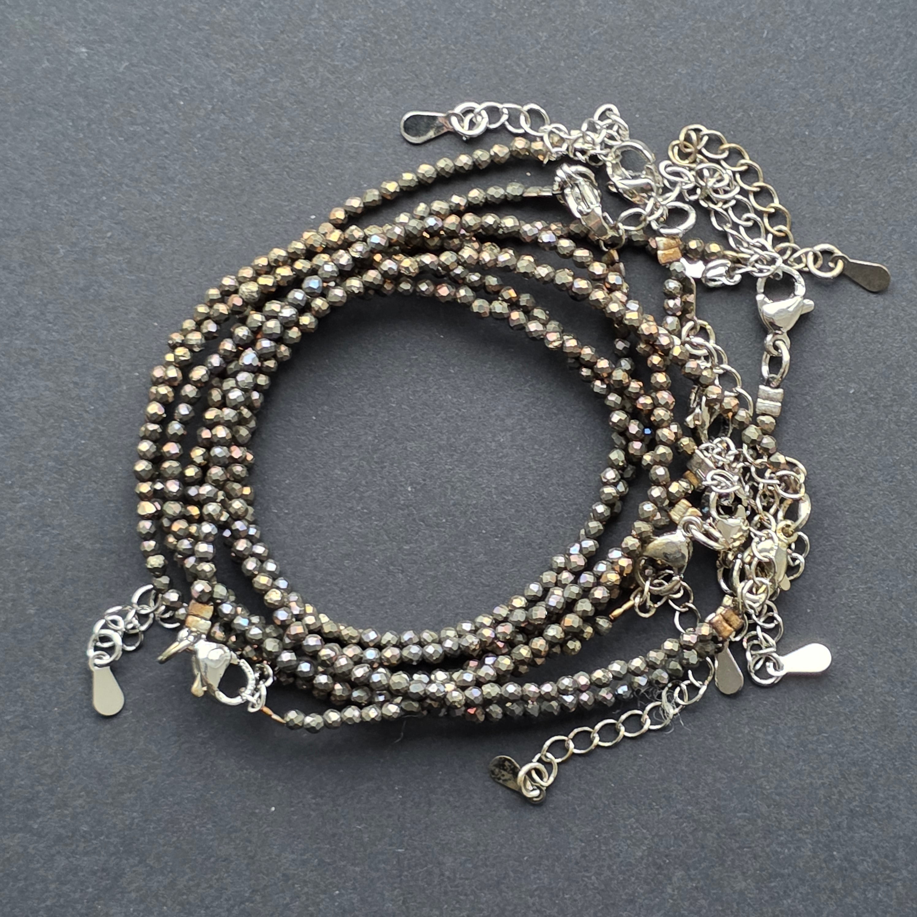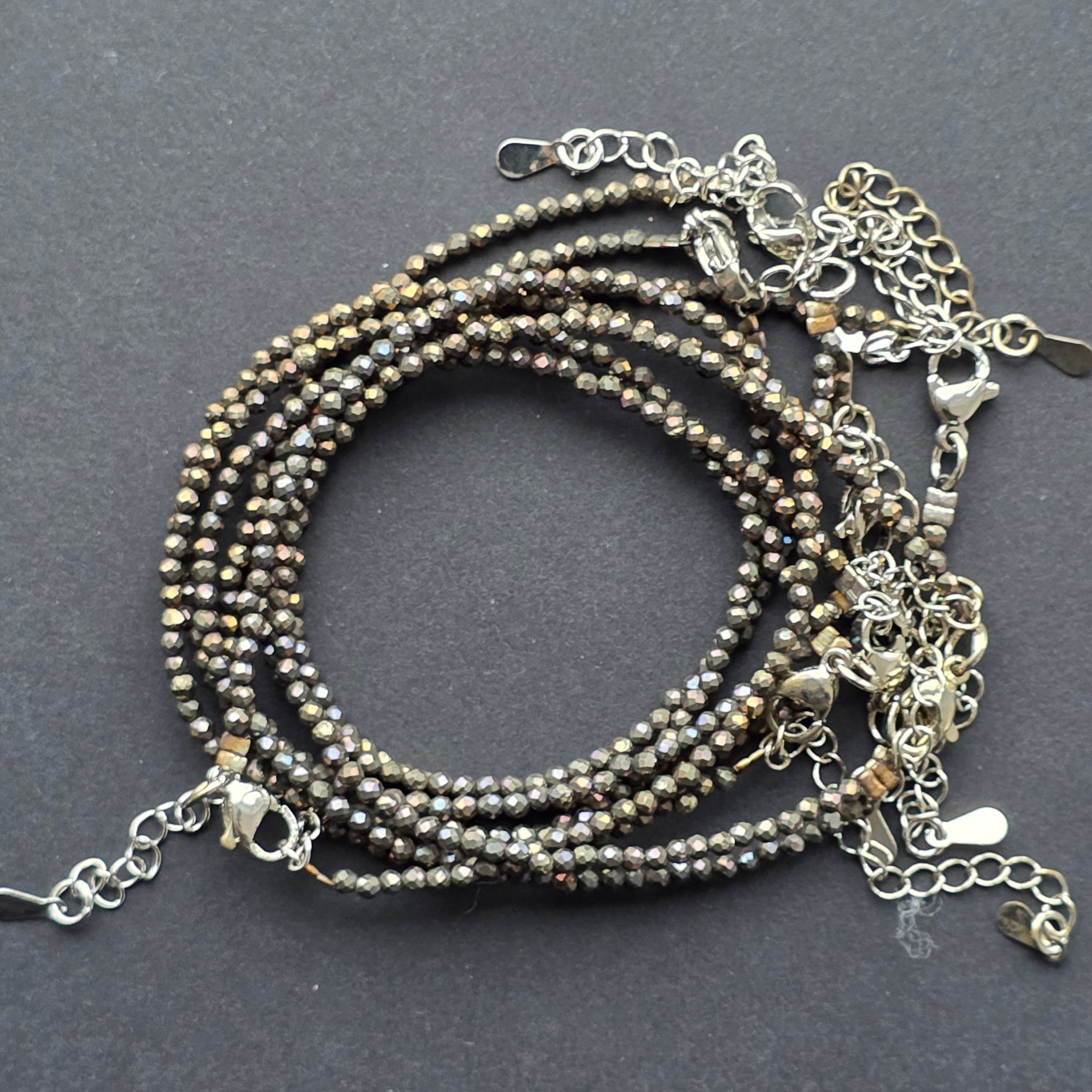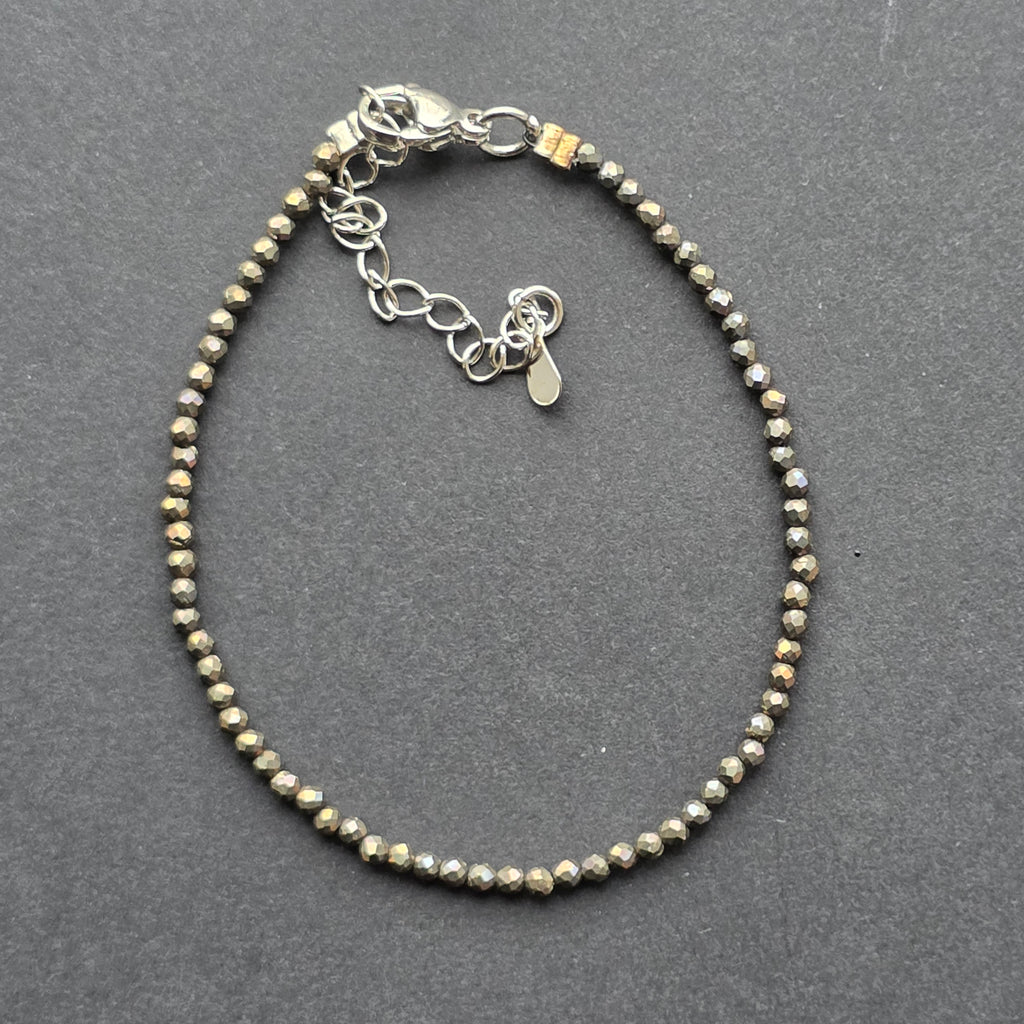 În această brățară fină, mărgelele de pirita par să surprindă esența focului metalic: scântei aurii, reflexe reci și calde în același timp, o lumină interioară care pulsează discret la fiecare mișcare a mâinii. Fațetele minuscule ale mărgelelor de 2 mm transformă pirita într-o dantelă strălucitoare, elegantă și subtilă.