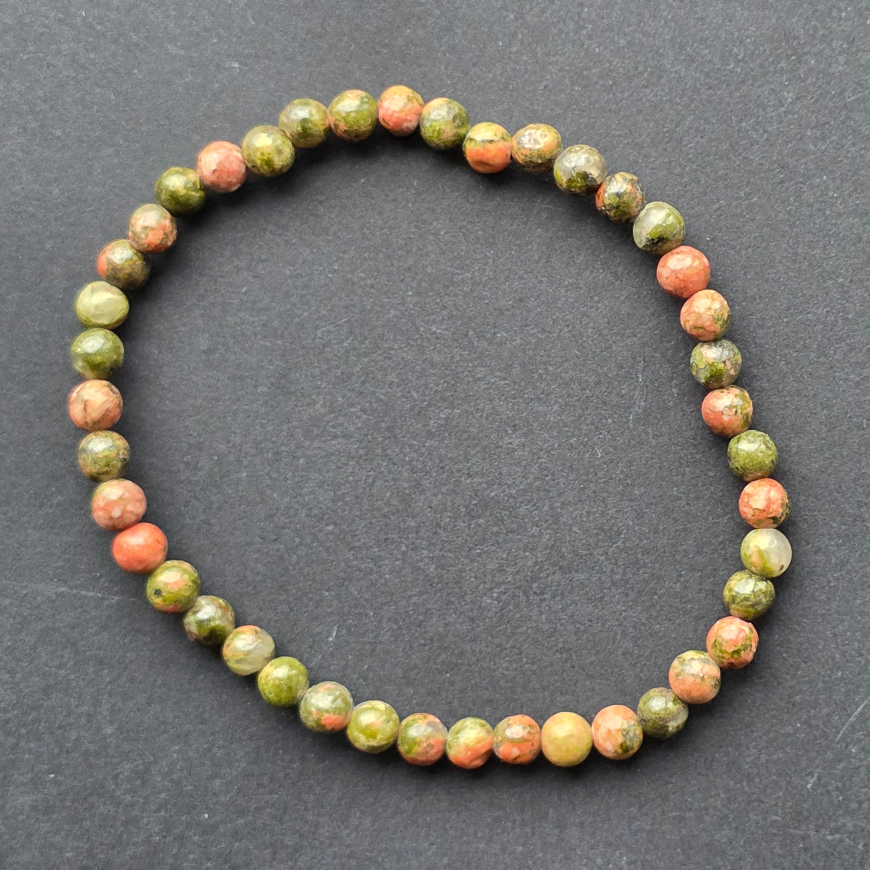 Brățara din unakit este o armonie subtilă între două culori ale naturii: verdele organic, calm și rotunjit, și tonurile cărămizii ale feldspatului roz-oranj, care par să lumineze fiecare mărgea. Împreună, creează o textură mozaicată, autentică, foarte ușor de recunoscut și îndrăgită de colecționarii de pietre naturale.