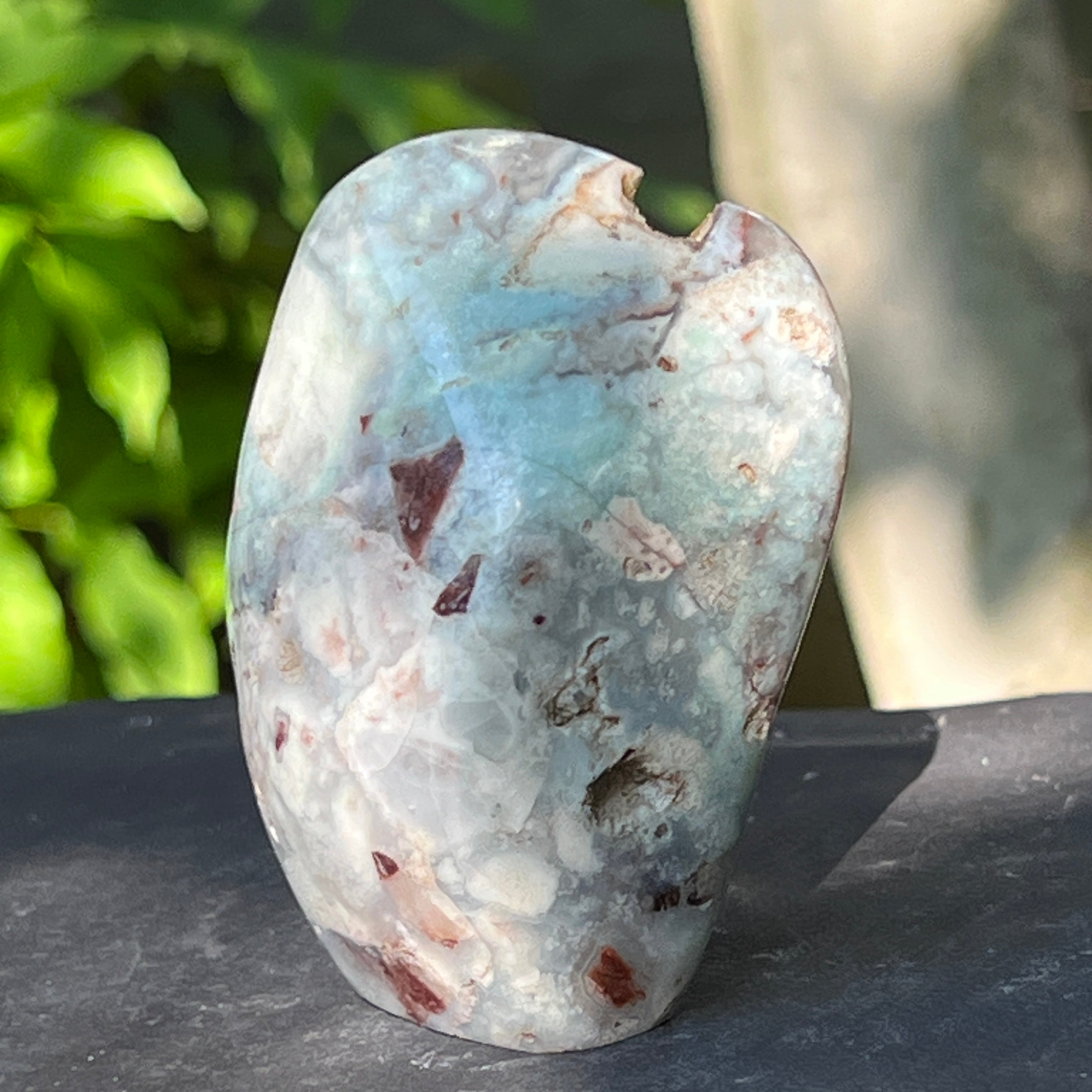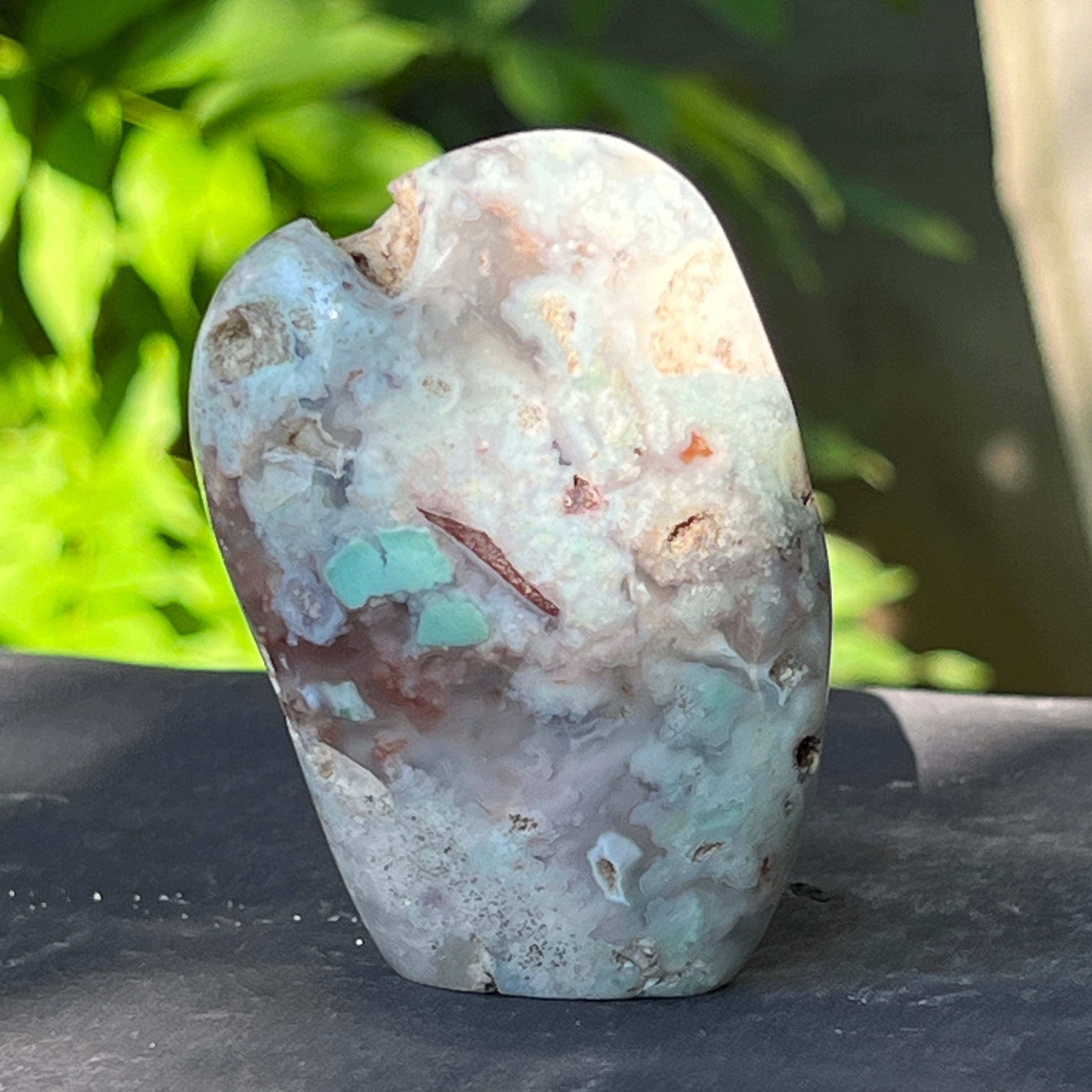 Είναι μια φυσική, αμετάβλητη μορφή, ενός χρωμιφερίρ Χαλέγον - ένα δύσκολο ορυκτό για να βρει αποκλειστικά από τη Ζιμπάμπουε και εκτιμάται για το ζωντανό χρώμα του, το οποίο δεν προέρχεται από το νικέλιο (όπως στο Crisopraz), αλλά από το χρωμίου που παλεύει βαθιά στην κρυσταλλική του δομή. Σε αυτή την ειδική παραλλαγή, τα μπλε και τα πράσινα ένθετα δημιουργούν ένα συναρπαστικό χρωματικό παιχνίδι, με ομαλές μεταβάσεις μεταξύ ημιδιαφανών και αδιαφανών, μεταξύ πυκνών και αεριζόμενων.