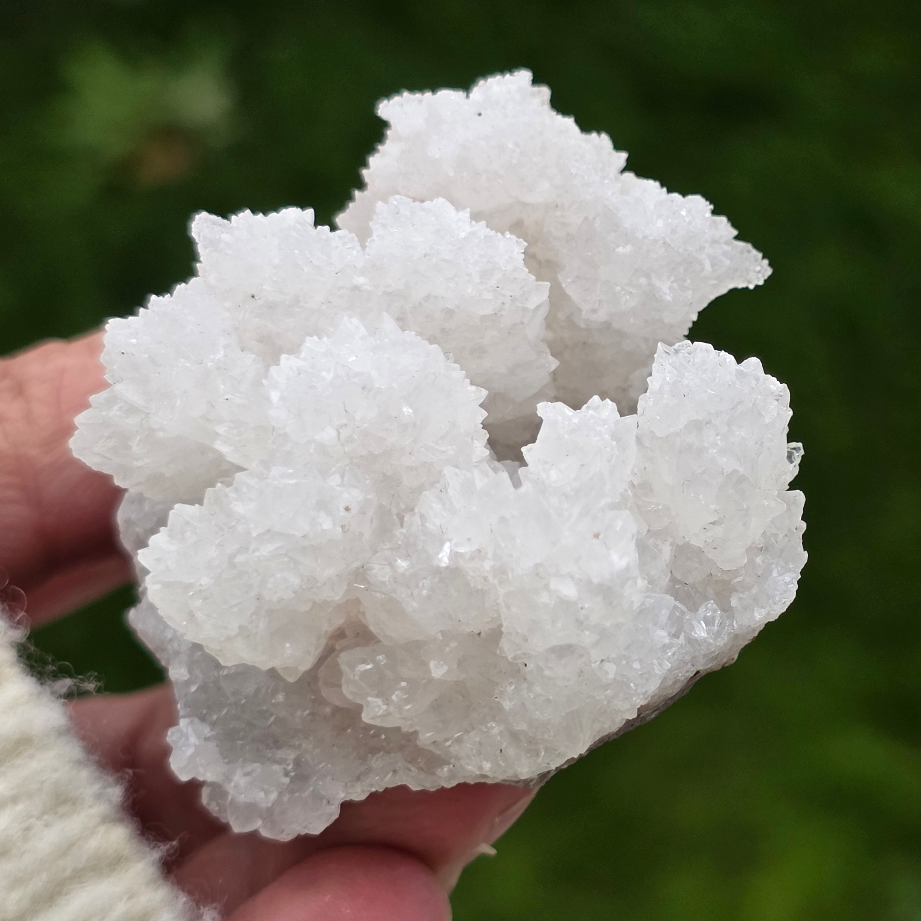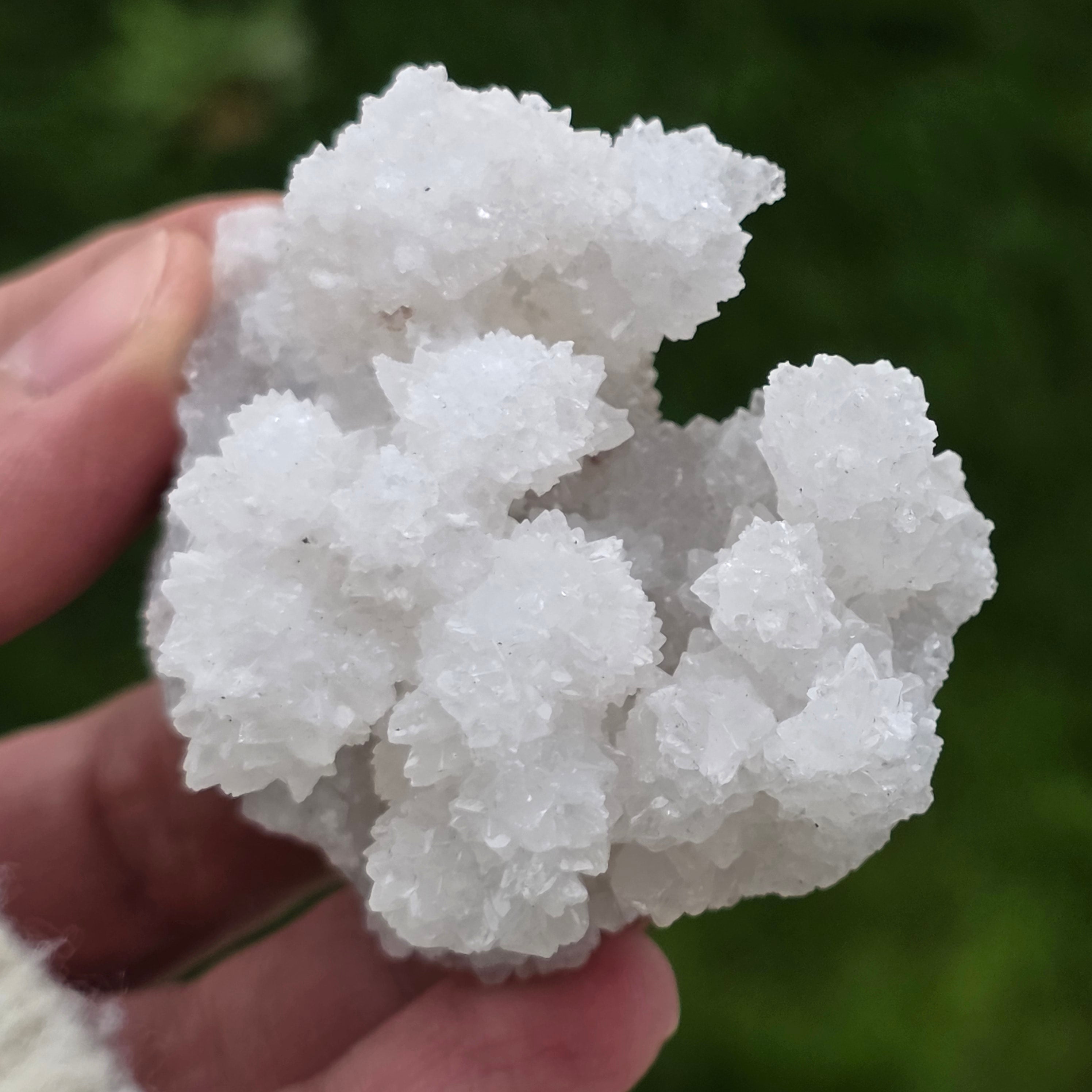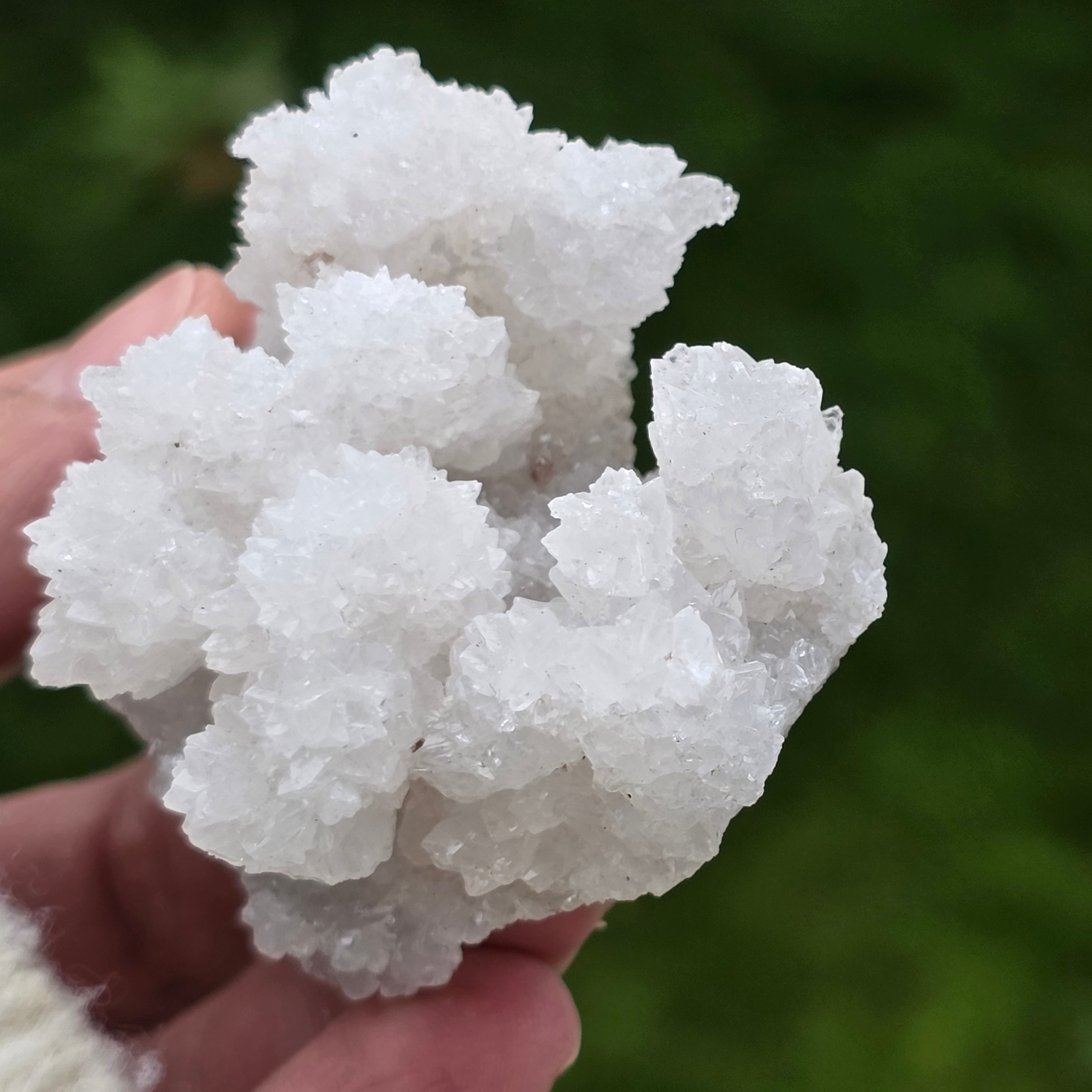 Cristalele sunt dispuse în structuri neregulate, rotunjite, cu suprafețe ușor sclipitoare, amintind de formațiuni întâlnite în interiorul peșterilor. Textura bogată și volumul bine definit conferă fiecărui exemplar un caracter autentic și expresiv, foarte apreciat în colecțiile de minerale și ca piesă decorativă naturală.