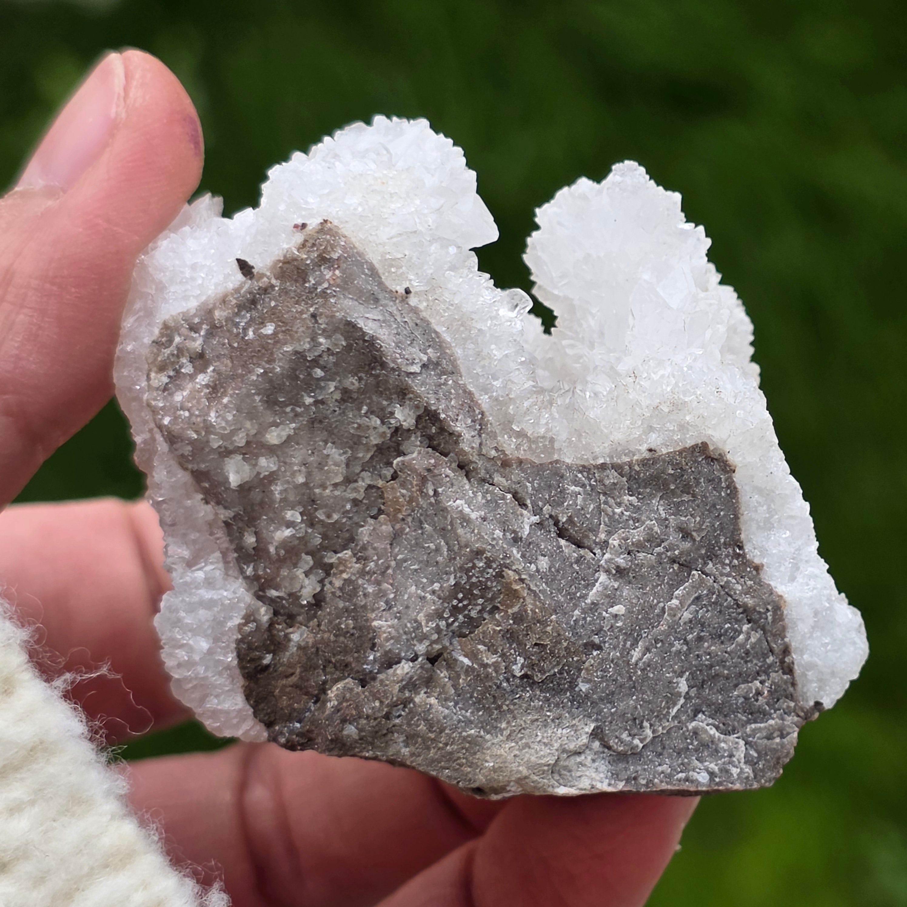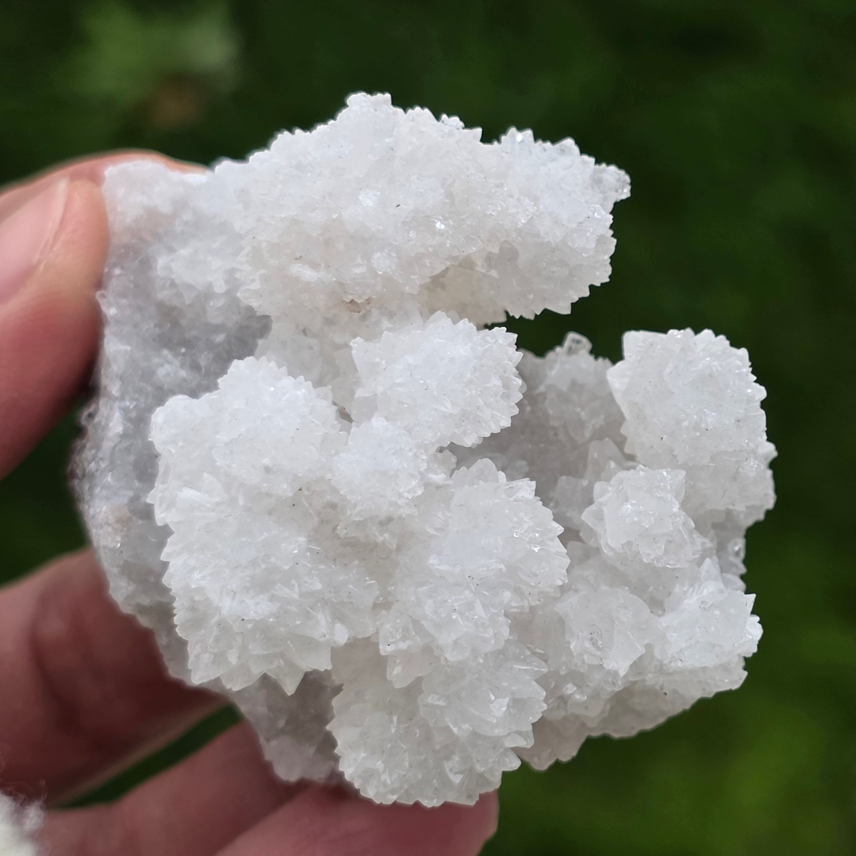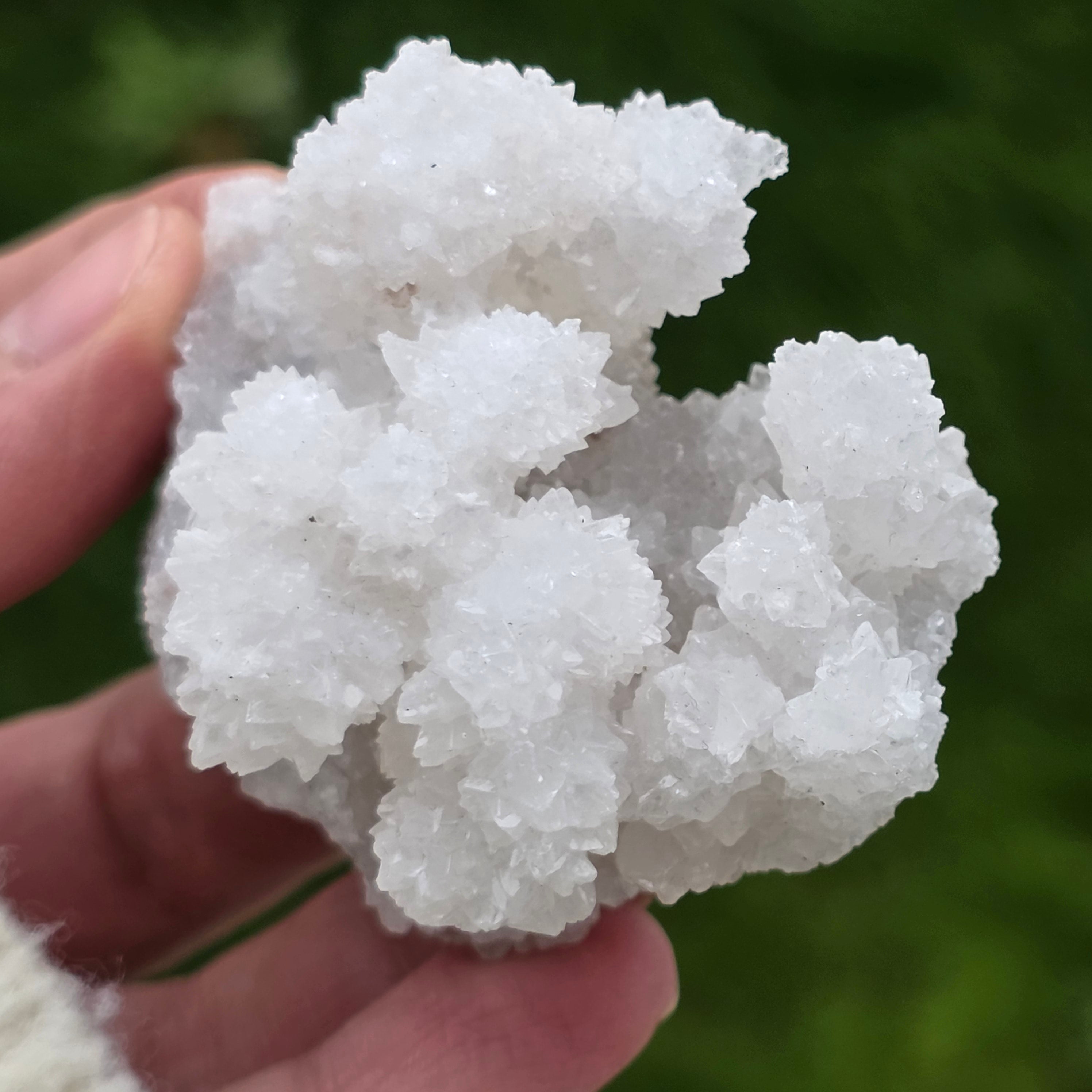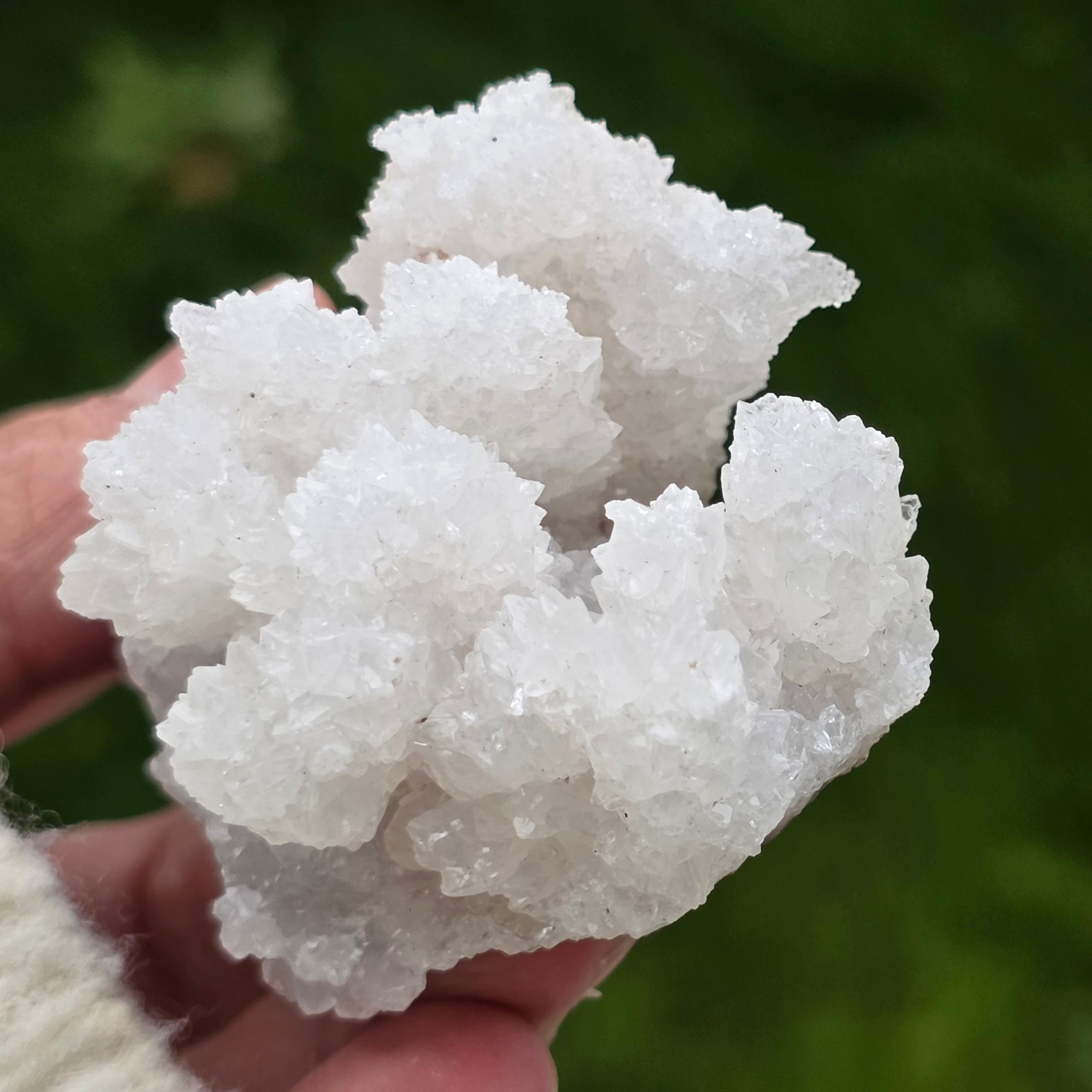 Cristalele sunt dispuse în structuri neregulate, rotunjite, cu suprafețe ușor sclipitoare, amintind de formațiuni întâlnite în interiorul peșterilor. Textura bogată și volumul bine definit conferă fiecărui exemplar un caracter autentic și expresiv, foarte apreciat în colecțiile de minerale și ca piesă decorativă naturală.