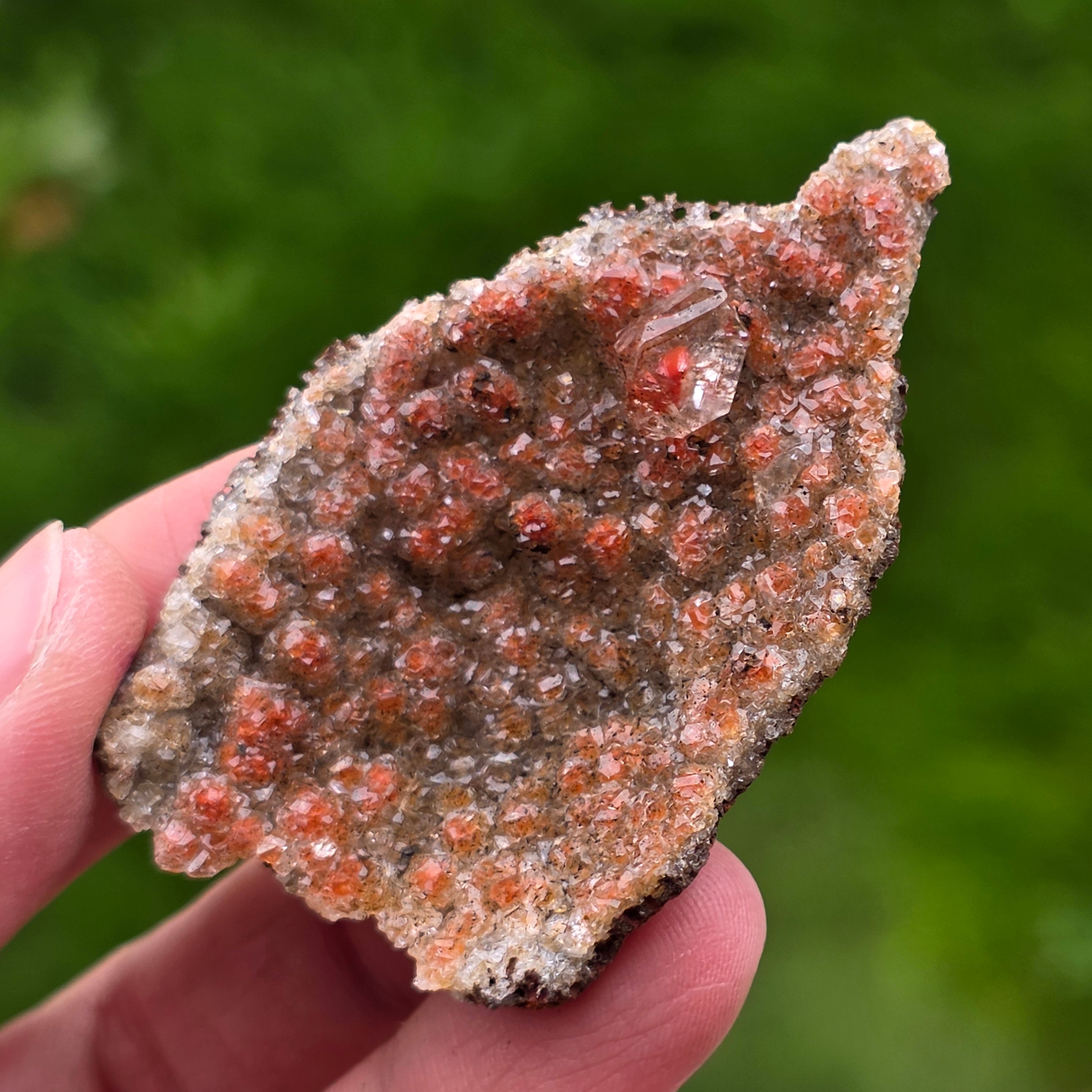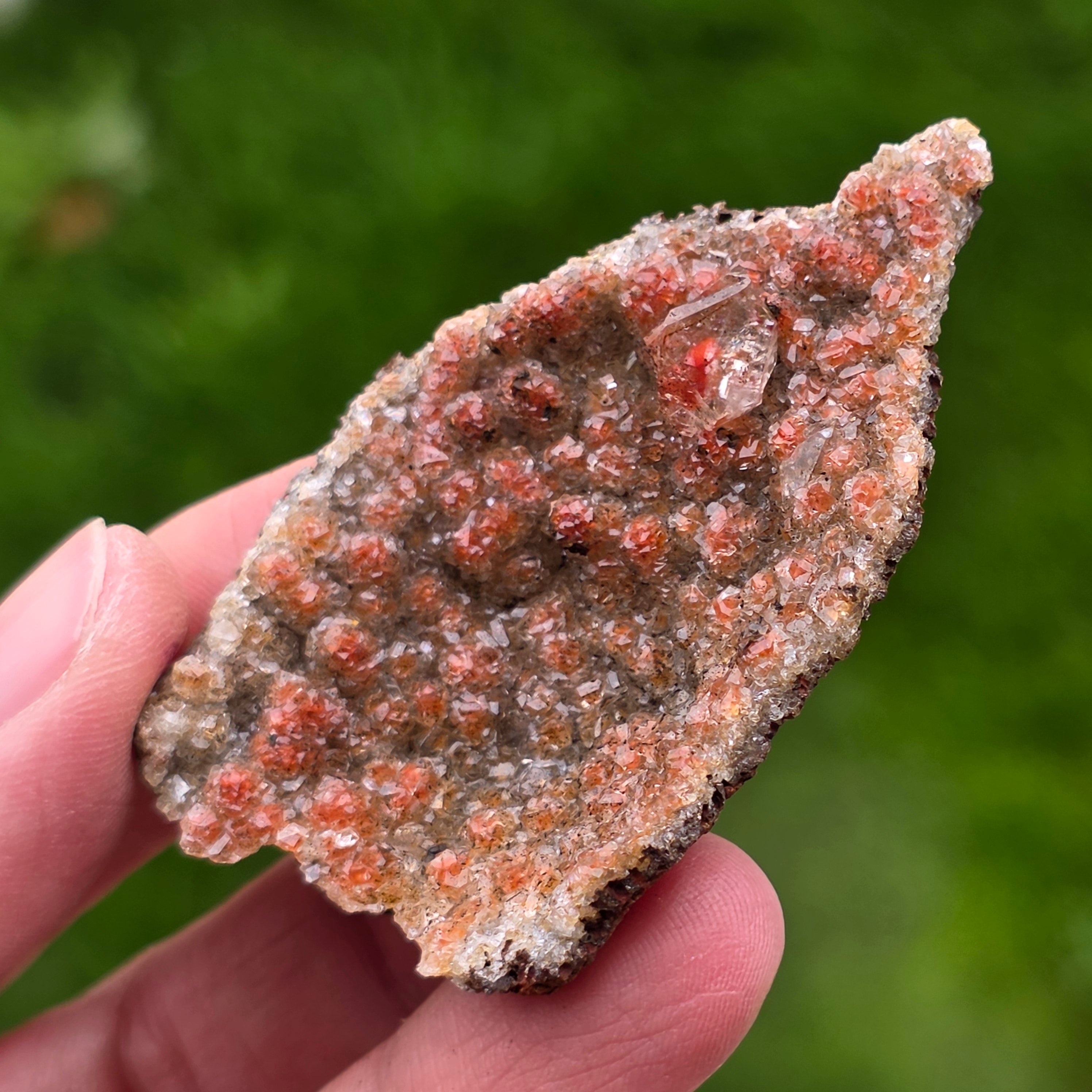 Cristalele de calcit prezintă habitul specific numit „diamond calcite”, caracterizat prin terminații bine definite și fețe strălucitoare, care reflectă lumina într-un mod subtil, dar expresiv. Dispunerea compactă a cristalelor creează o suprafață sclipitoare, cu textură bogată, fiecare piesă fiind diferită ca formă, intensitate a culorii și distribuție a cristalelor.