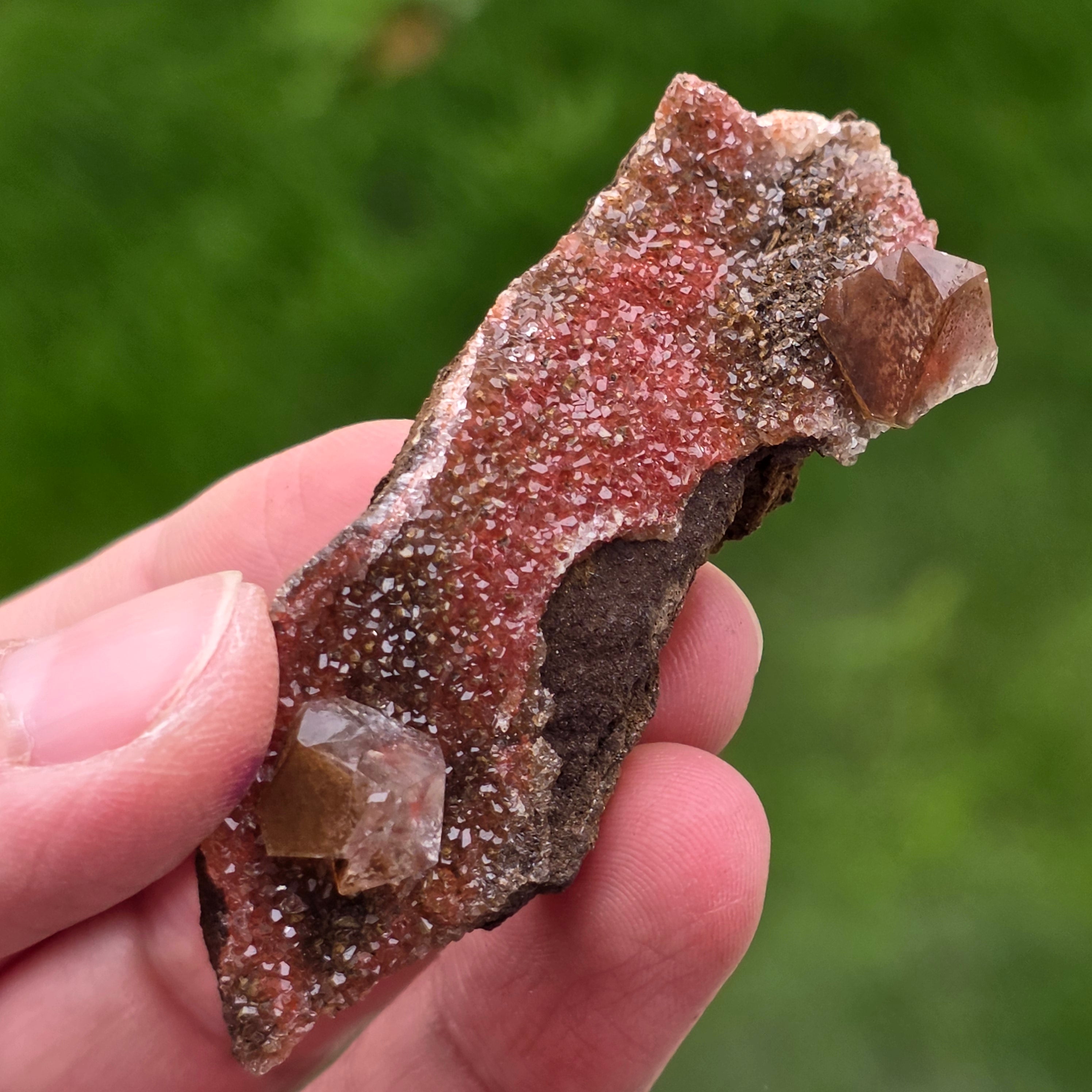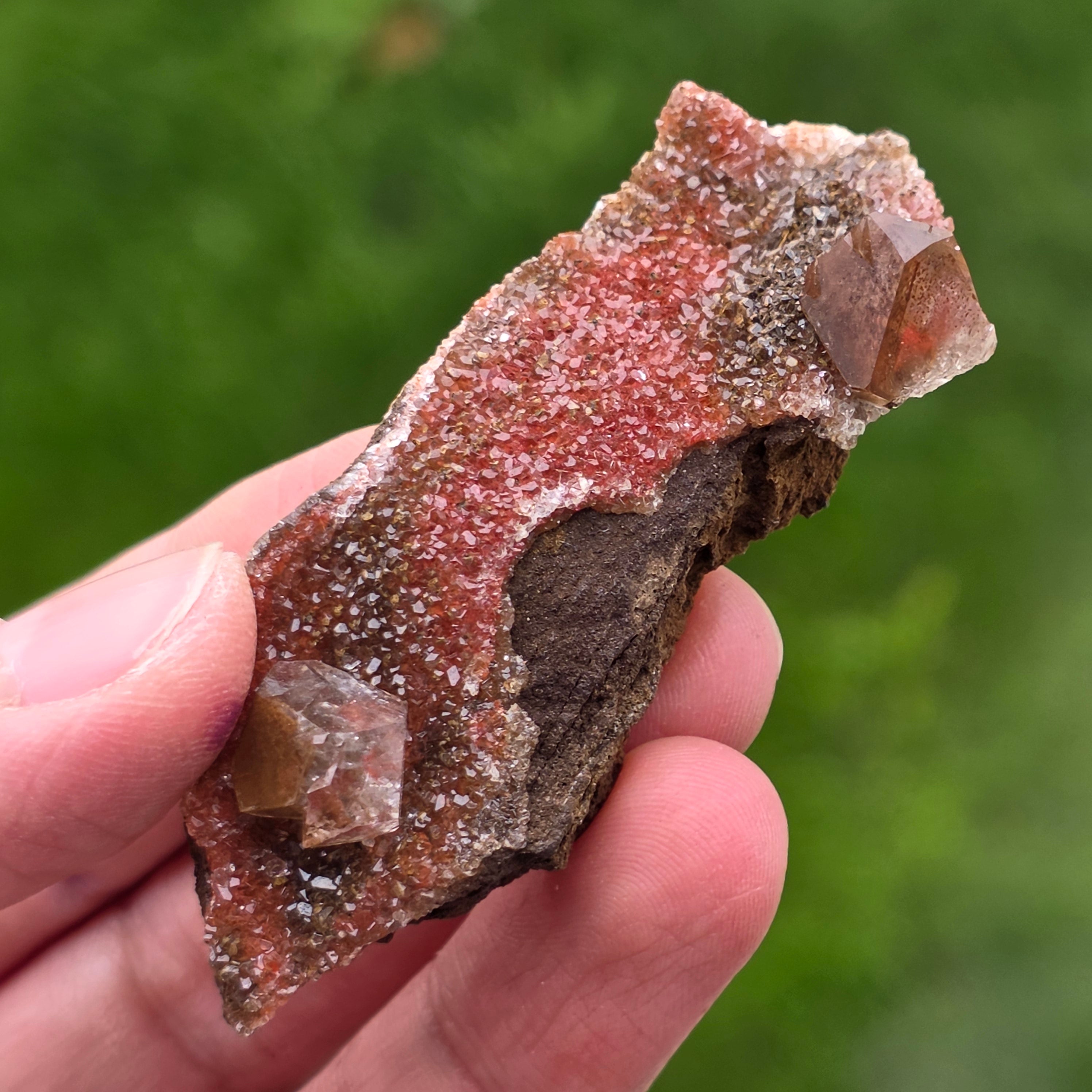 Cristalele de calcit prezintă habitul specific numit „diamond calcite”, caracterizat prin terminații bine definite și fețe strălucitoare, care reflectă lumina într-un mod subtil, dar expresiv. Dispunerea compactă a cristalelor creează o suprafață sclipitoare, cu textură bogată, fiecare piesă fiind diferită ca formă, intensitate a culorii și distribuție a cristalelor.