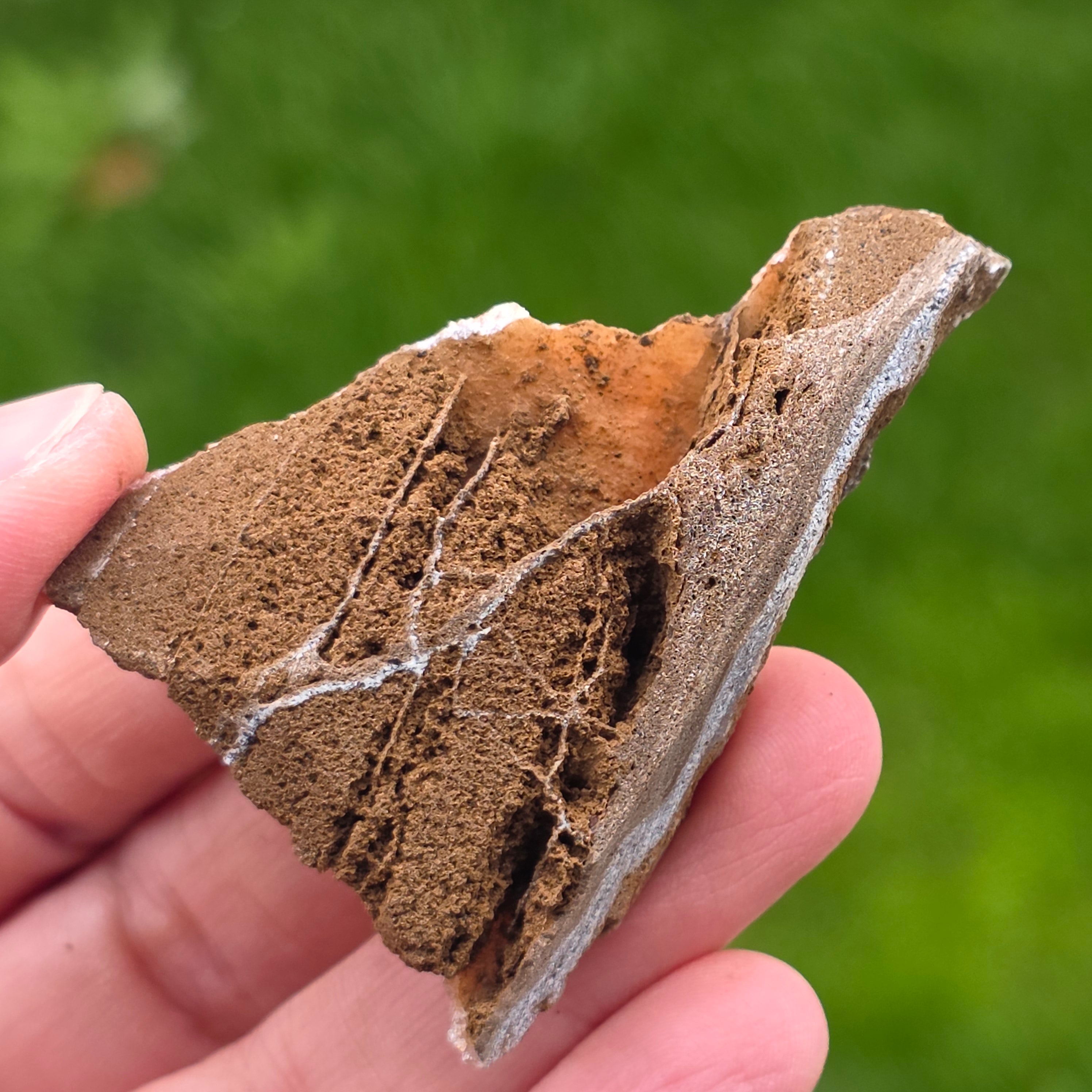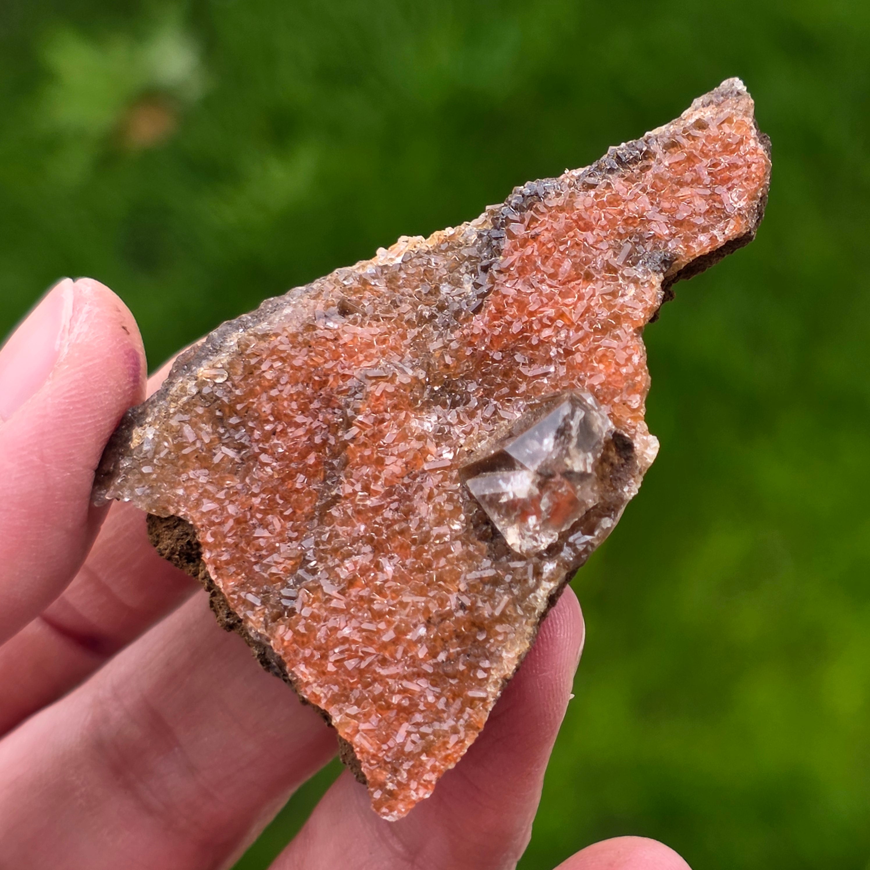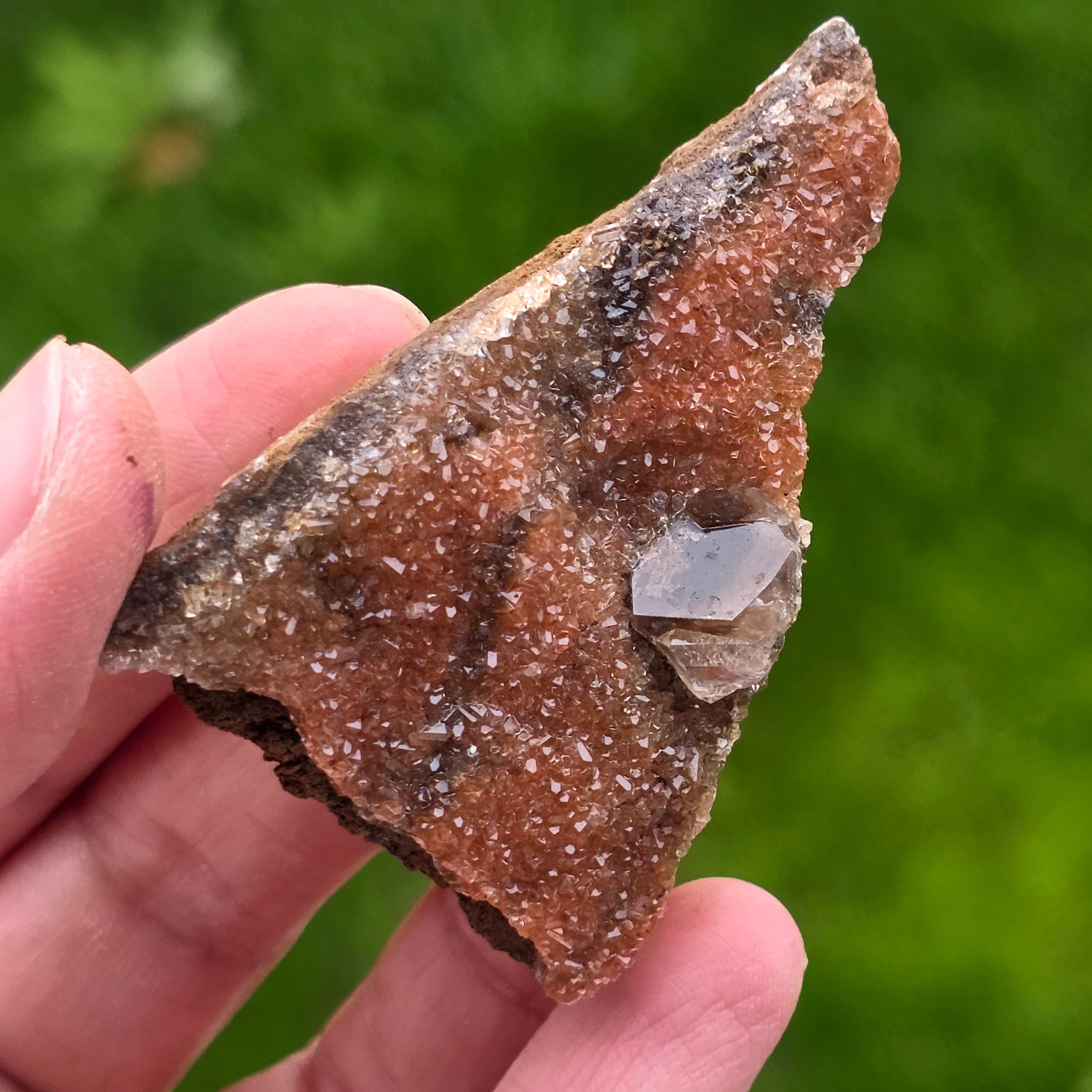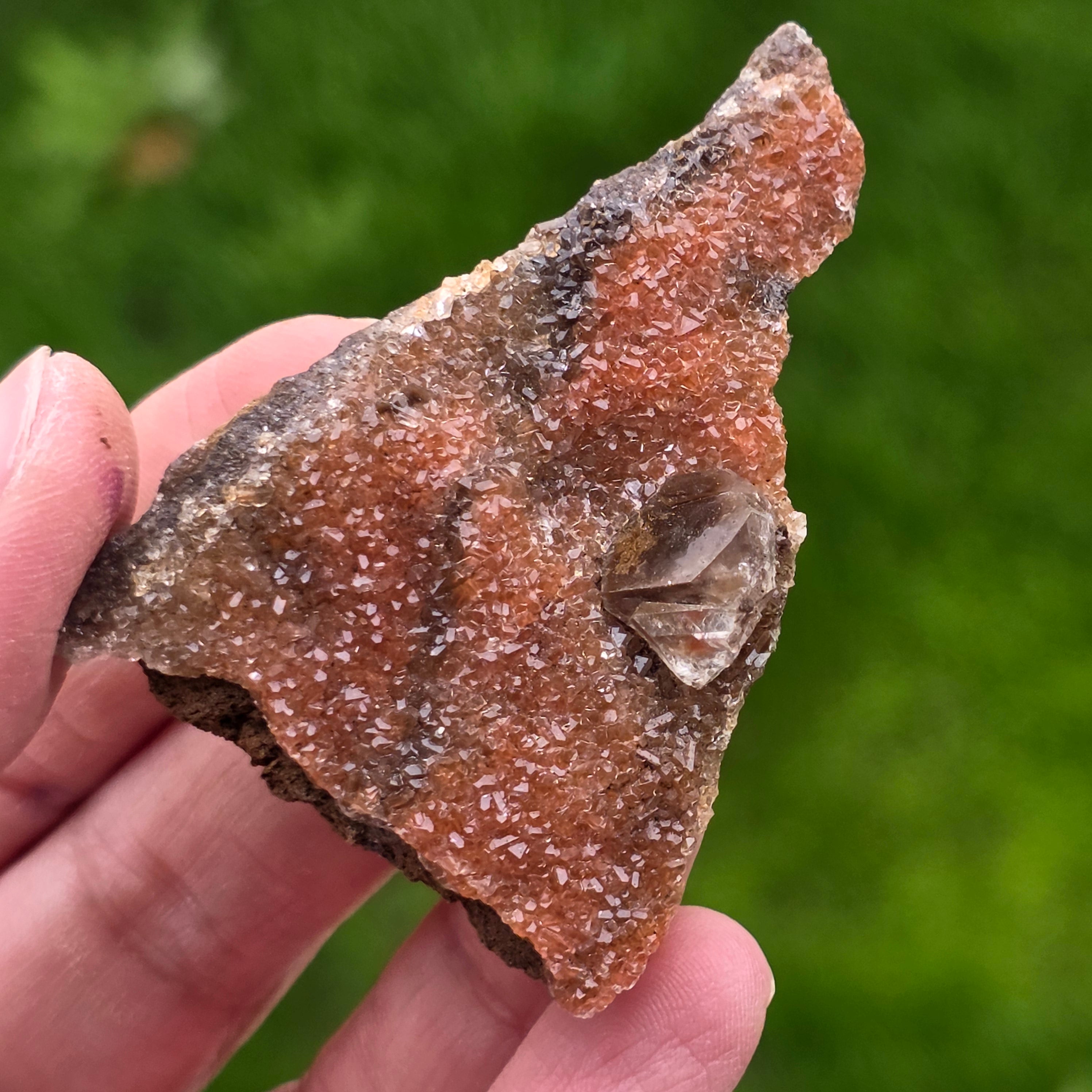 Cristalele de calcit prezintă habitul specific numit „diamond calcite”, caracterizat prin terminații bine definite și fețe strălucitoare, care reflectă lumina într-un mod subtil, dar expresiv. Dispunerea compactă a cristalelor creează o suprafață sclipitoare, cu textură bogată, fiecare piesă fiind diferită ca formă, intensitate a culorii și distribuție a cristalelor.
