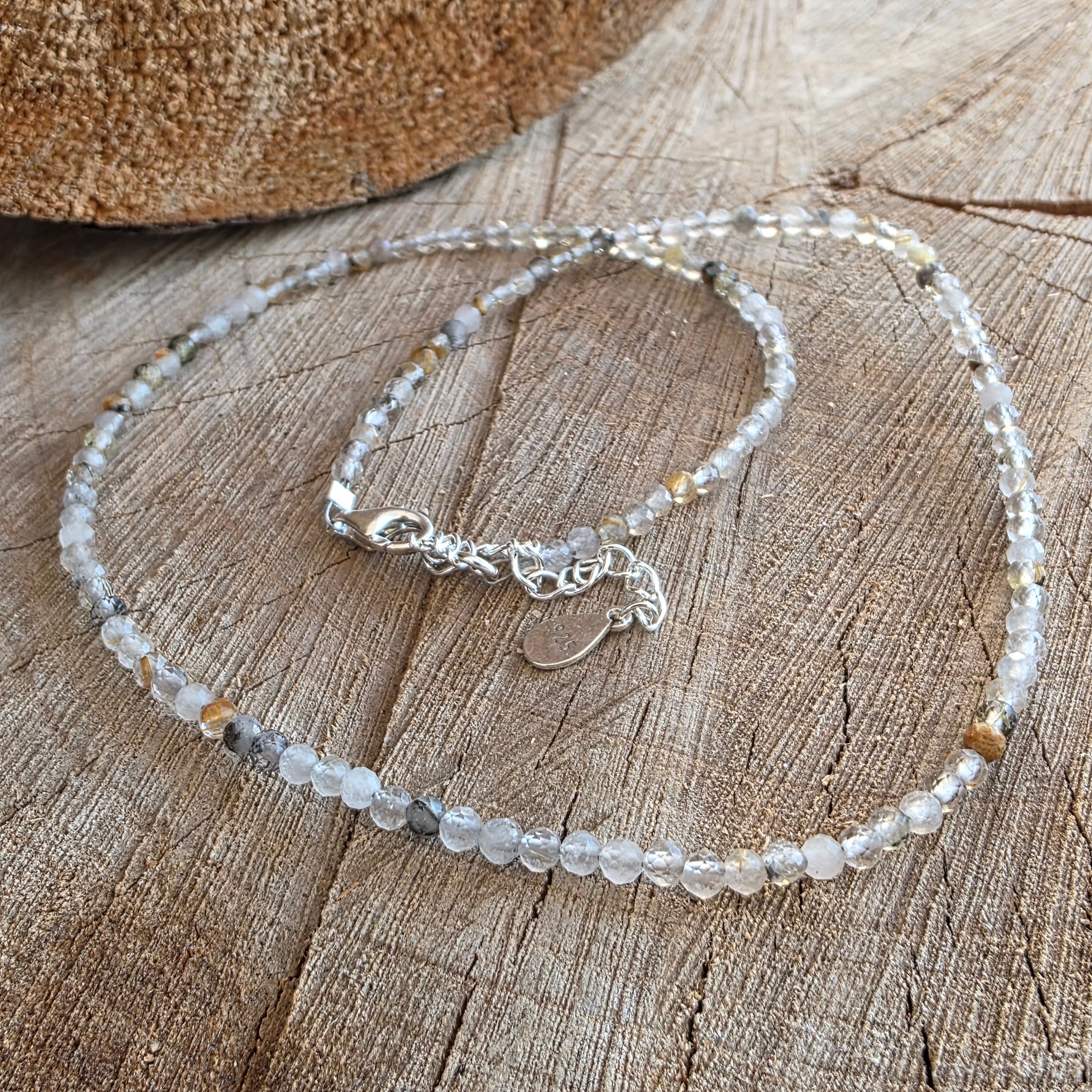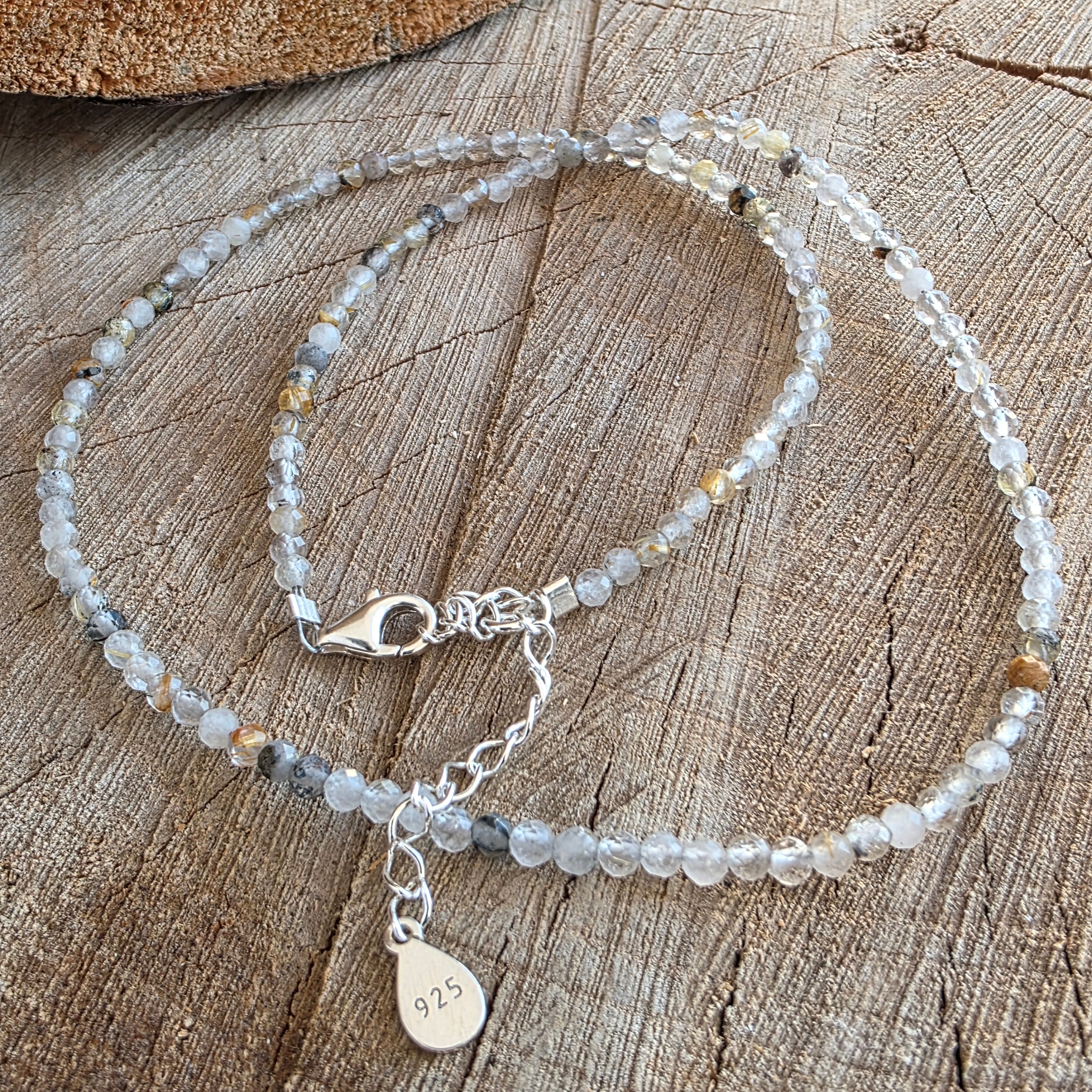 Το νήμα αποτελείται από χάντρες που κατασκευάζονται από 3 mm, καθένας από αυτούς κρατώντας έναν ολόκληρο κόσμο μέσα. Αυτή η σπάνια ποικιλία χαλαζία περιέχει λεπτές βελόνες στυλοβέλους - χρυσά νήματα ή χαλκό χαλκό, όπως τα ηλιακά νήματα που συνδέονται με τον κρύσταλλο. Τα διακριτικά του αντανακλαστικά πιάσουν το φως σε λεπτές γωνίες, δημιουργώντας μια εντύπωση ζωντανής αλλά ήρεμης κίνησης.