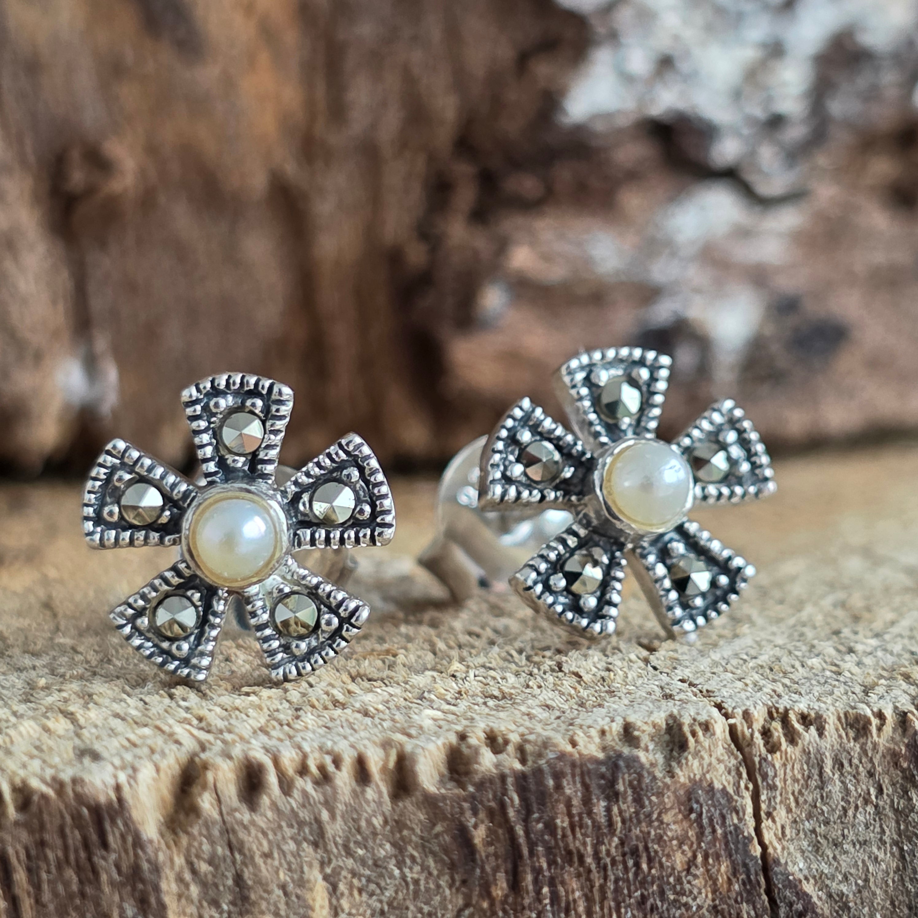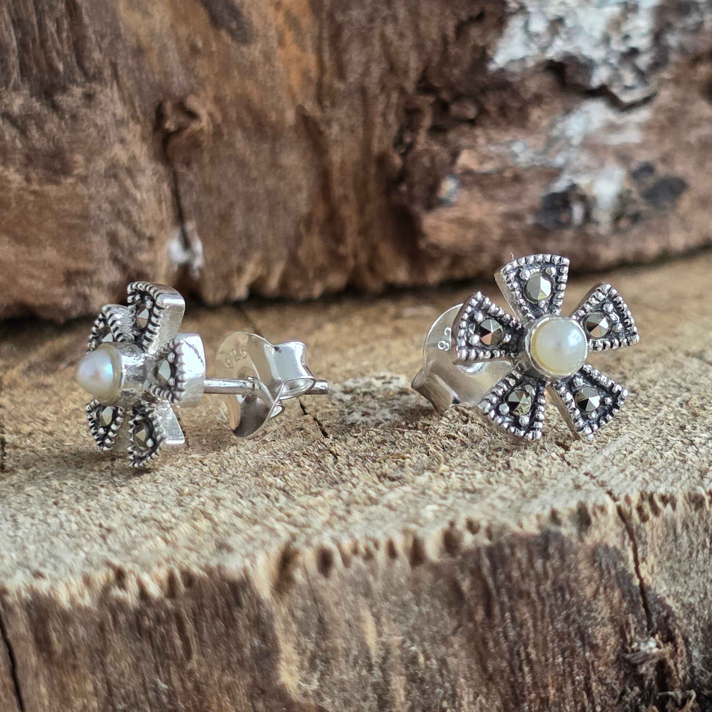 Acești cercei din argint 925 îmbină rafinamentul clasic al perlei cu farmecul atemporal al marcasitului, într-un design inspirat din bijuteriile de epocă.