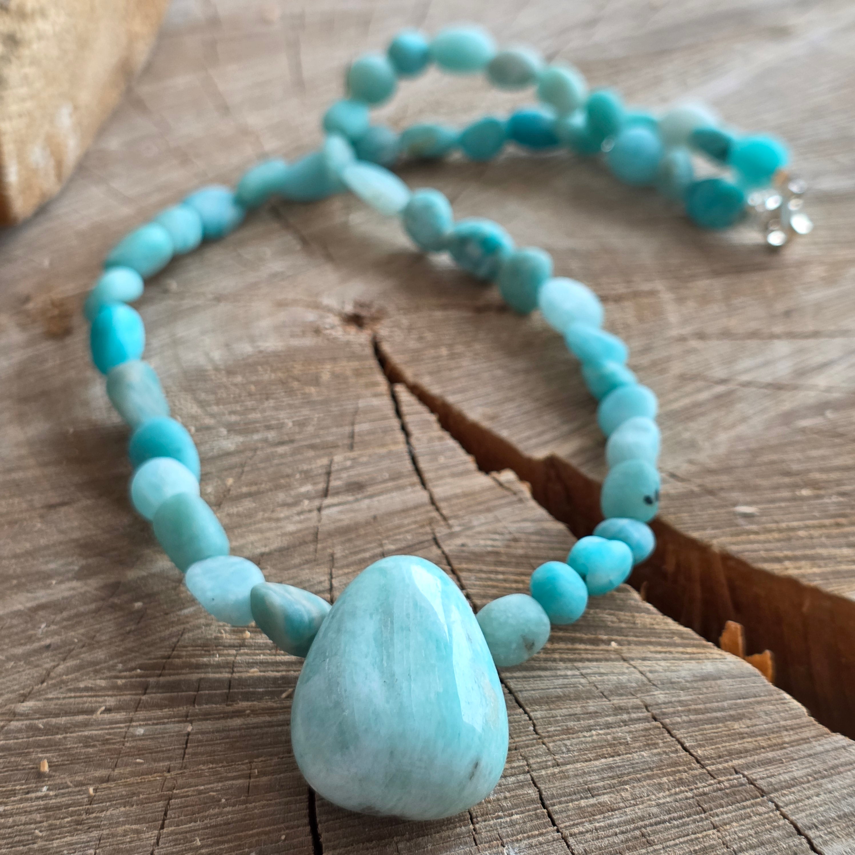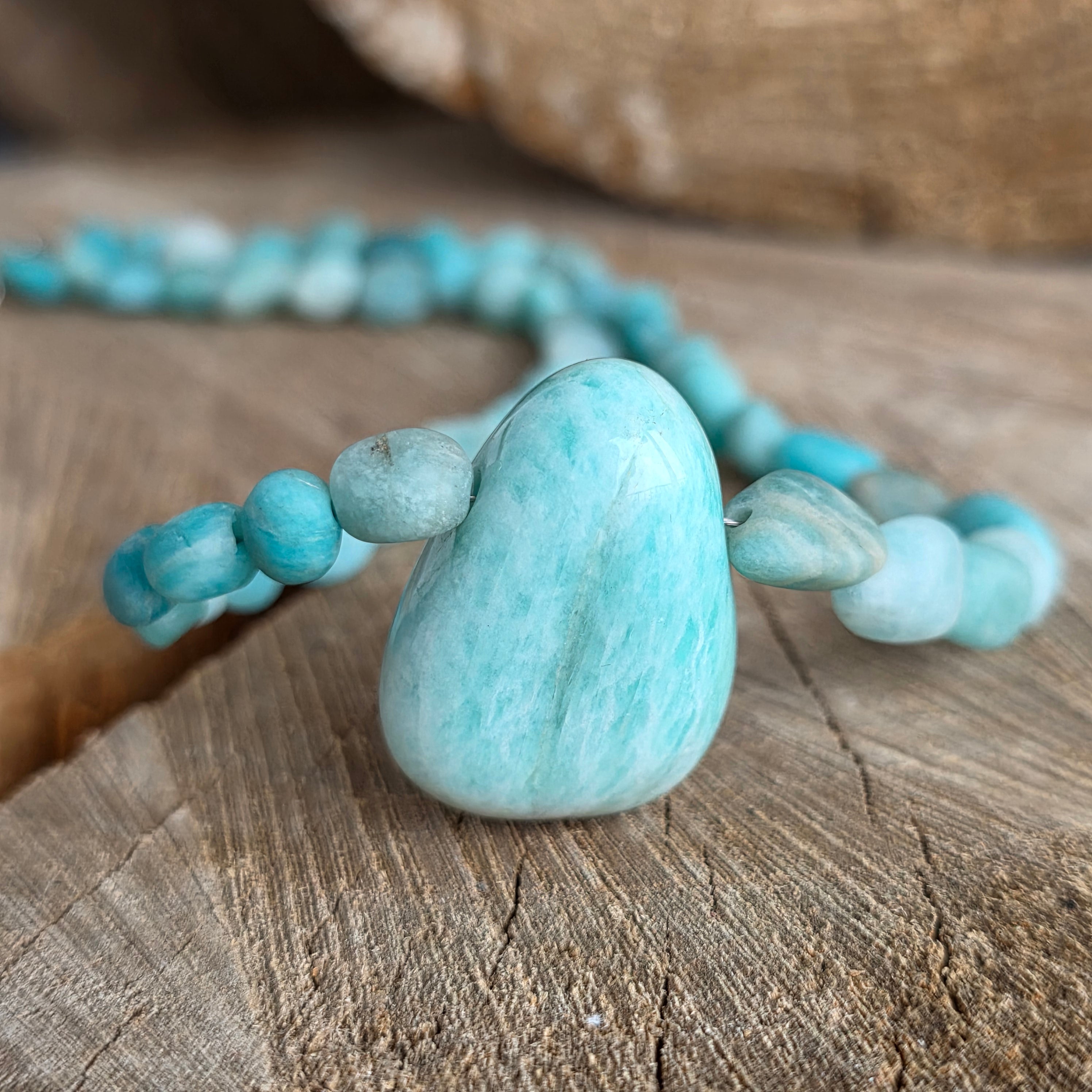 Ένα κολιέ με τη δόνηση των ιερών ποταμών και του νεφρού του ουρανού - ισχυρό, καθαρό και φορτωμένο. Τα φυσικά σφαιρίδια Amazonic, με διάμετρο μεταξύ 8 και 10 mm, αποκαλύπτουν αποχρώσεις των ακατέργαστων-μπλε-πράσινων-μπλε, ζωγραφισμένων σε ατελείς και αυθεντικούς ρυθμούς.
