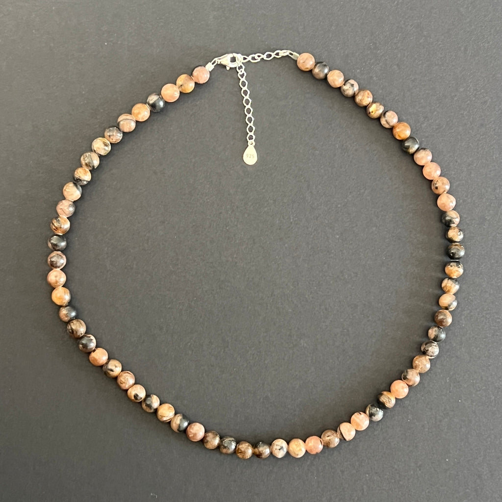Un colier care poartă în sine amprenta sacrului și a misterului. Chiastolitul, cunoscut și ca „piatra crucii”, dezvăluie în structura sa naturală un simbol ancestral al protecției și al legăturii cu divinul. Mărgelele de 6 mm împletesc tonuri calde de maro, gri și ocru, fiecare purtând crucea ascunsă în miezul pietrei, ca o pecete a echilibrului dintre lumină și întuneric.