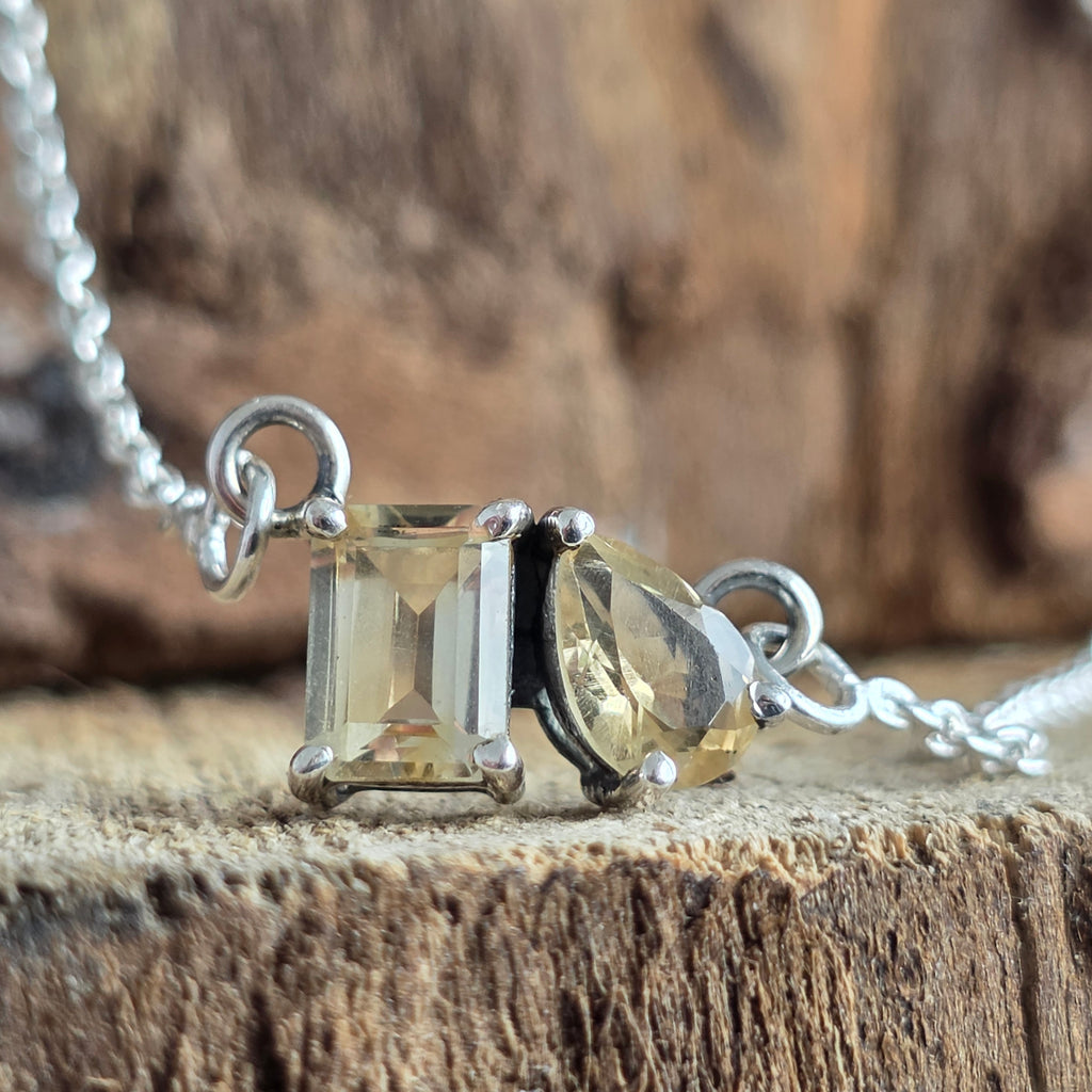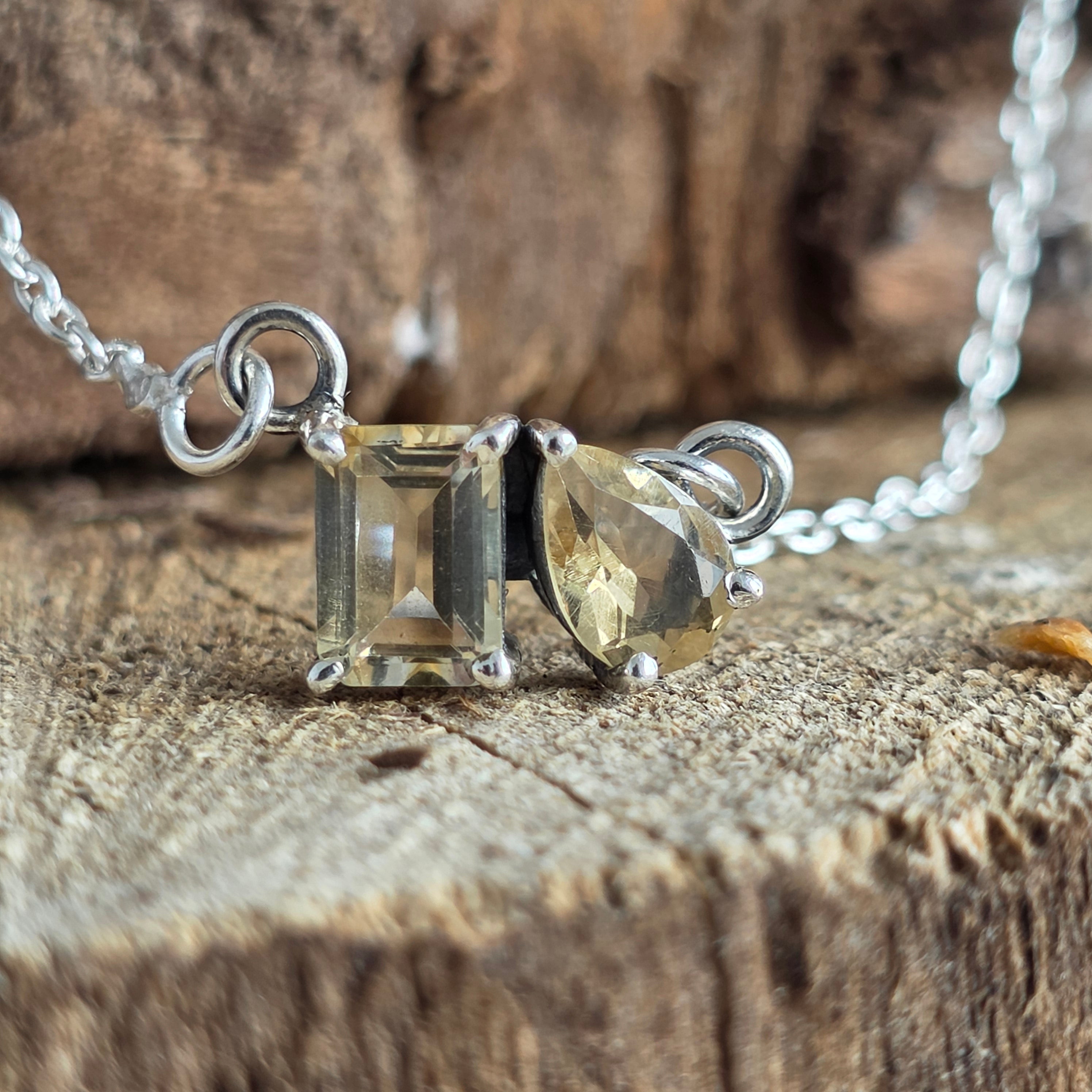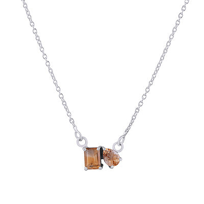 Un colier delicat din argint 925, decorat cu două pietre de citrin natural, una în formă dreptunghiulară și cealaltă pară, ce creează împreună o compoziție luminoasă și echilibrată.