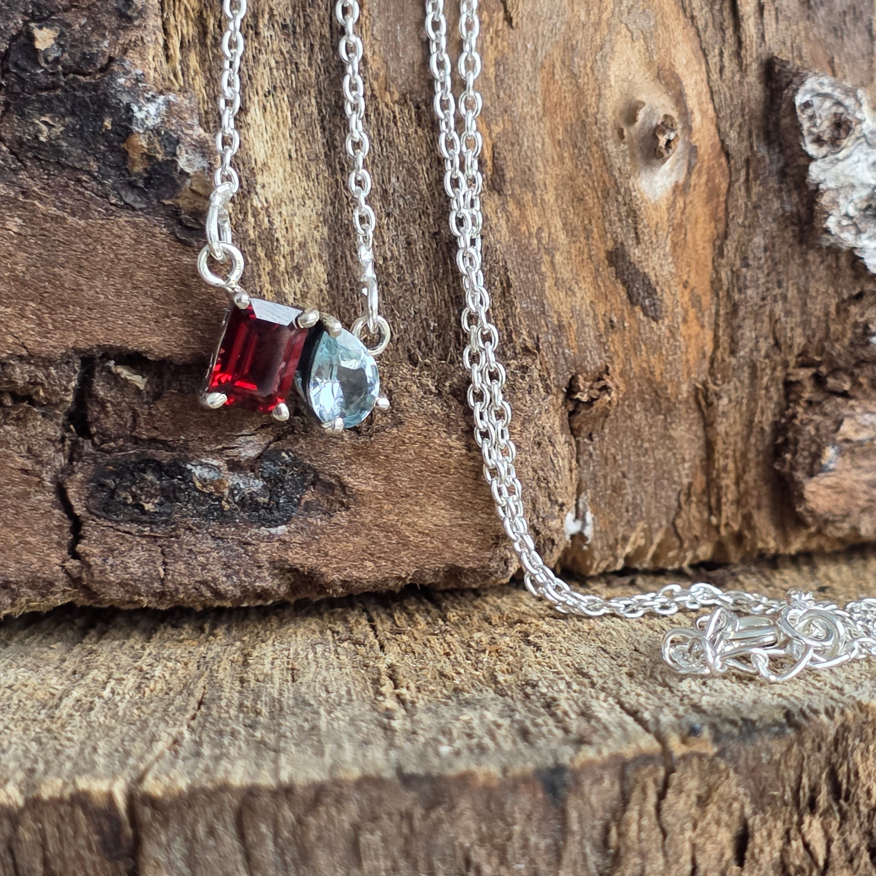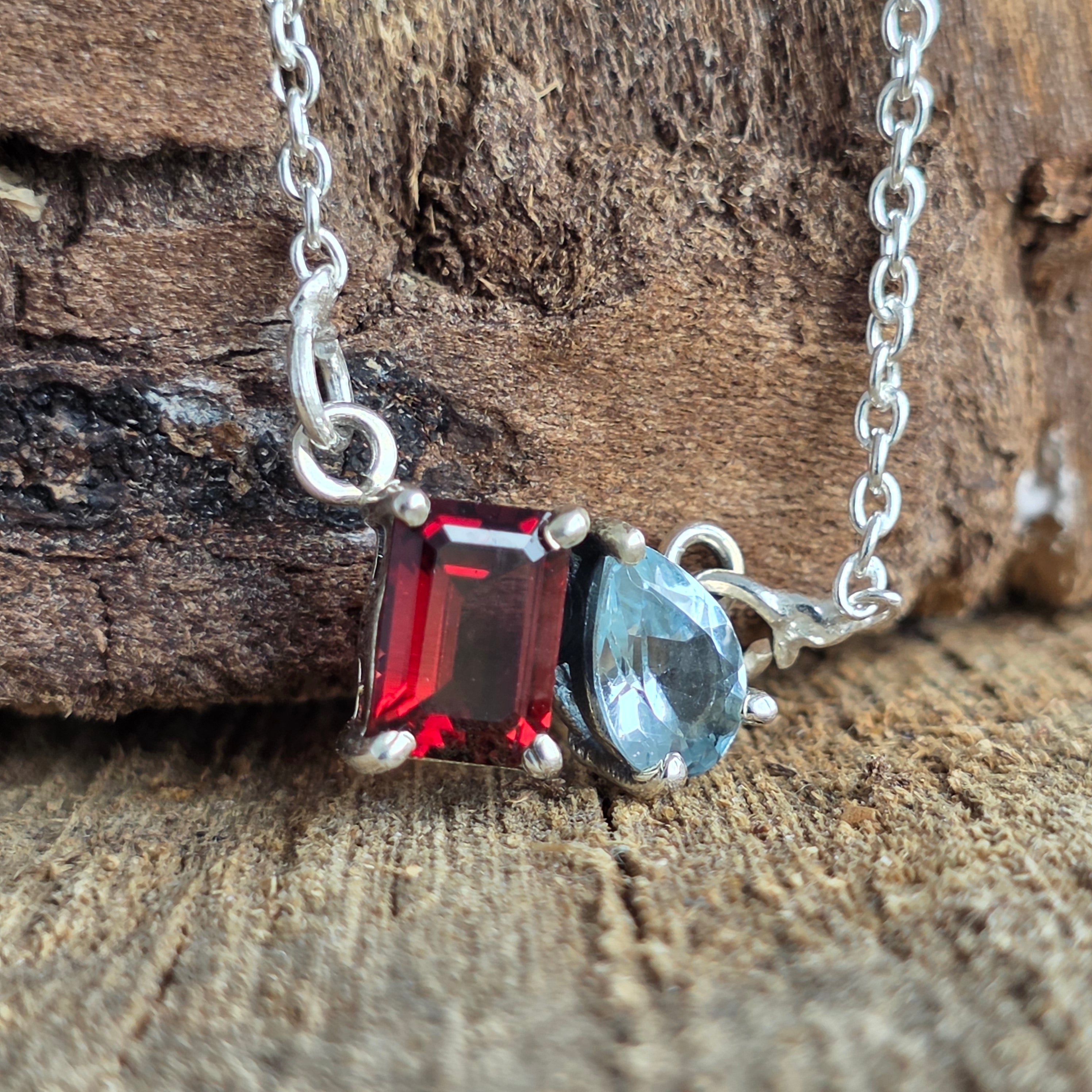 • Pietre: granat natural (roșu-rubiniu intens) și topaz albastru natural (nuanță sky blue)