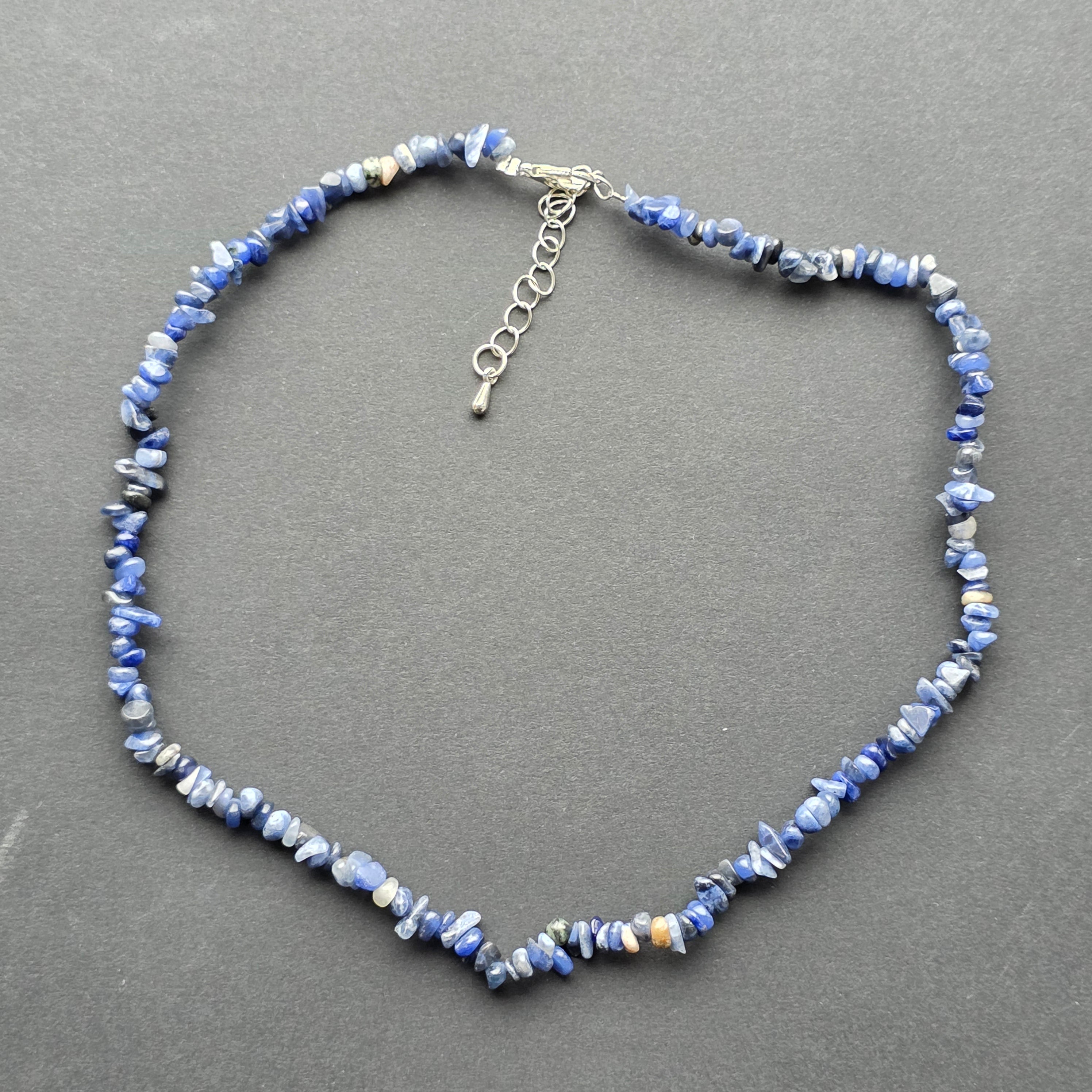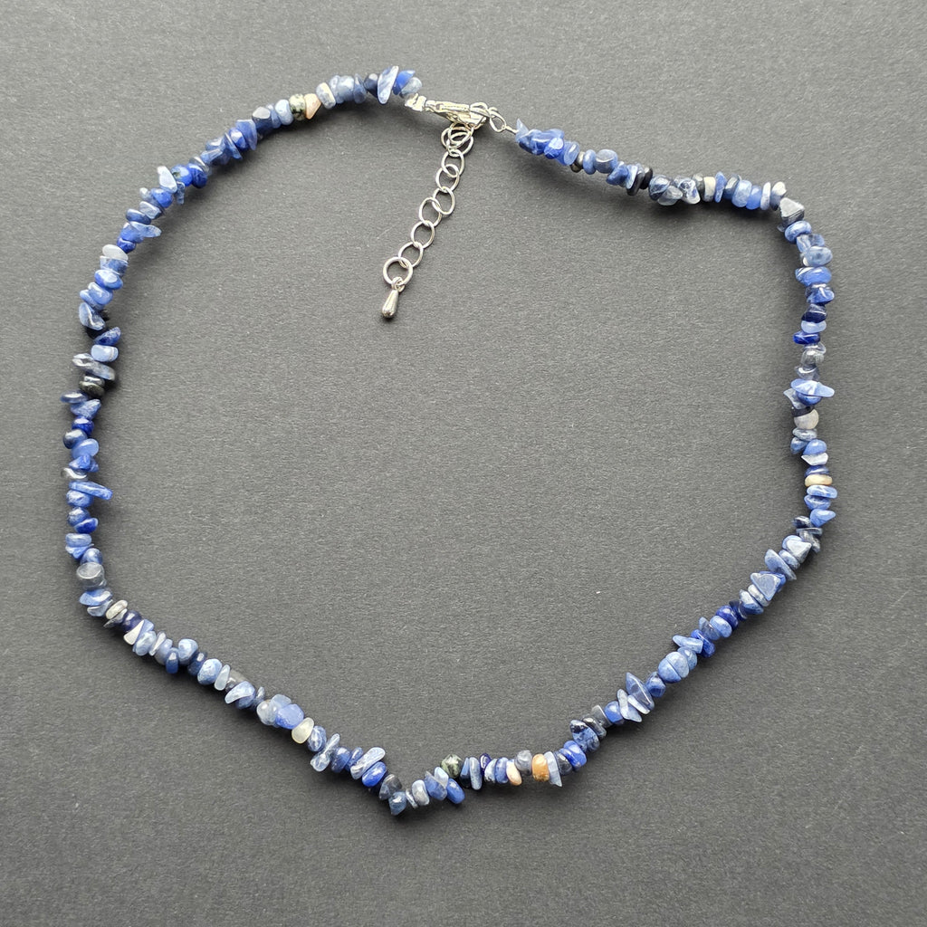Colier creat din sodalit natural, apreciat pentru albastrul său profund, presărat cu fire albe ce imită adesea textura norilor pe cerul nopții. Chipsurile neregulate, cu aspect organic, conferă piesei un aer boem și autentic, perfect pentru iubitorii de cristale naturale și designuri neșlefuite excesiv.