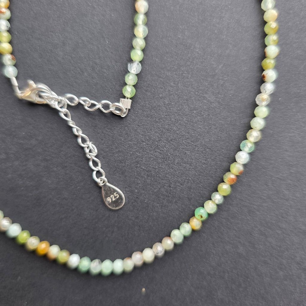 Un colier ce poartă lumina verii și tandrețea unui început nou. Crisoprazul, cu verdele său luminos și translucid, este o piatră a inimii deschise — un simbol al iubirii pure, al compasiunii și al reînnoirii sufletului. Mărgelele fațetate de 3 mm captează fiecare rază de lumină, transformând colierul într-o bijuterie vie, radiantă și delicată.