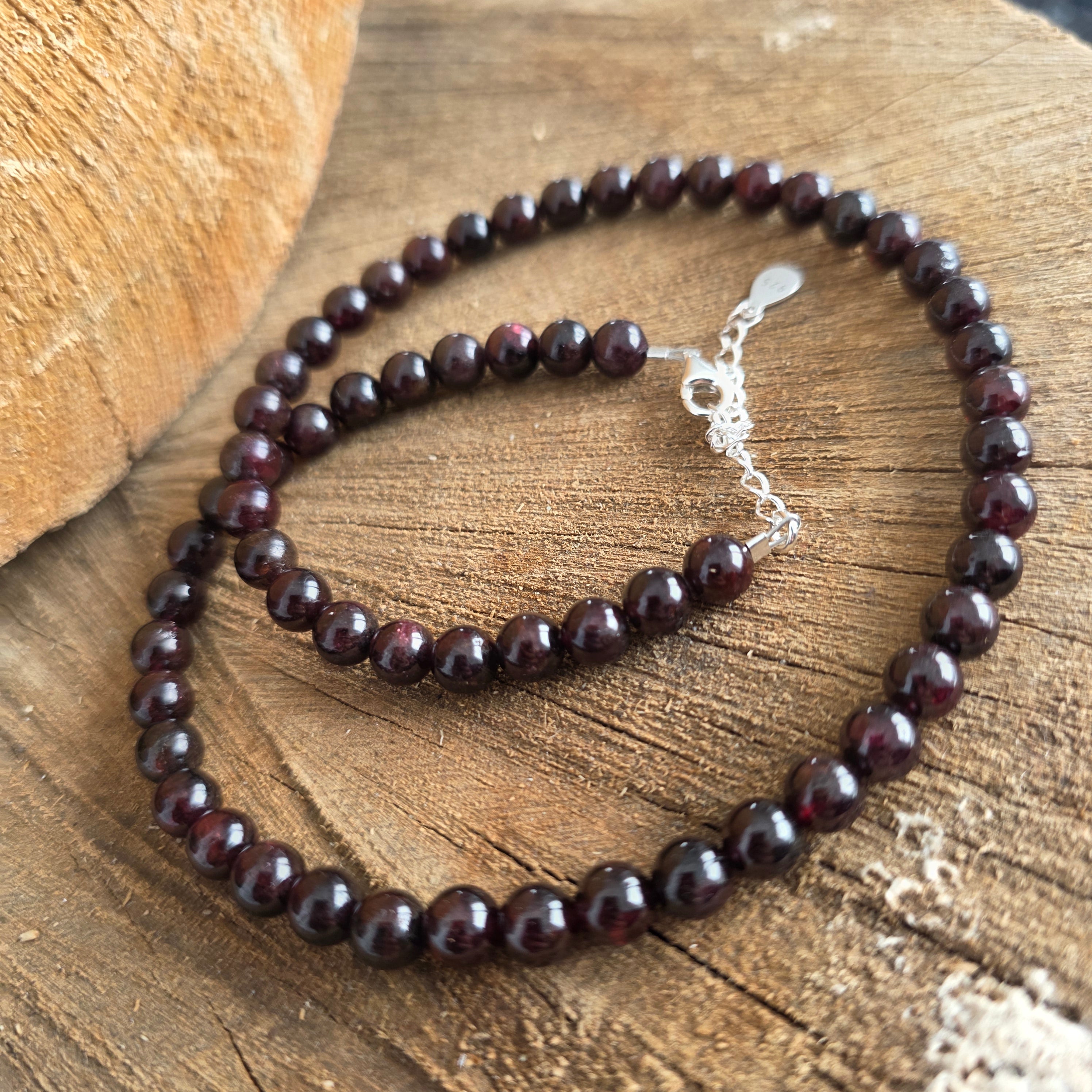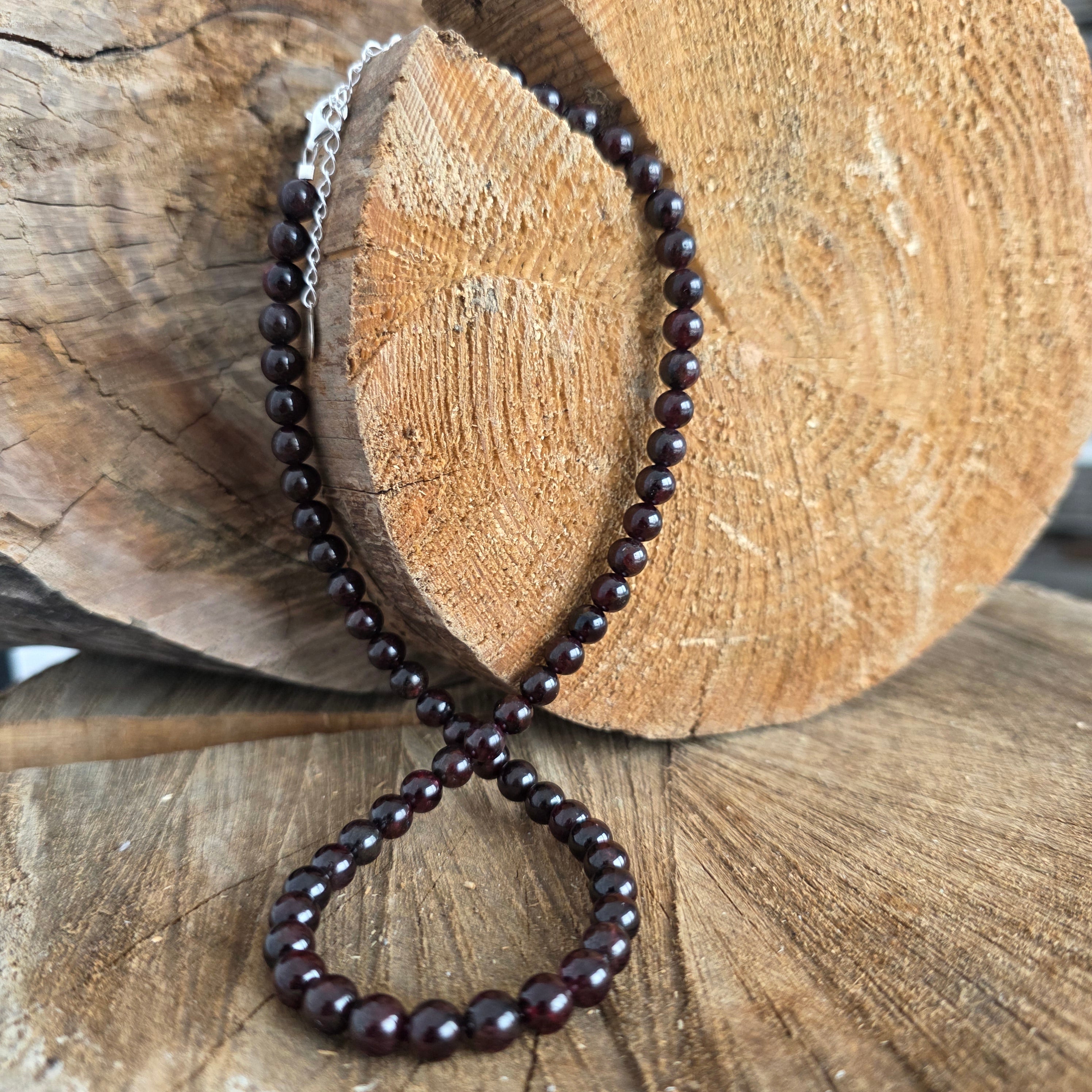 Ένα κολιέ που αιχμαλωτίζει την ουσία της ζωτικότητας και της φυσικής κομψότητας. Ο φυσικός γρανάτης των 6 mm, με τις σκούρες κόκκινες αποχρώσεις του, φέρει μια διακριτική λάμψη, σαν μια καρδιά που χτυπά αθόρυβα στο βάθος της γης. Η απλότητα των λείων σφαιρών προσφέρει μια κλασική και διαχρονική εμφάνιση, αναδεικνύοντας την αυθεντική ομορφιά της πέτρας.