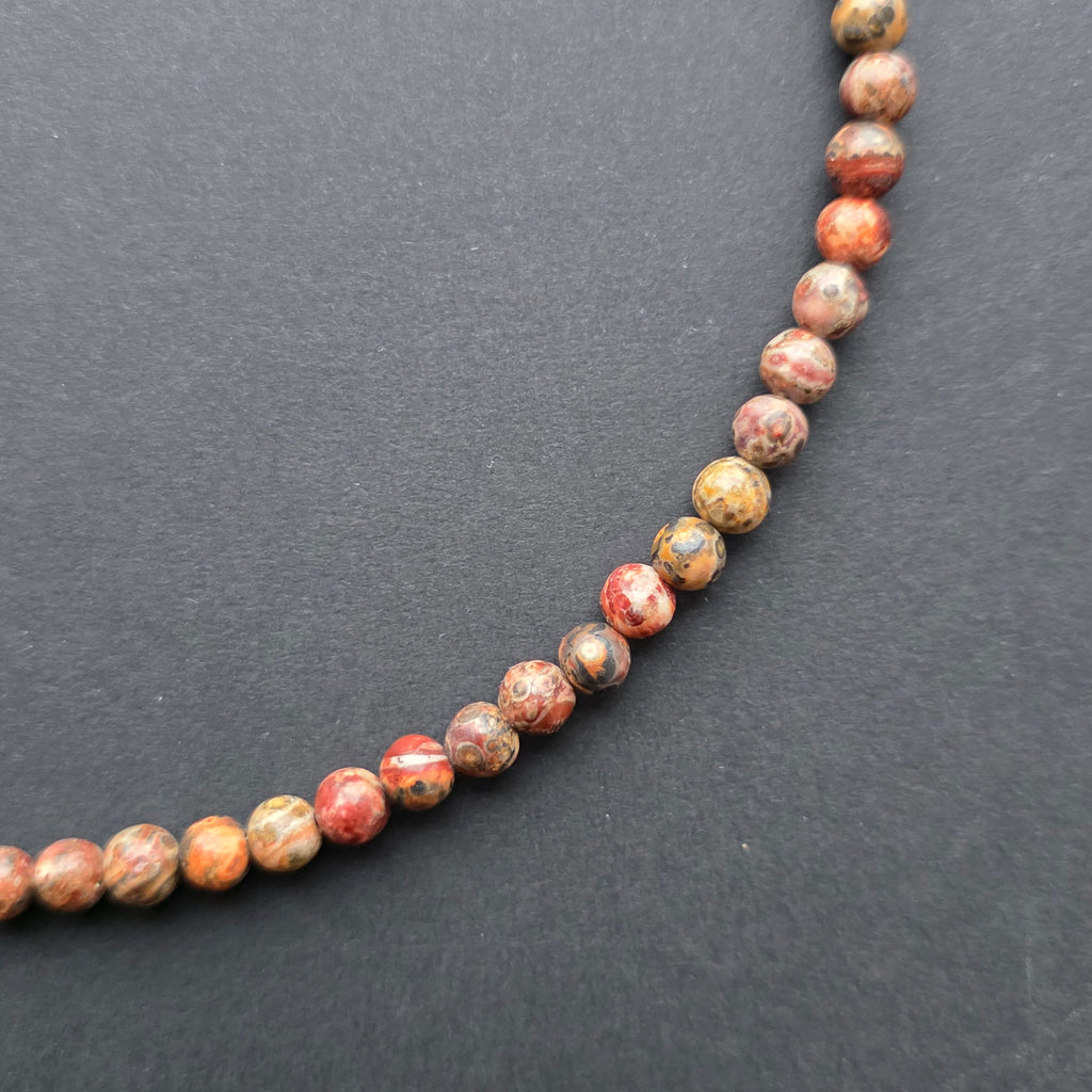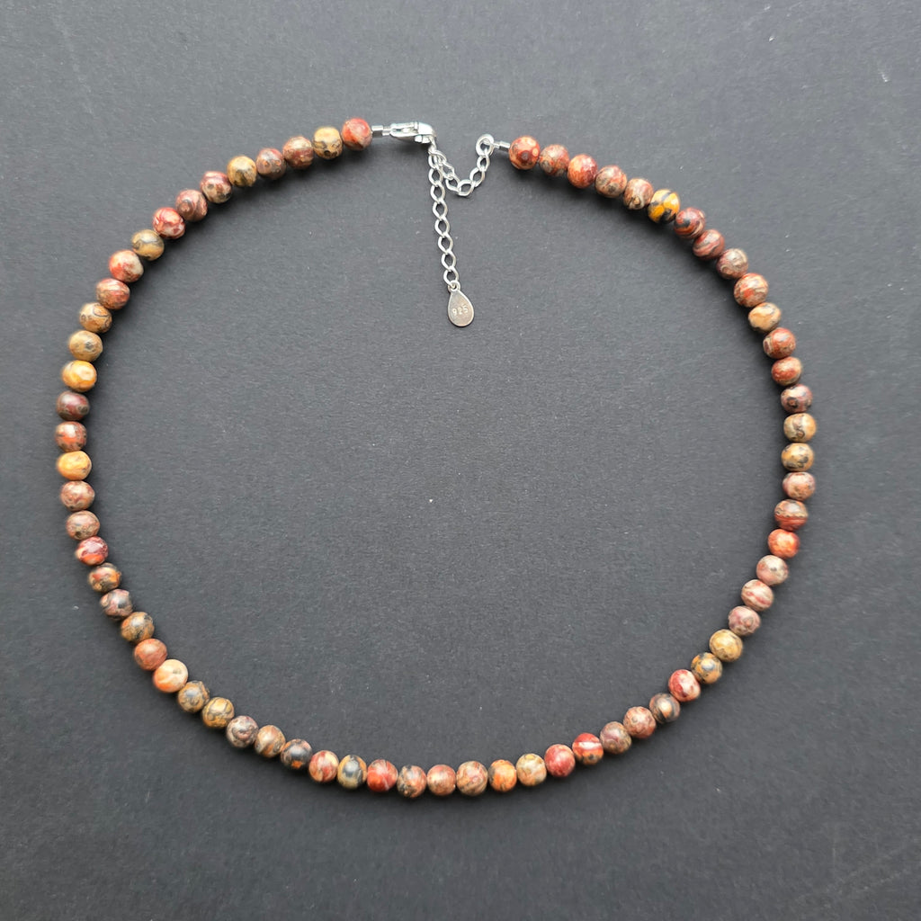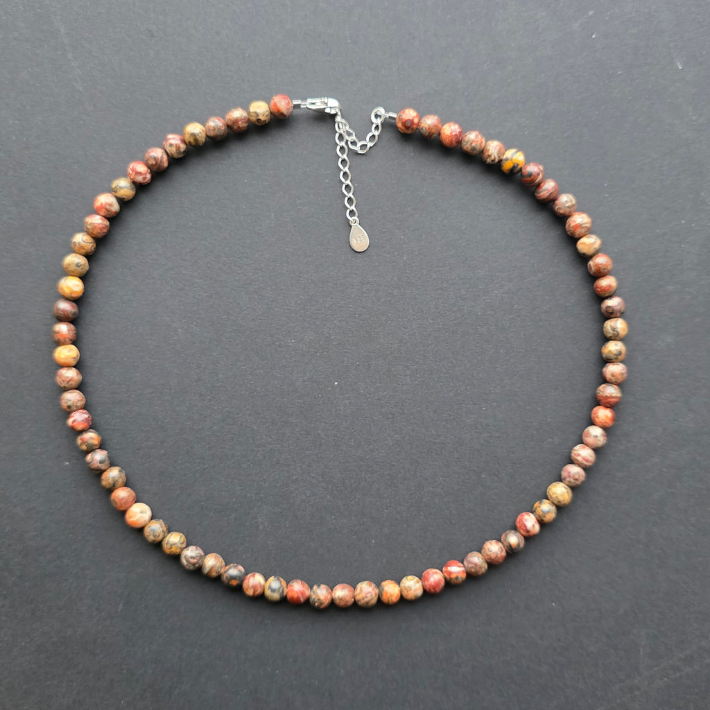 Un colier care aduce la suprafață forța tăcută a pământului și eleganța instinctuală a naturii. Jaspul leopard natural de 6 mm se remarcă prin texturile sale vii și combinația de tonuri calde, pământii, ce par desprinse din peisaje aride, stâncoase și pline de viață. Forma sferică netedă conferă bijuteriei o fluiditate naturală, iar argintul adaugă o notă de rafinament atemporal.