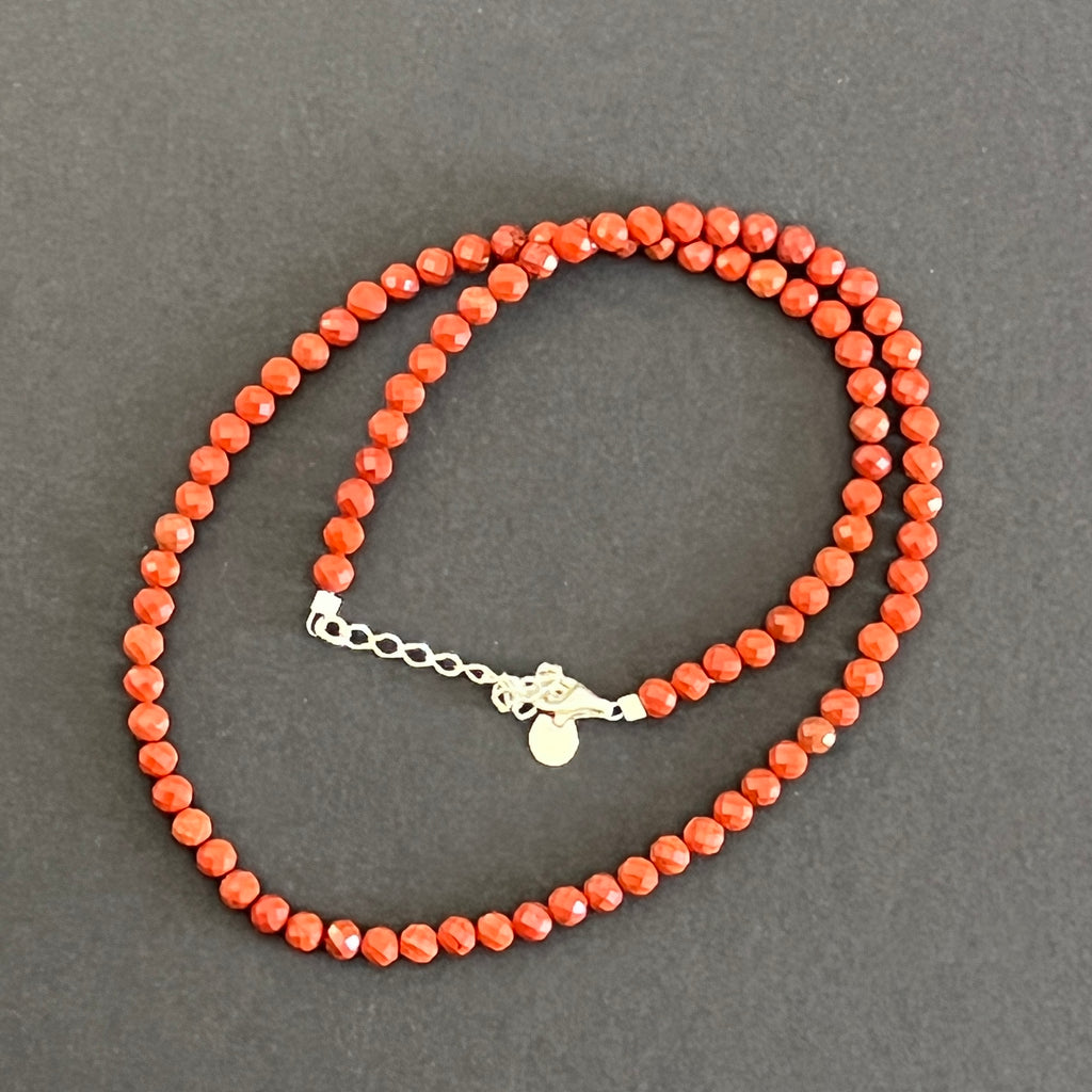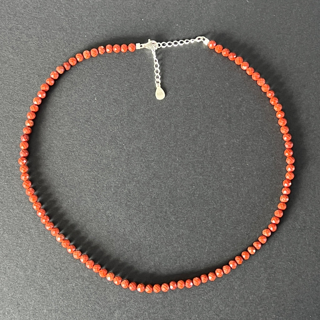 Un colier ce poartă în el focul vieții și pasiunea pământului. Jaspul roșu, cunoscut drept piatra vitalității și a curajului, strălucește în nuanțe aprinse, iar fațetele delicate ale sferelor de 4 mm lasă lumina să danseze pe suprafața lor, amplificând intensitatea culorii.