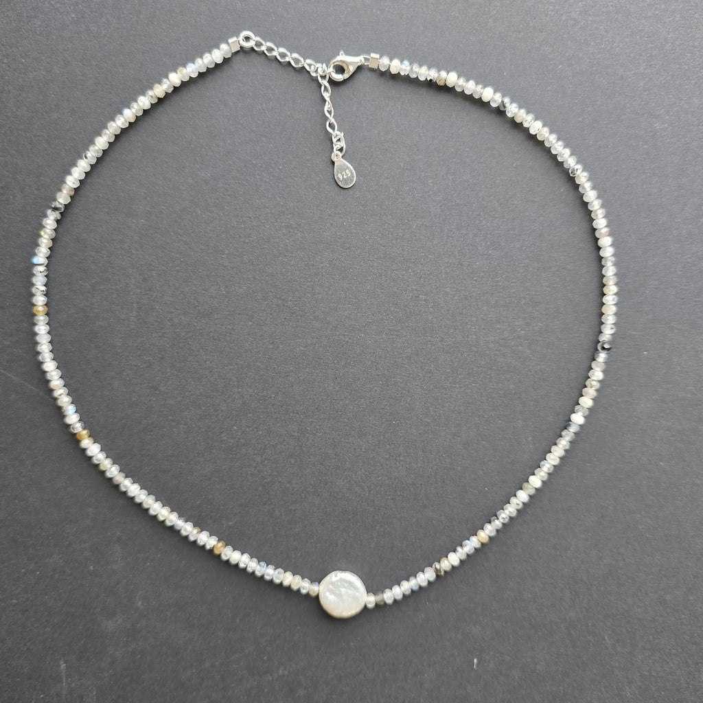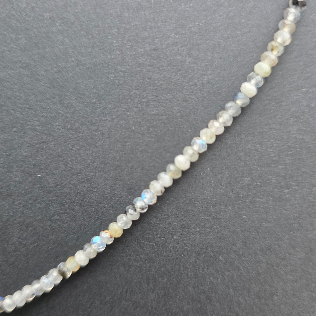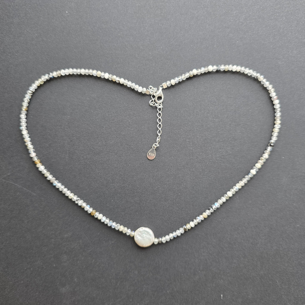 Un colier care pare născut din lumina polară, acolo unde cerul atinge pământul și culorile se contopesc într-o singură respirație. Labradoritul, cu reflexele sale albastre, verzi și aurii, ascunde în fiecare sferă de 3 mm misterul universului și farmecul necunoscutului.