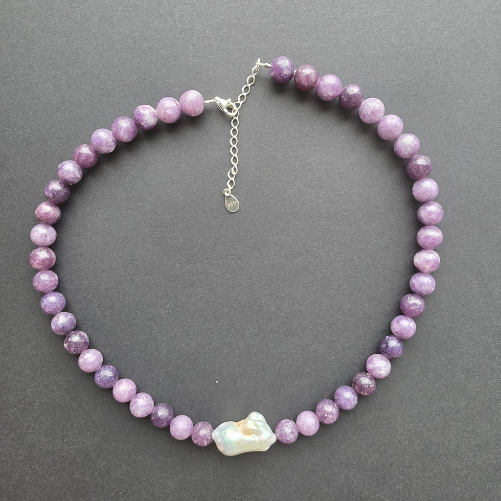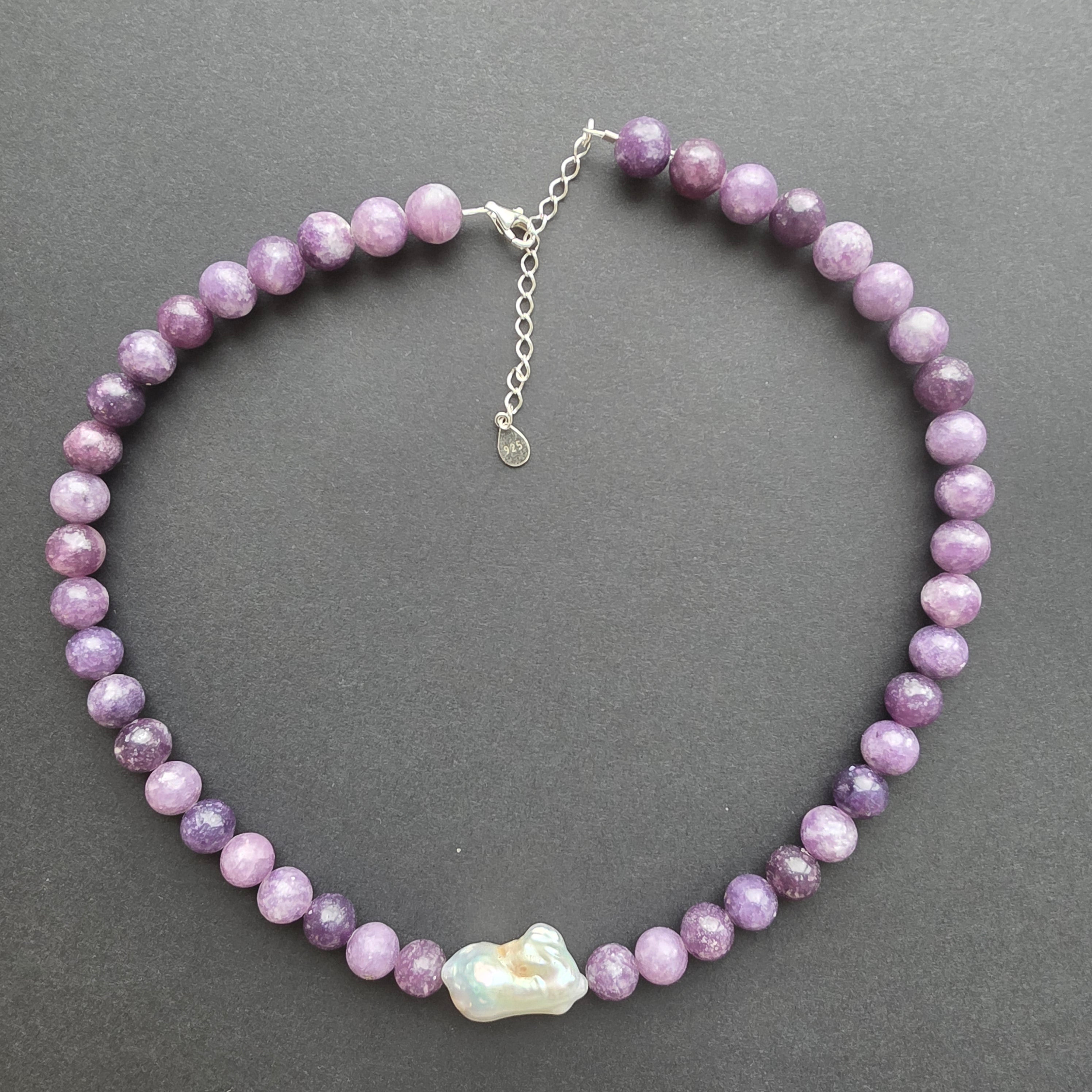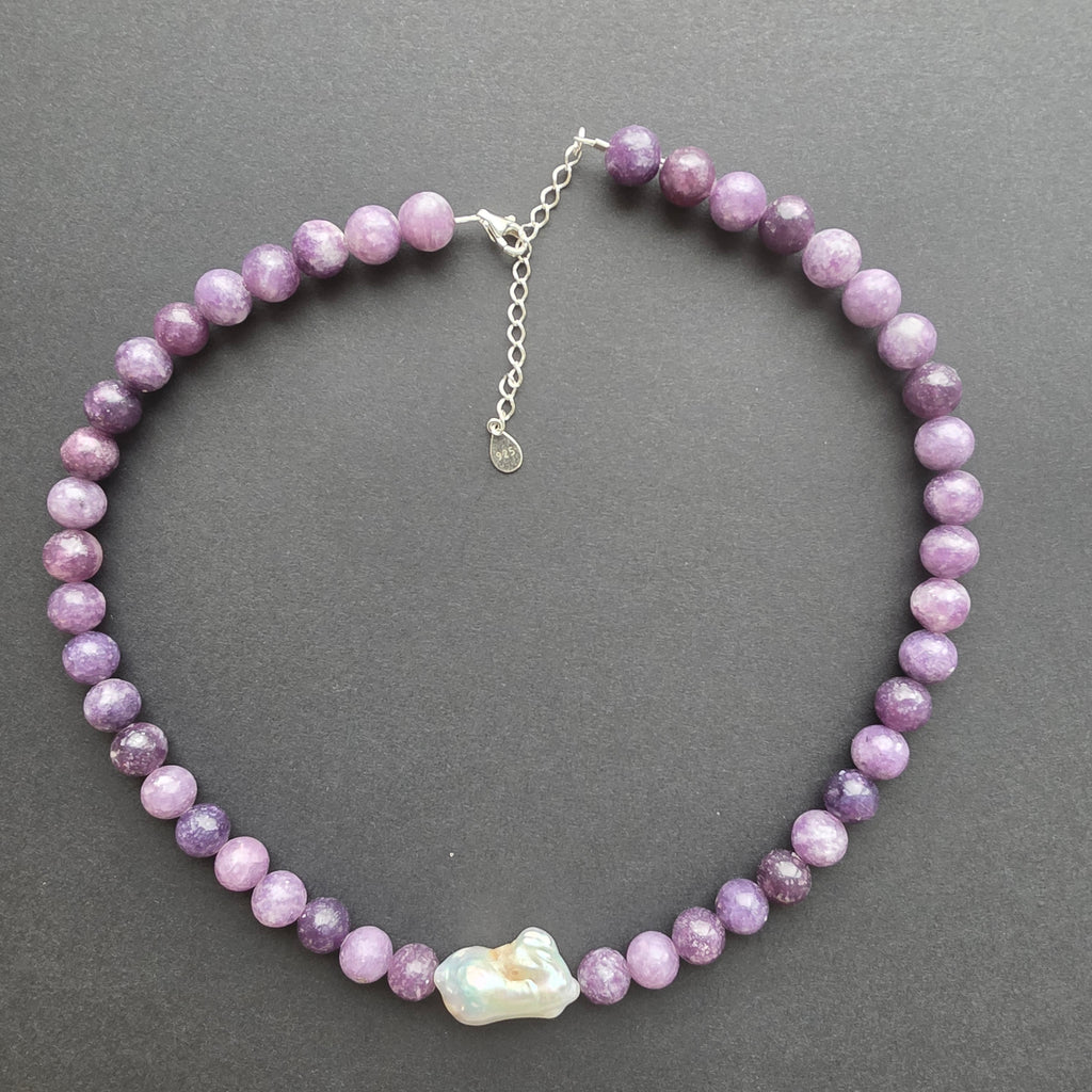 Un colier care emană liniște și rafinament, născut din îmbrățișarea subtilă a lepidolitului cu lumina catifelată a perlei. Lepidolitul natural de 8 mm, cu nuanțele sale diafane de mov-liliachiu, aduce un sentiment de calm și echilibru, ca o respirație adâncă în mijlocul furtunii. Fiecare sferă poartă o vibrație blândă, translucidă, ce amintește de pacea interioară și claritatea minții.