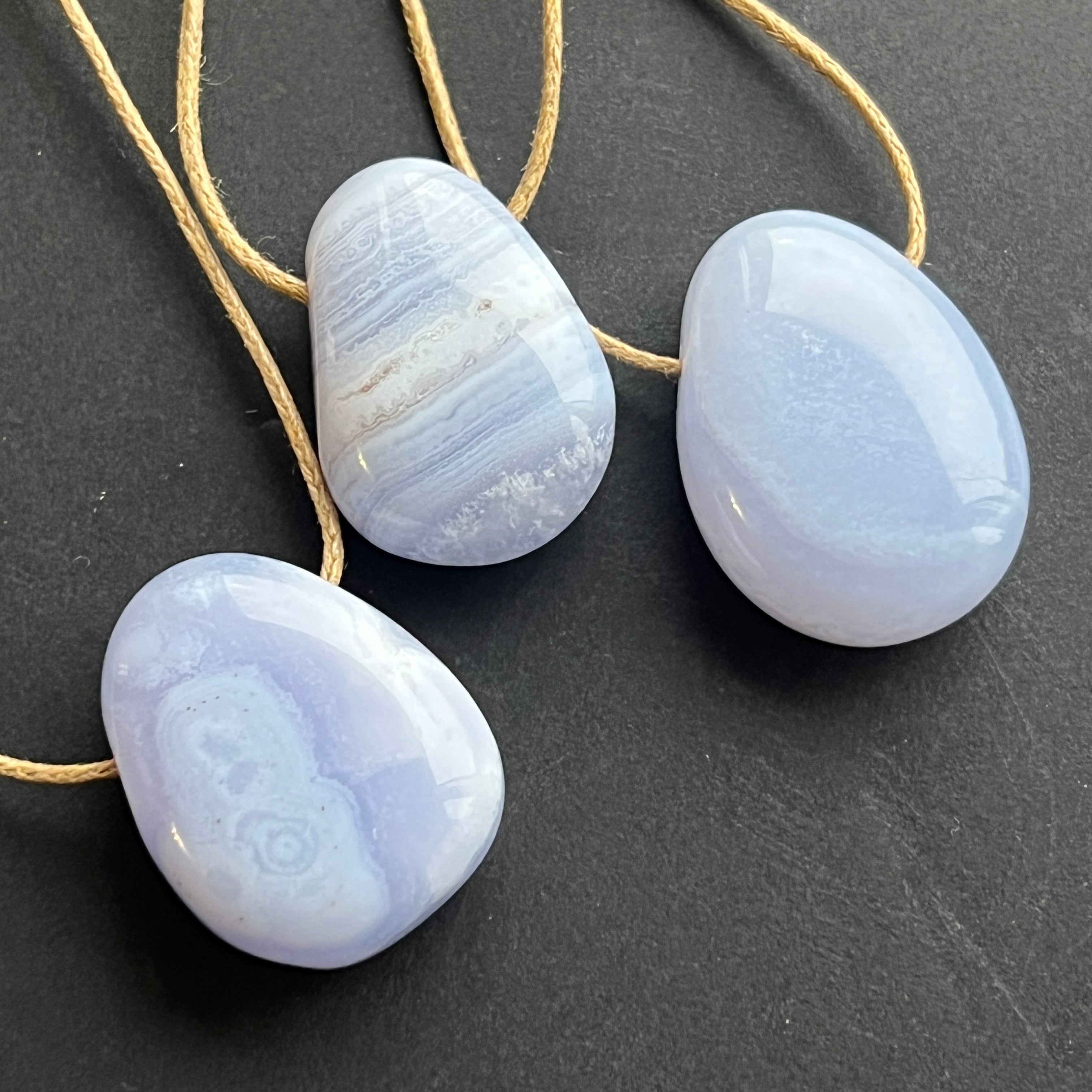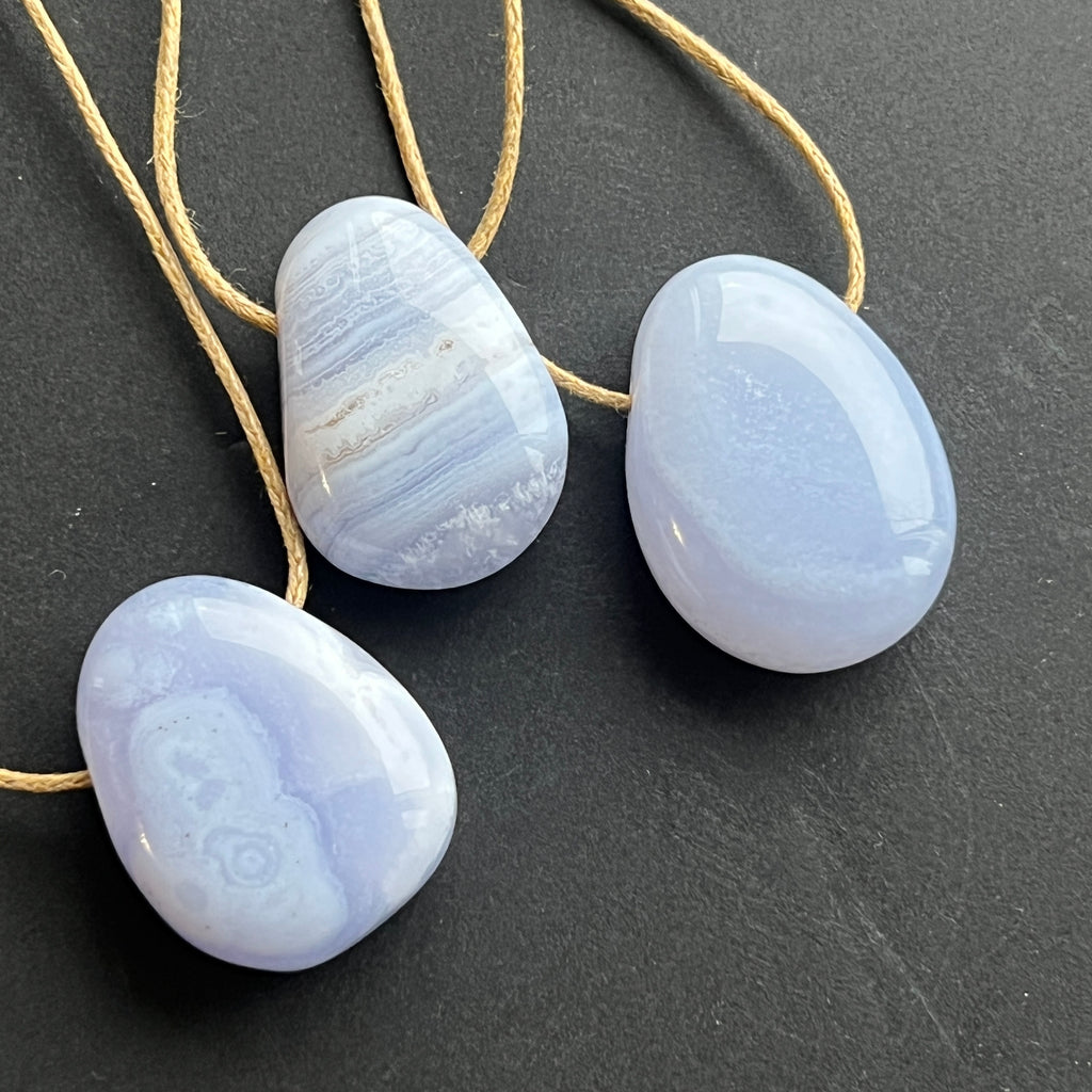 Calcedonia albastră (blue lace) este piatra comunicării calme și a expresiei blânde, cunoscută pentru capacitatea ei de a liniști mintea și de a încuraja vorbirea sinceră și echilibrată. Pandantivul în formă de drop, cu dimensiune între 2–3 cm, evidențiază frumusețea naturală a nuanțelor albastre pastelate și a dungilor delicat formate în mod natural.