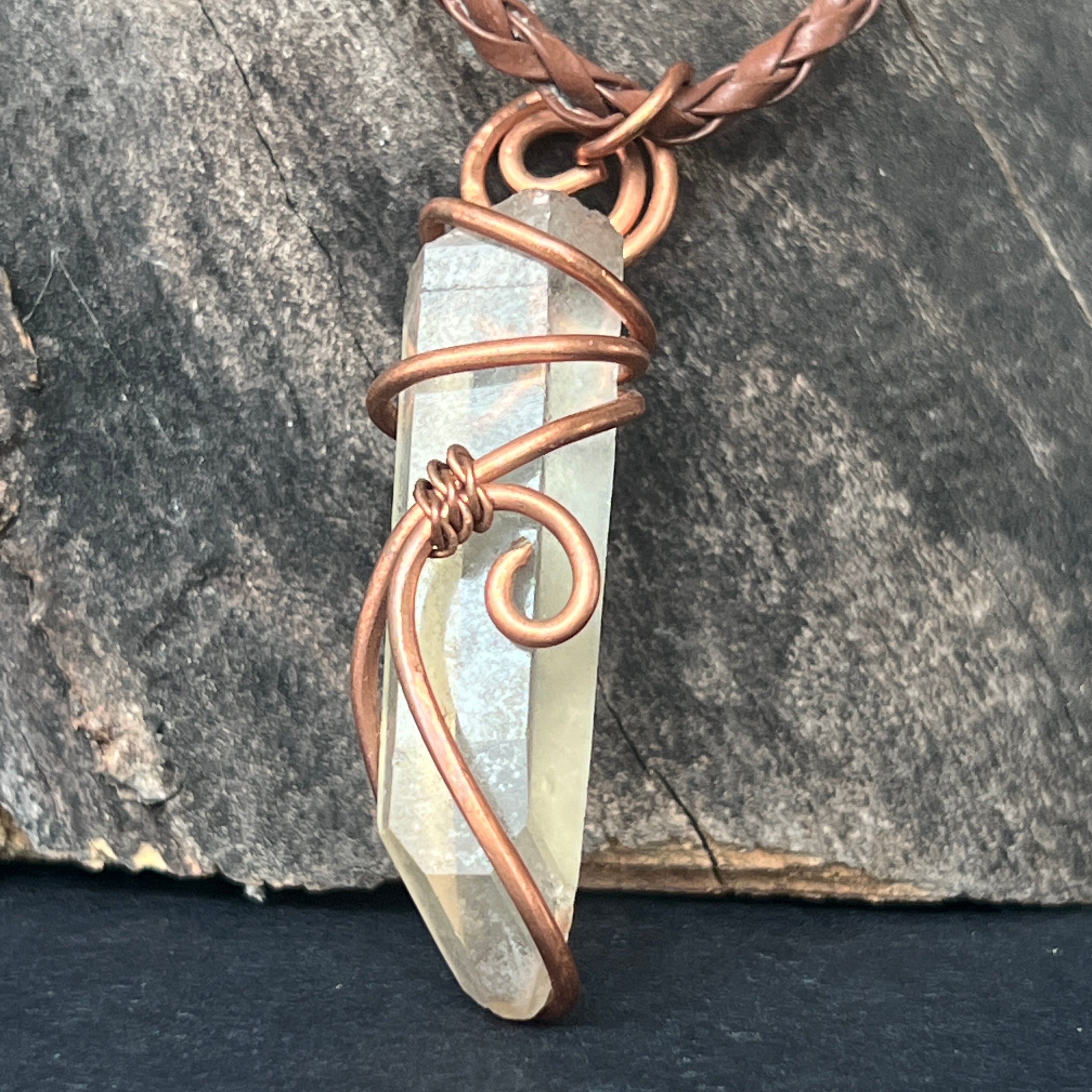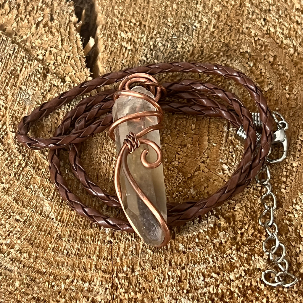 Acest colier unicat aduce la viață magia Africii printr-un pandantiv de cuart fumuriu natural, provenit din Zimbabwe. Piatra, prinsă într-o montură artistică din cupru răsucit manual, își dezvăluie nuanțele profunde, de la gri translucid până la brun cald, care par să surprindă esența fumului ce se ridică ușor din focul purificator.