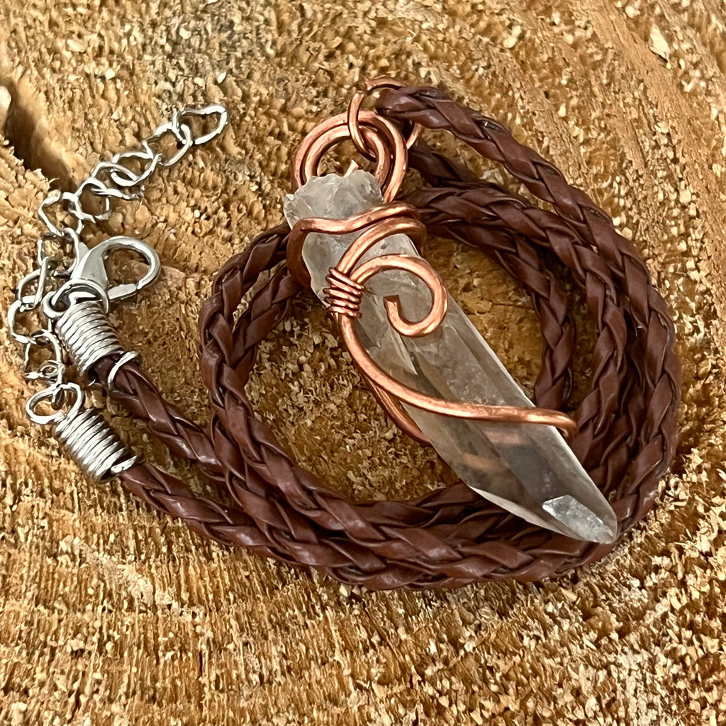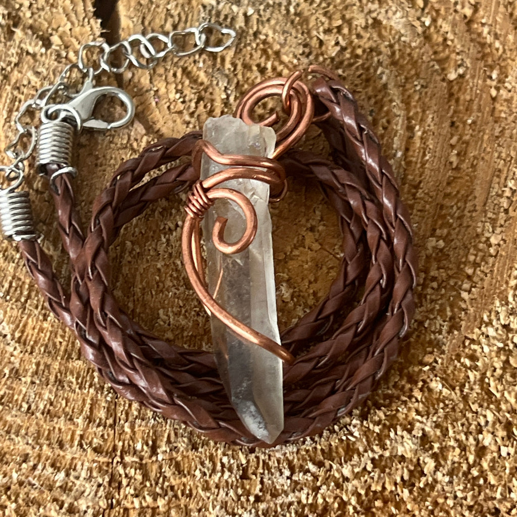 Acest colier unicat aduce la viață magia Africii printr-un pandantiv de cuart fumuriu natural, provenit din Zimbabwe. Piatra, prinsă într-o montură artistică din cupru răsucit manual, își dezvăluie nuanțele profunde, de la gri translucid până la brun cald, care par să surprindă esența fumului ce se ridică ușor din focul purificator.