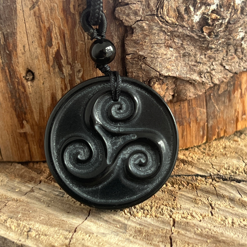 Colier pandantiv obsidian natural | Spirală celtică Triskelion