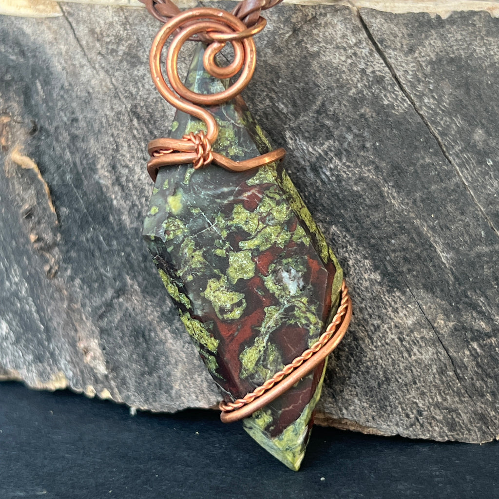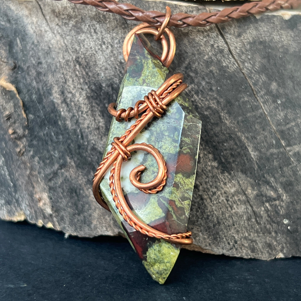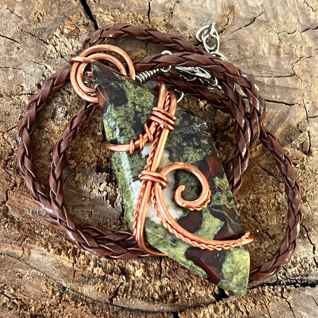 Acest colier unicat îmbină forța cu frumusețea brută a Africii printr-un pandantiv spectaculos din Sângele Dragonului, o piatră rară și fascinantă din Africa de Sud. Piatra polisată, prinsă într-o montură de cupru artistic răsucit manual, dezvăluie contraste puternice de verde pământiu și roșu intens, asemenea unei legende sculptate în mineral.