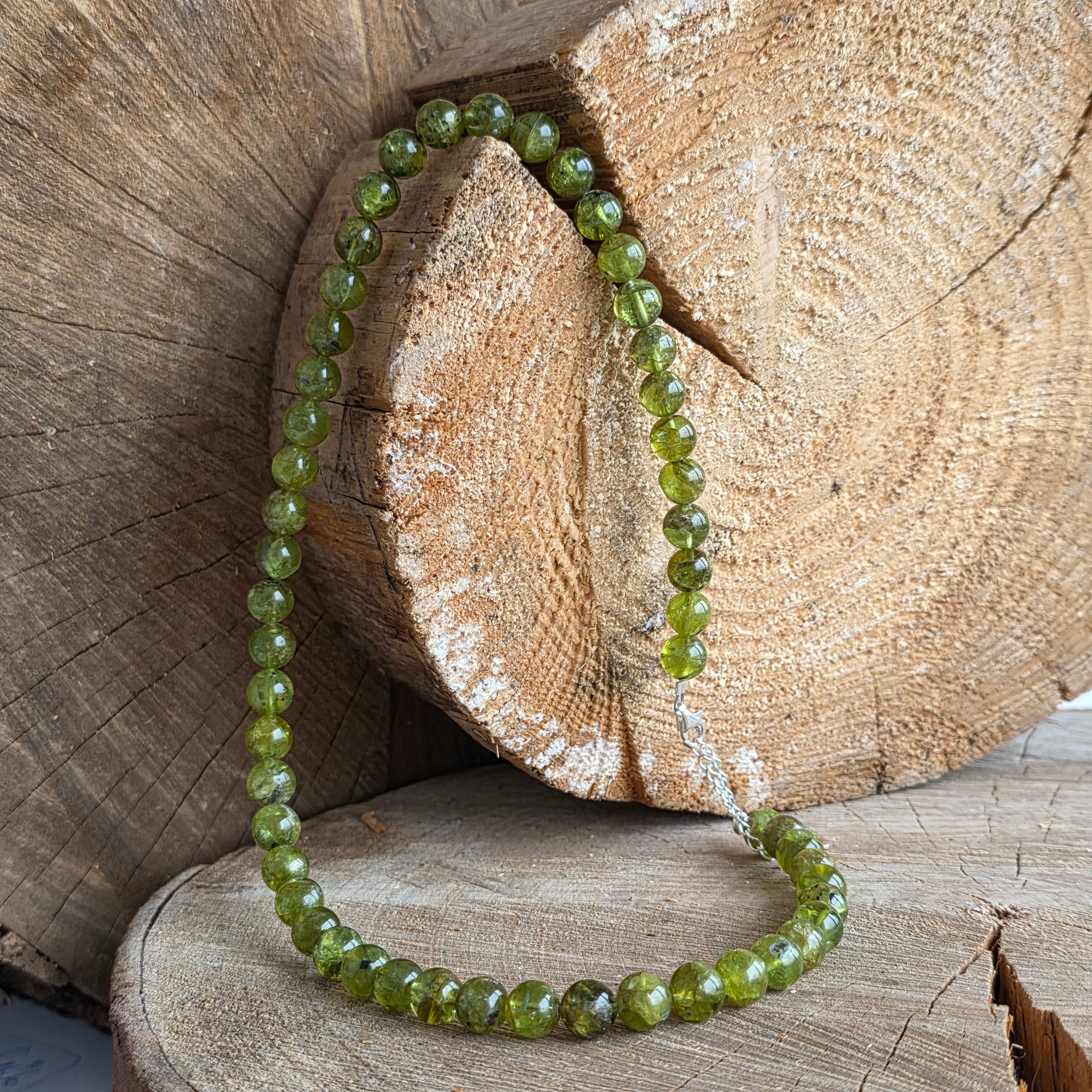 Un colier luminos și proaspăt, realizat din sfere de peridot de 8 mm, atent selecționate pentru calitatea lor AAA, cu o culoare verde intensă și clară, care pare să pulseze de viață. Fiecare sferă reflectă lumina cu o transparență caldă, evocând ideea de început nou, de respirație adâncă după o etapă încheiată. Designul este curat și echilibrat, lăsând piatra să fie centrul expresiei.
