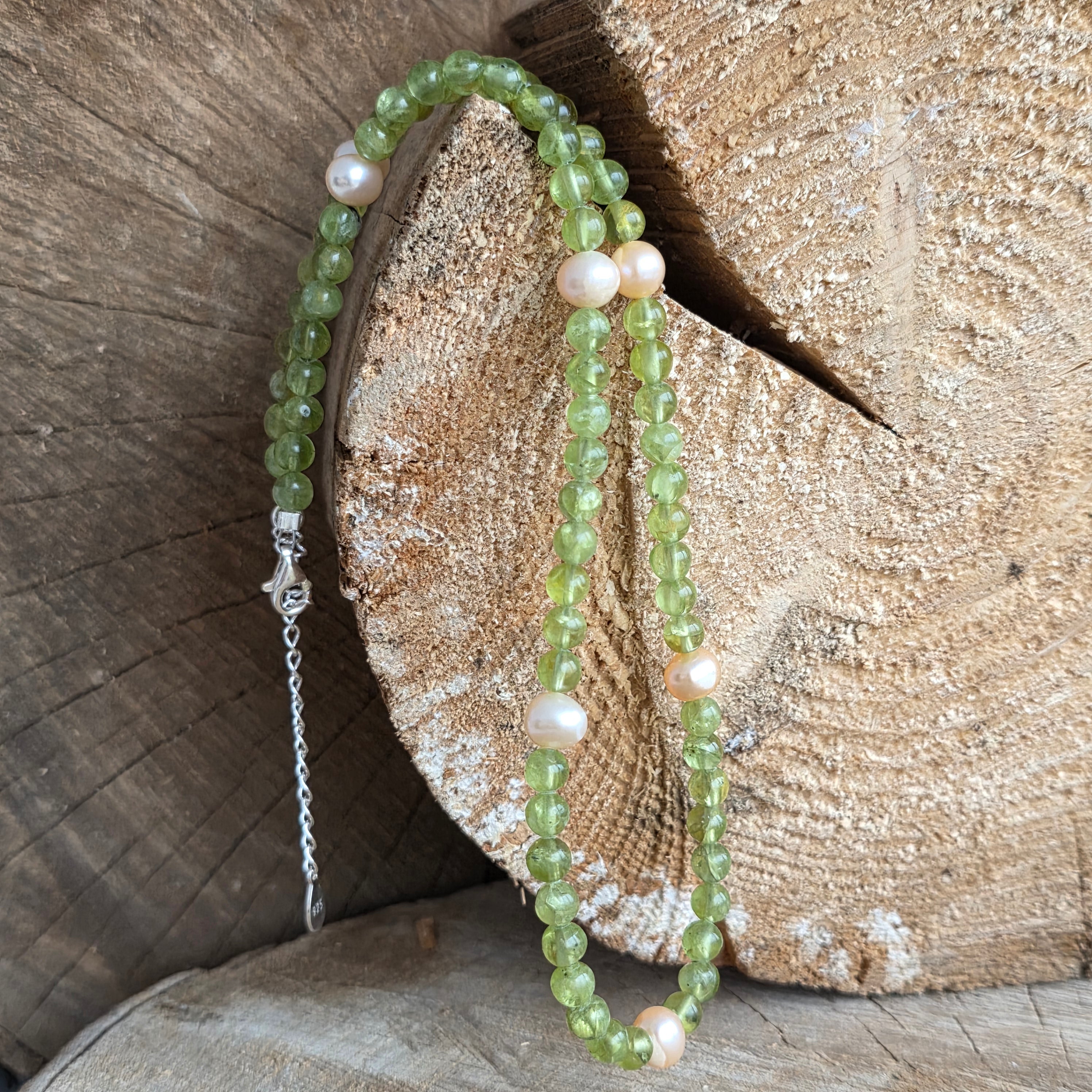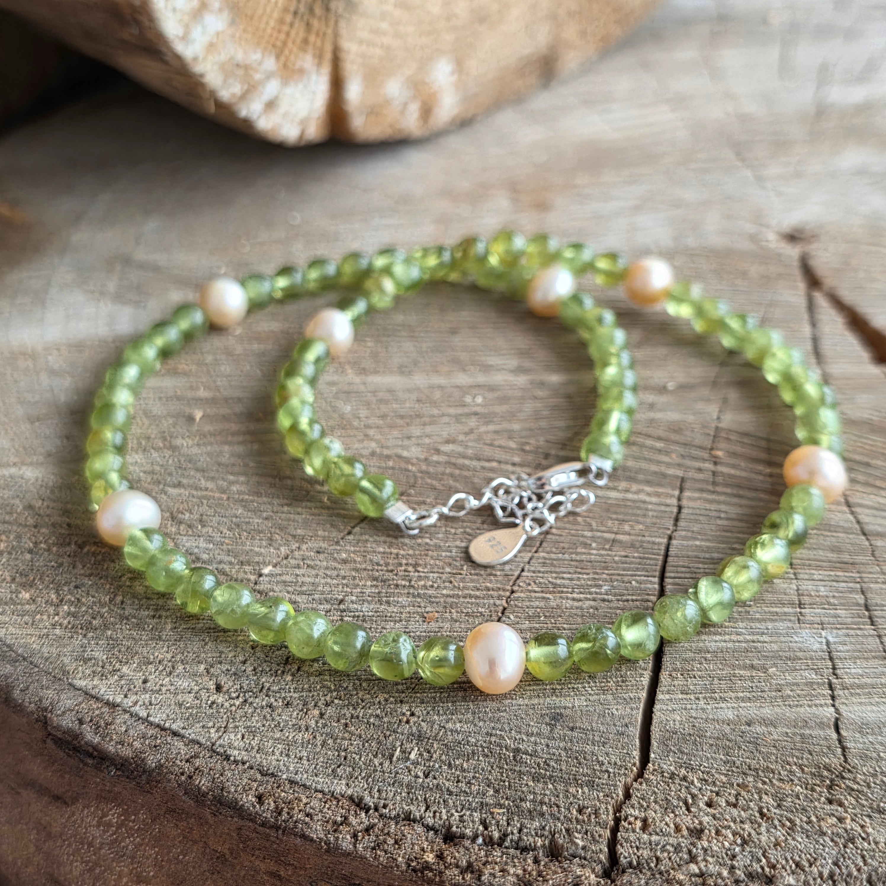 Un colier luminos și proaspăt, realizat din sfere de peridot de 5 mm, atent selecționate cu o culoare verde intensă și clară, care pare să pulseze de viață. Fiecare sferă reflectă lumina cu o transparență caldă, evocând ideea de început nou, de respirație adâncă după o etapă încheiată. Designul este curat și echilibrat, lăsând piatra să fie centrul expresiei.