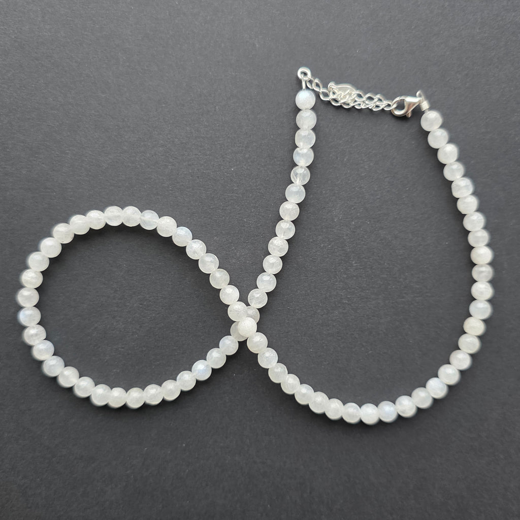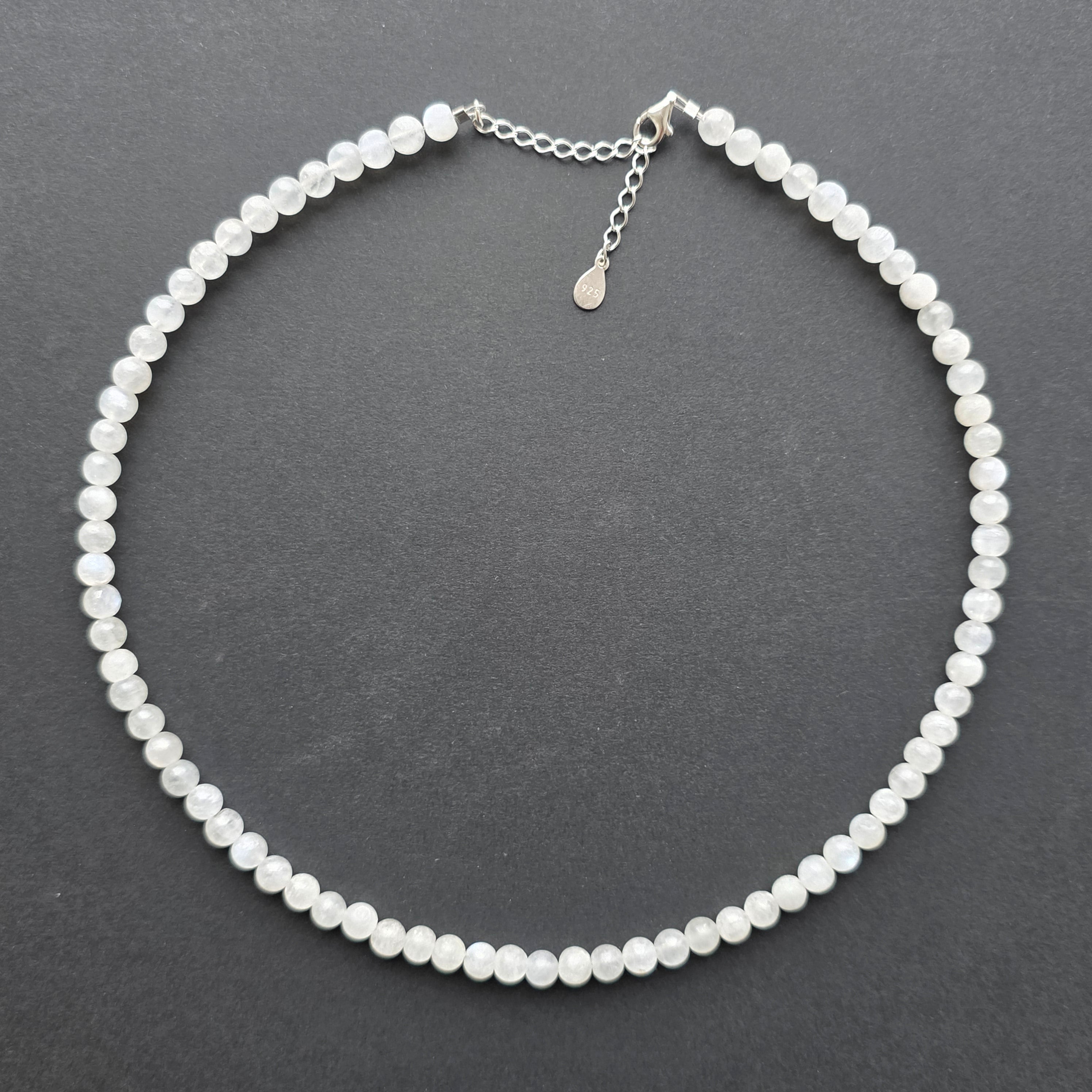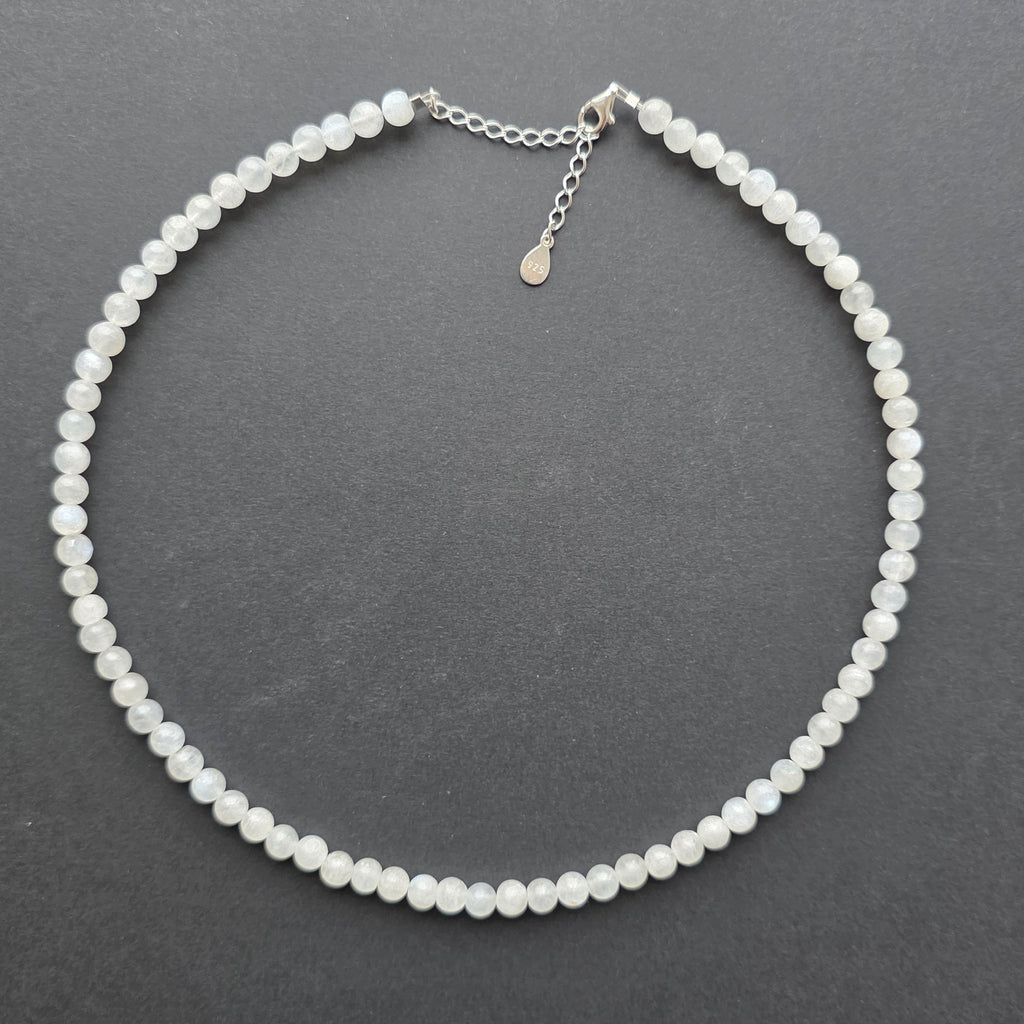 Un colier ce poartă lumina lunii în forma sa cea mai delicată. Piatra lunii naturală de 6 mm, cu reflexe albastre și sidefii, dansează subtil la fiecare mișcare, ca o rază prinsă între ape și cer. Mărgelele perfect sferice creează o linie elegantă și feminină, iar închiderea din argint 925 adaugă un plus de rafinament și durabilitate.