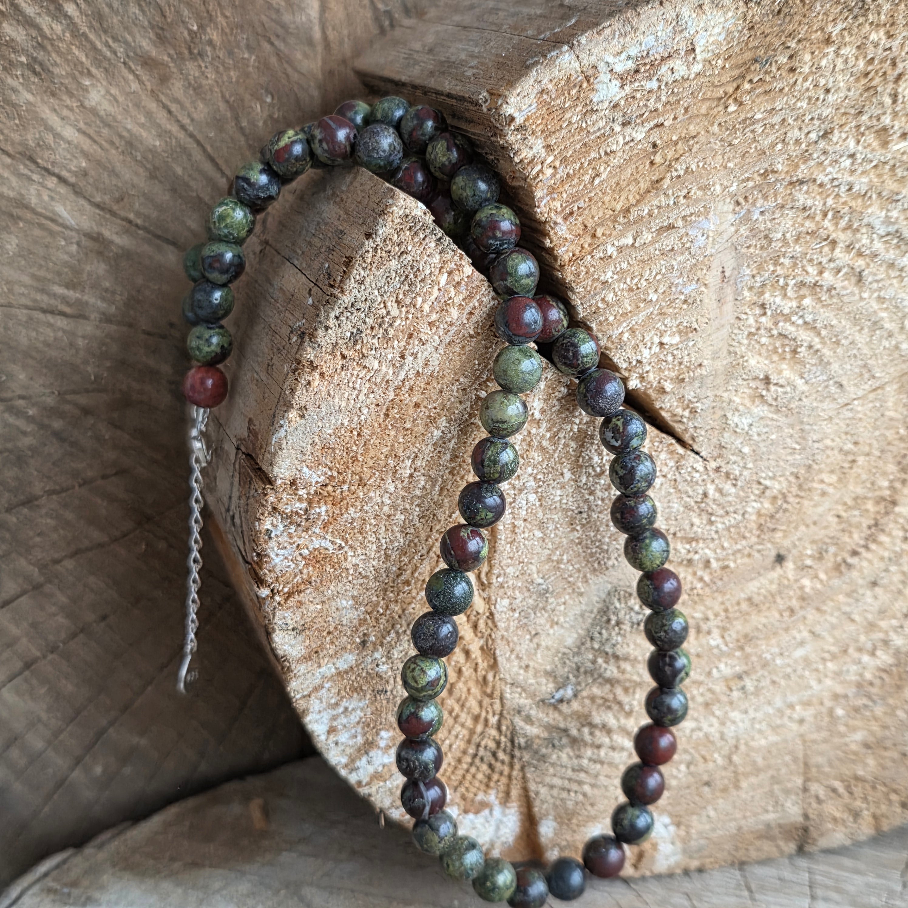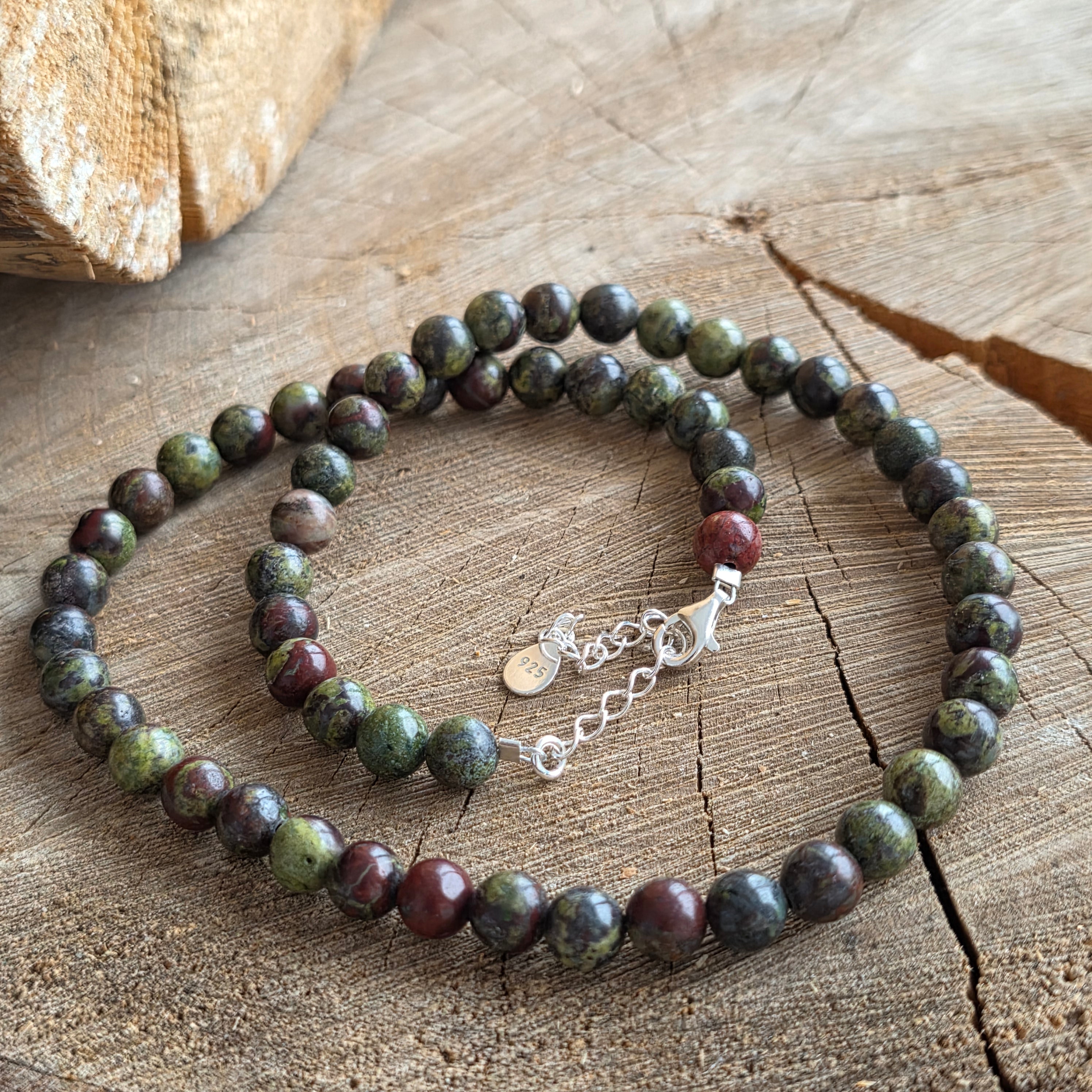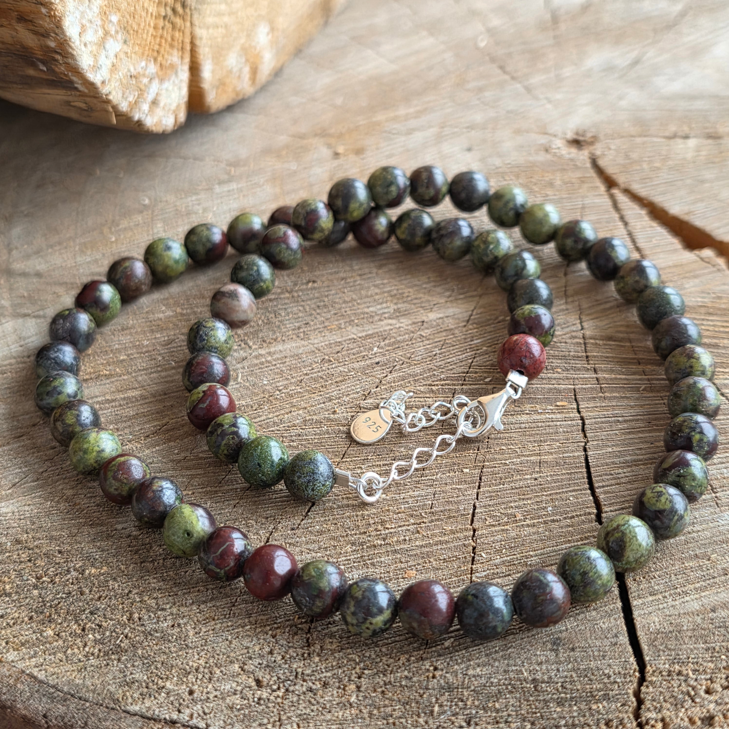 Un colier cu vibrație profundă, pământească, purtând în el forța vitală a vieții și eleganța echilibrului. Mărgelele de jasp piatra sângelui de 6 mm – verde închis cu inserții discrete de roșu – creează un fir puternic, protector, ca o coloană vertebrală energetică.