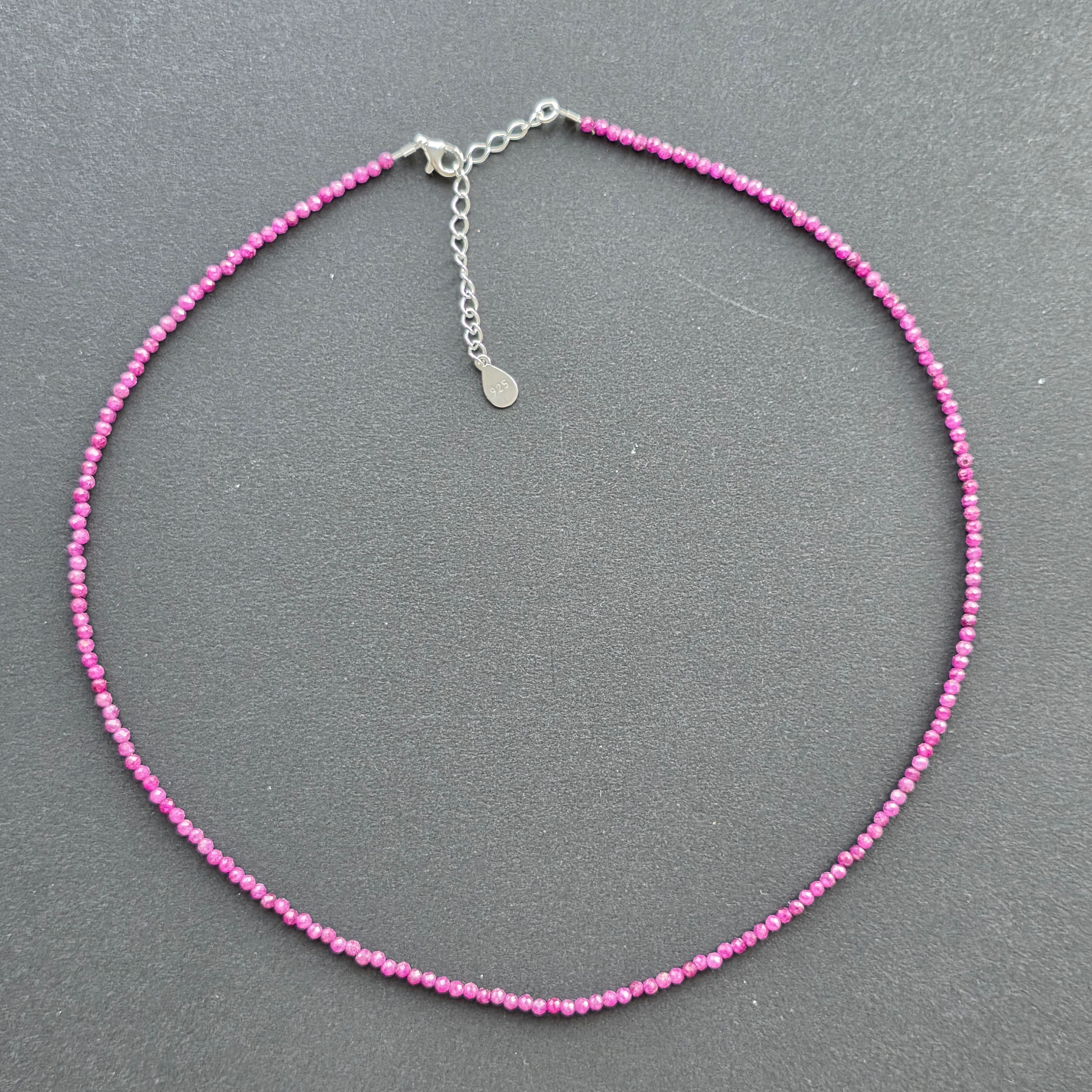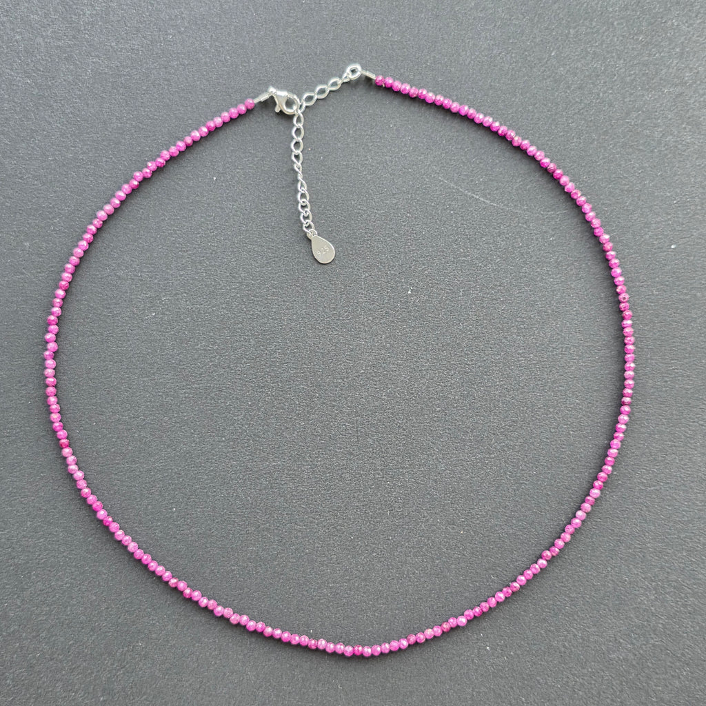 Un colier fin, dar cu prezență, realizat din sfere fațetate de rubin natural de 2.5 mm, într-o nuanță profundă de vișiniu intens, cu reflexe calde și aproape regale. Fiecare perlă mică și tăcută reflectă lumina discret, ca o șoaptă de pasiune, de intenție și de noblețe interioară.