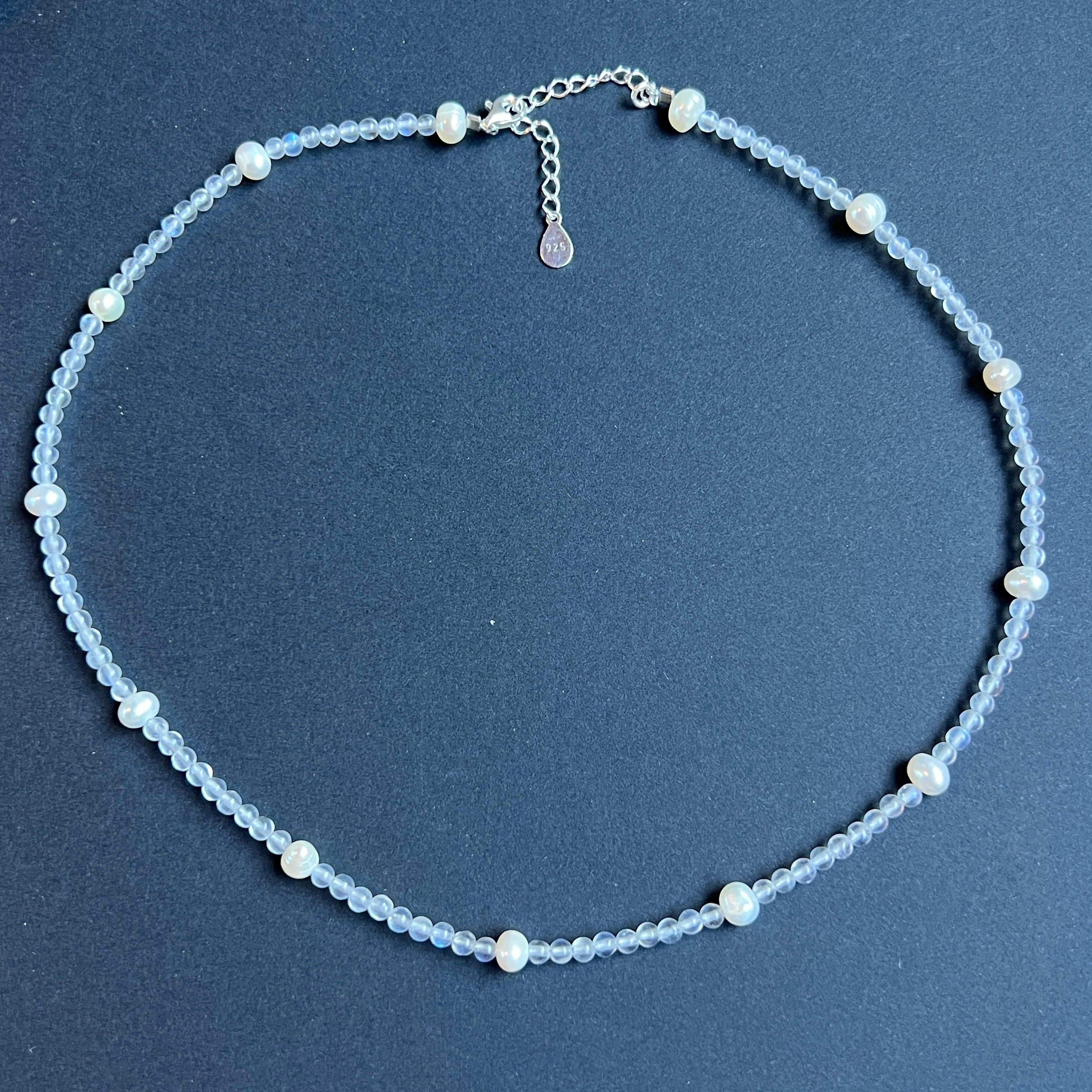 Οι μικρές σφαιρικές σφαίρες της πέτρας της Σελήνης, 3 mm, δημιουργούν ένα λεπτό, μεταξένιο ρυθμό, με μπλε και ασημένια ίριδα που φαίνονται διακριτικά στο φως, σαν μια σιωπηλή αναπνοή μεταξύ του ουρανού και του δέρματος.