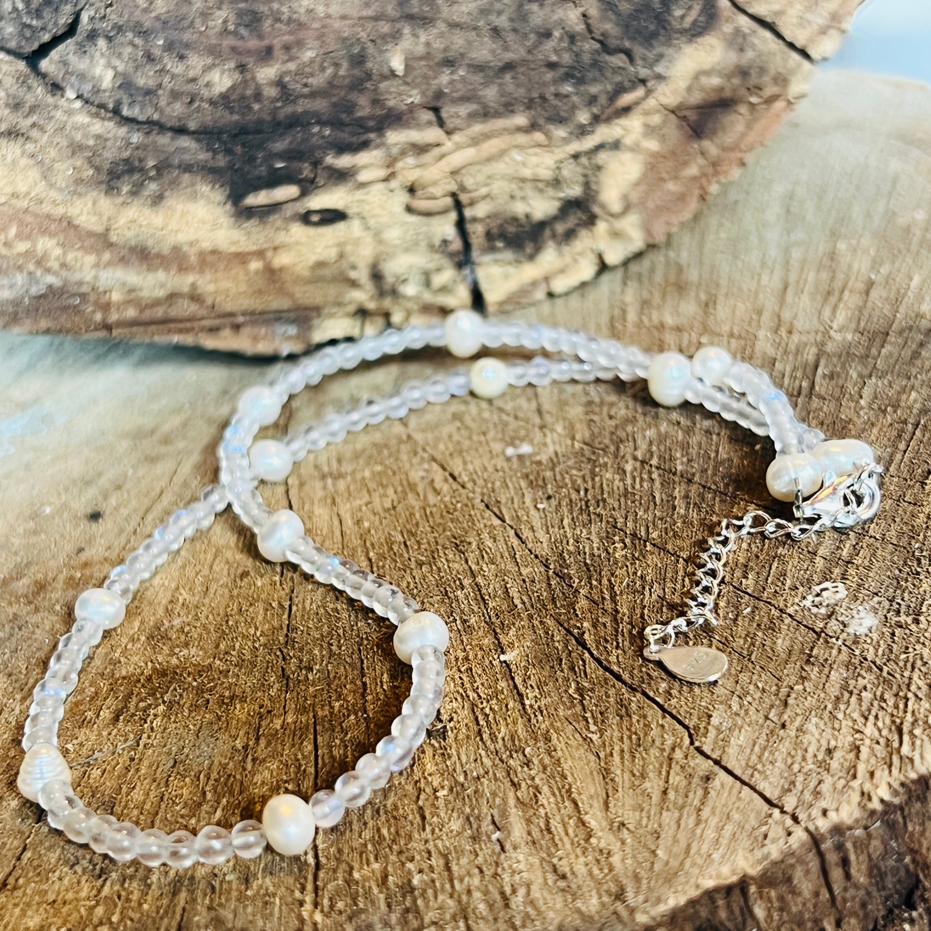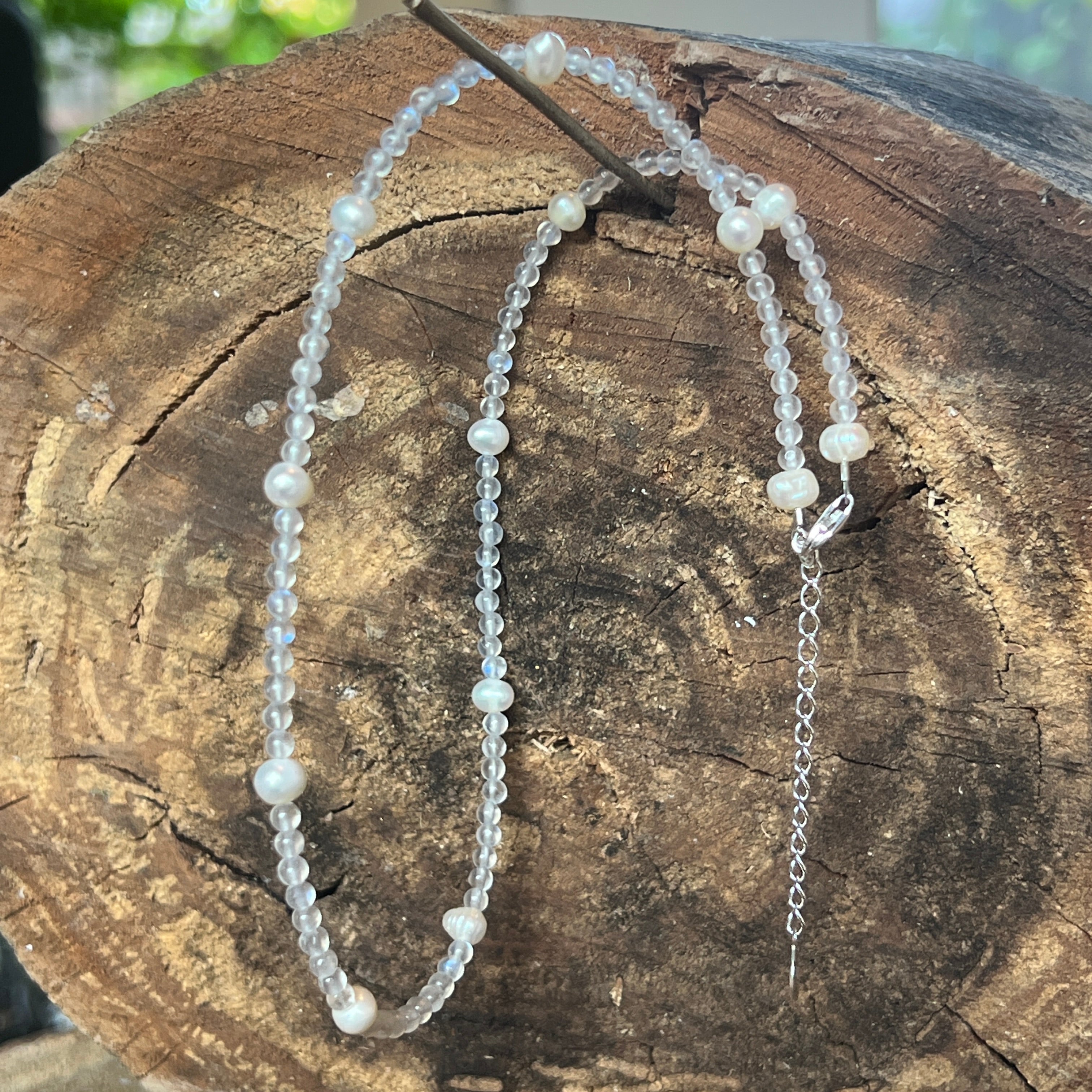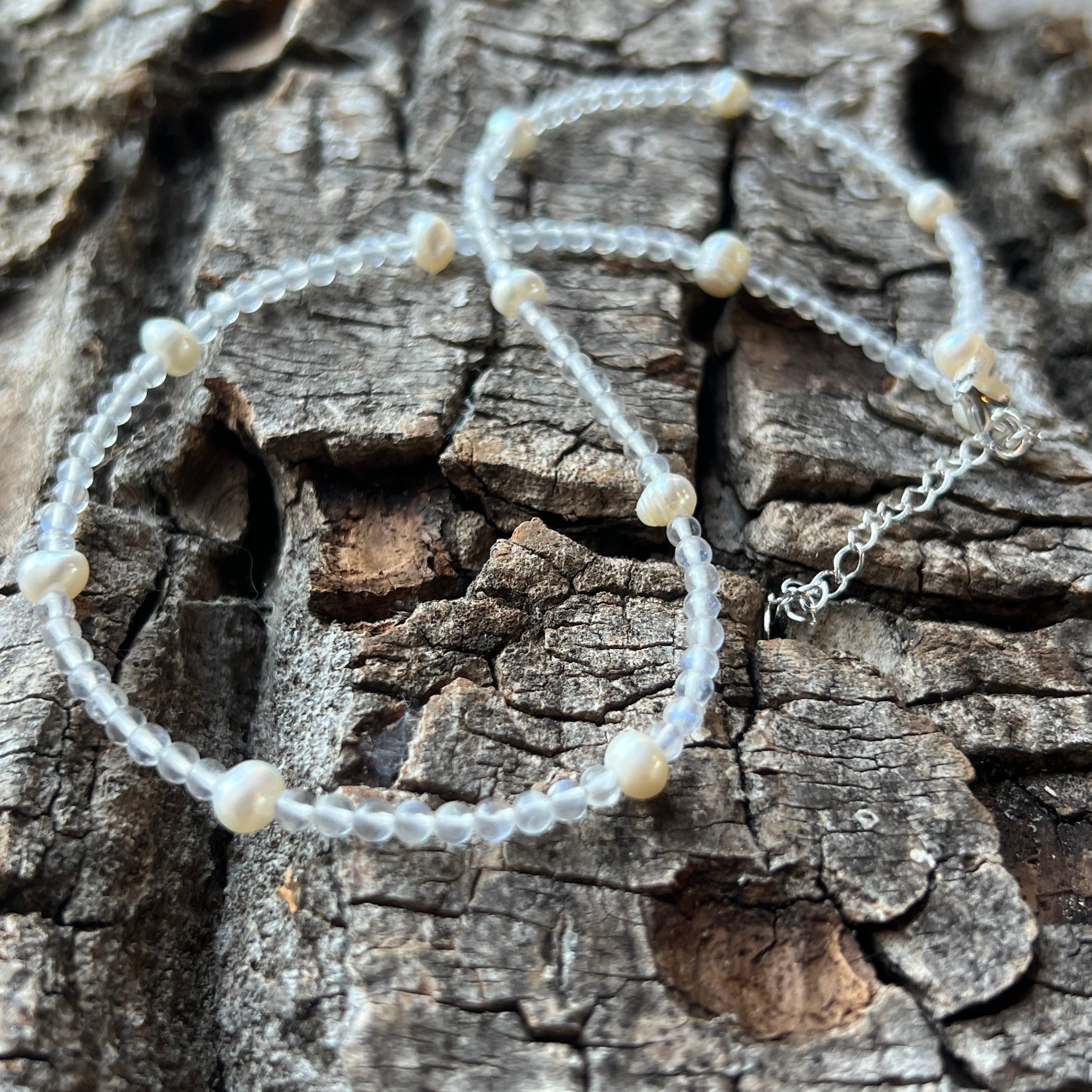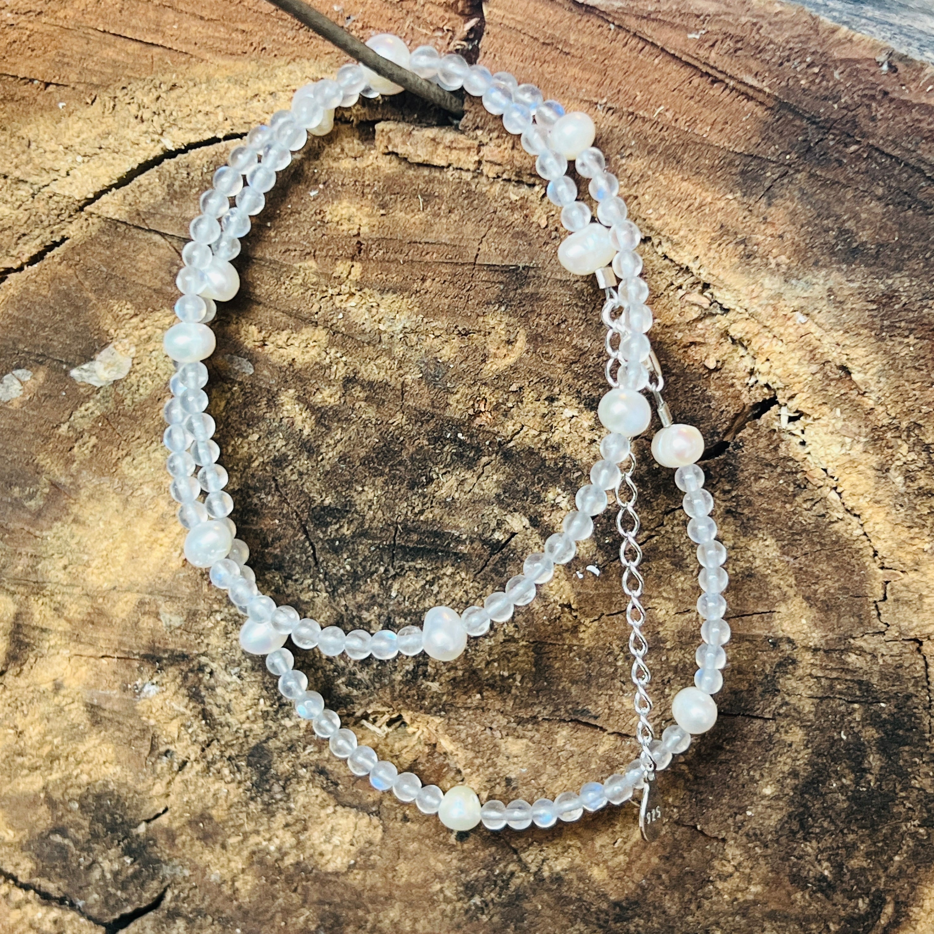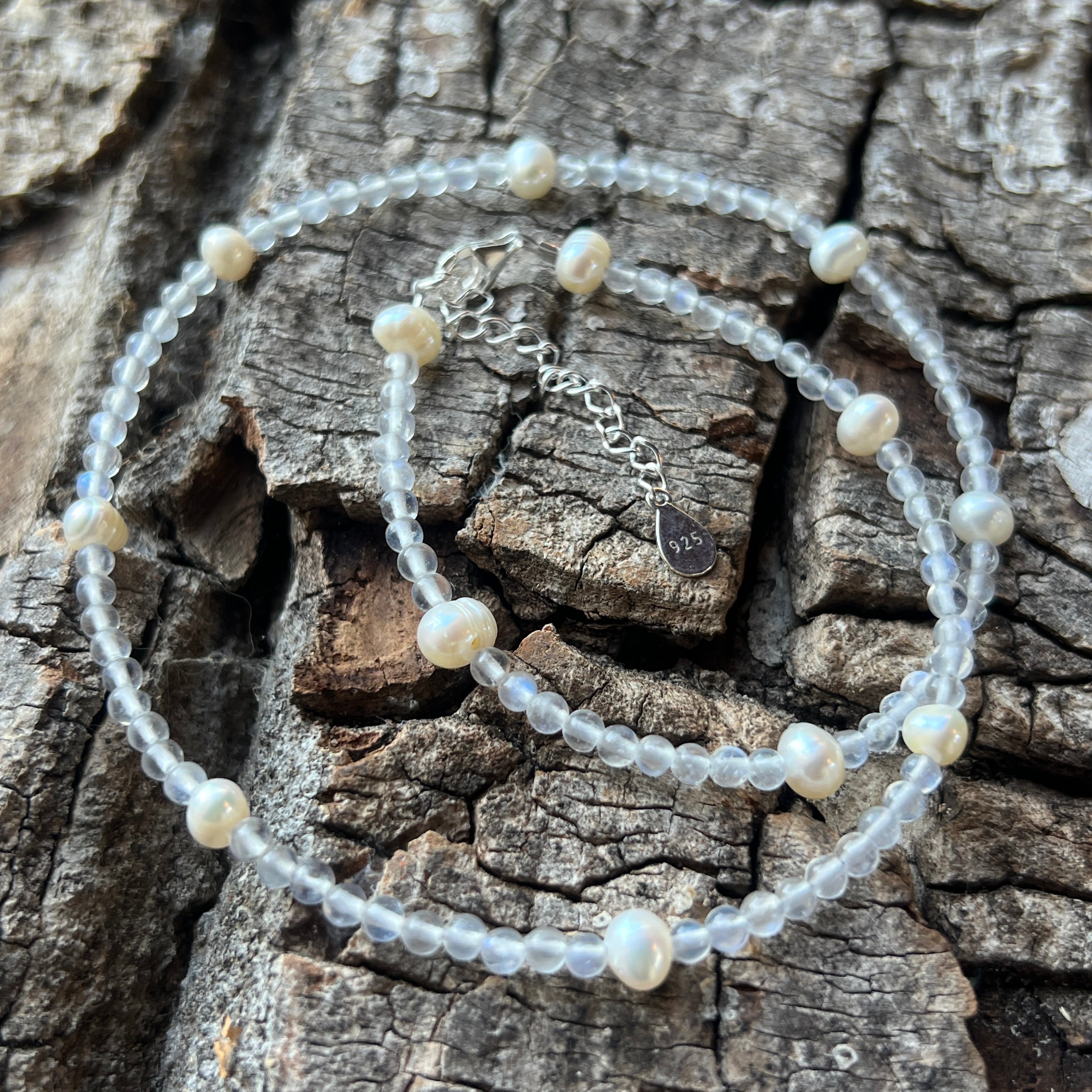 Υλικά: Φυσική πέτρα φεγγάρι 3 mm, μαργαριτάρια καλλιέργειας 7 mm, ασήμι 925