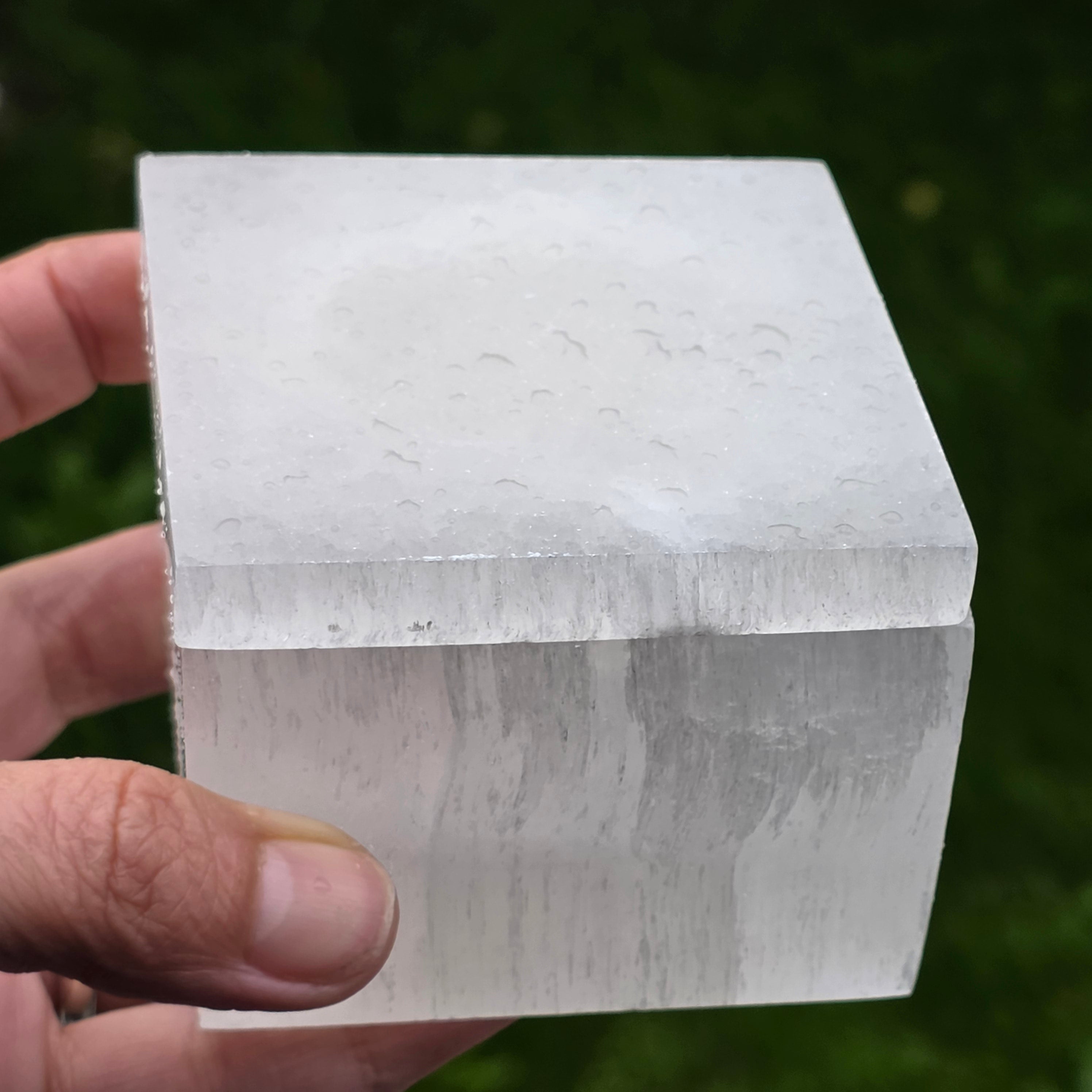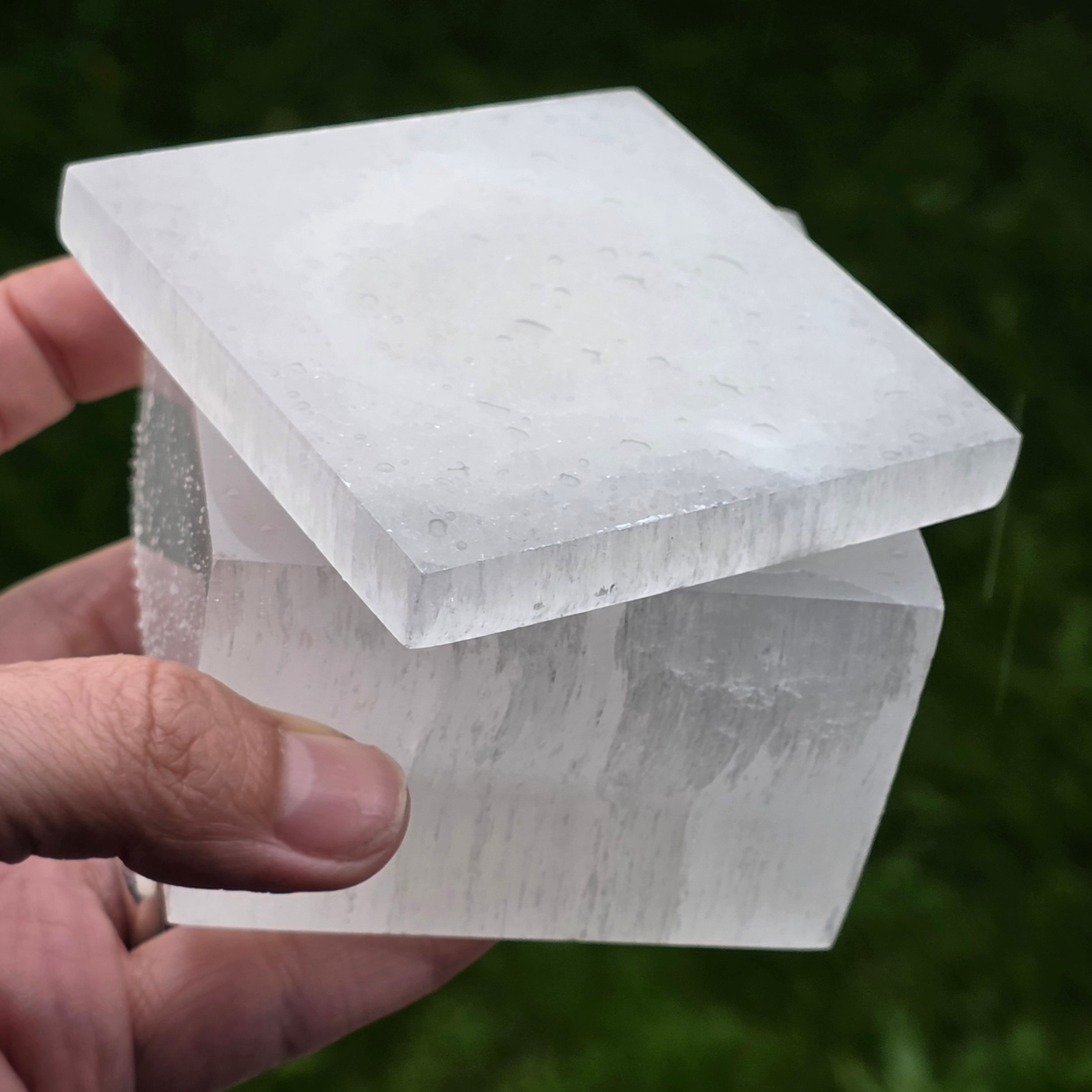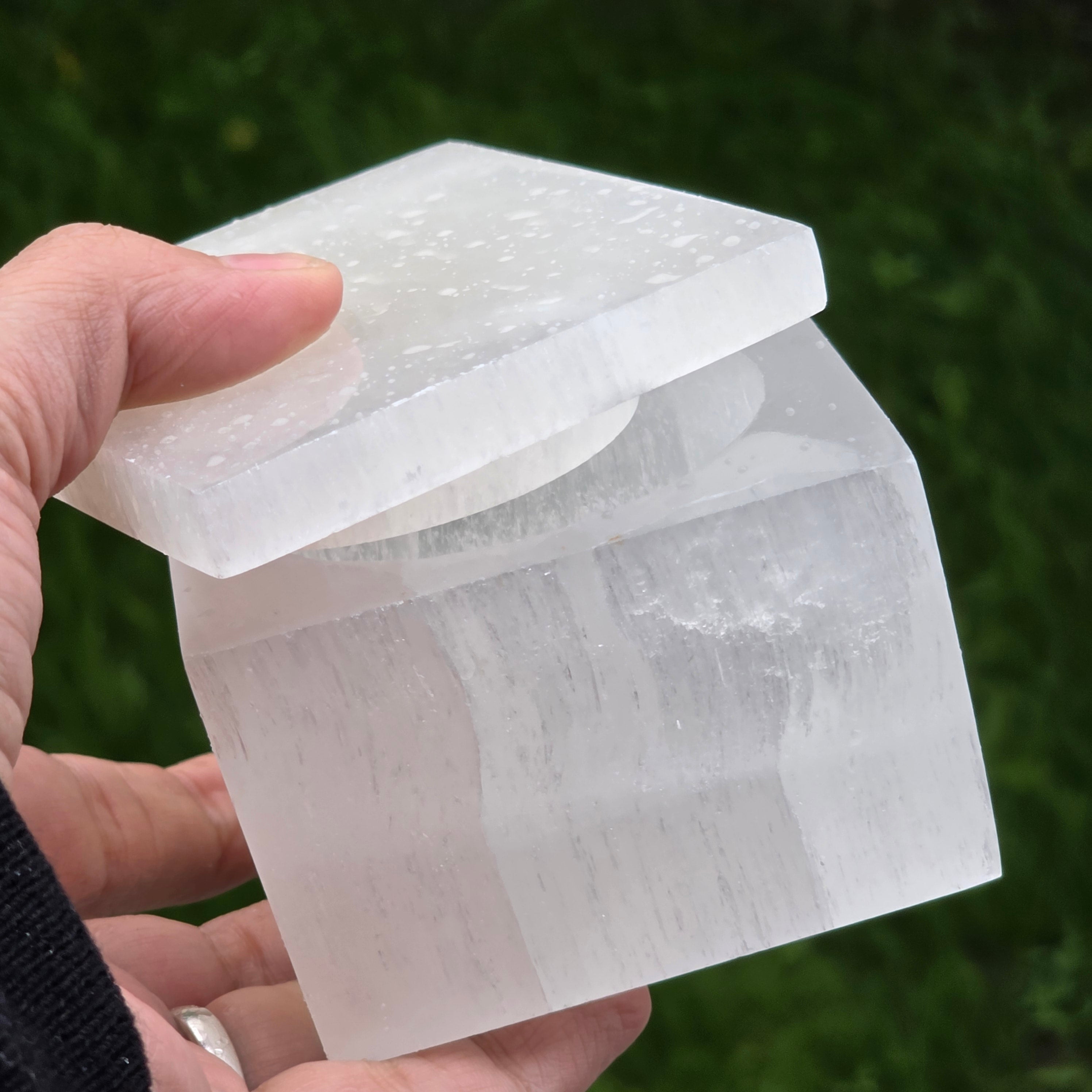 Cutia din Selenit este una dintre cele mai rafinate piese create din acest mineral luminos, o sculptură funcțională și decorativă în același timp. Realizată manual din blocuri de selenit marocan de calitate, piesa păstrează acel efect inconfundabil de „lumină solidificată” – fibrele transparente ale pietrei creează reflexii subtile, mătăsoase, care te invită să o privești din nou și din nou.
