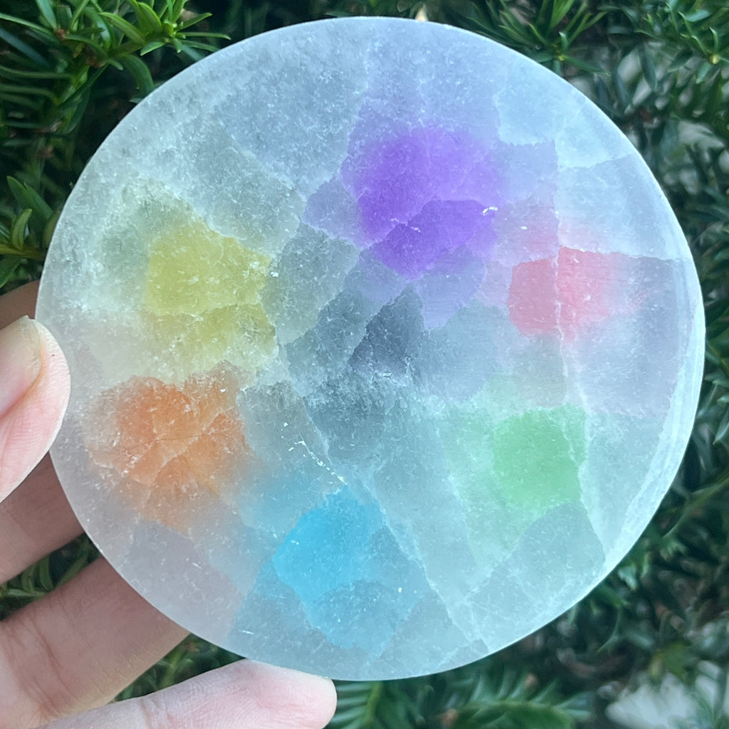 Discul din Selenit colorat – 7 Chakre este o piesă spectaculoasă, care îmbină frumusețea naturală a mineralului cu simbolismul echilibrului energetic. Straturile translucide ale selenitului, îmbrăcate în nuanțele curcubeului, reflectă armonia celor șapte centre de energie din corpul uman.