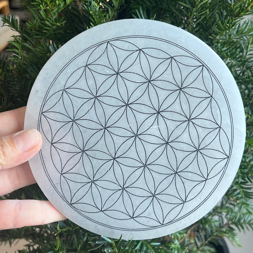 Acest disc din Selenit natural gravat cu Floarea Vieții / Flower of Life este o piesă de lumină și geometrie sacră, un instrument de armonizare energetică folosit atât în decorul spiritual, cât și în practica meditației.