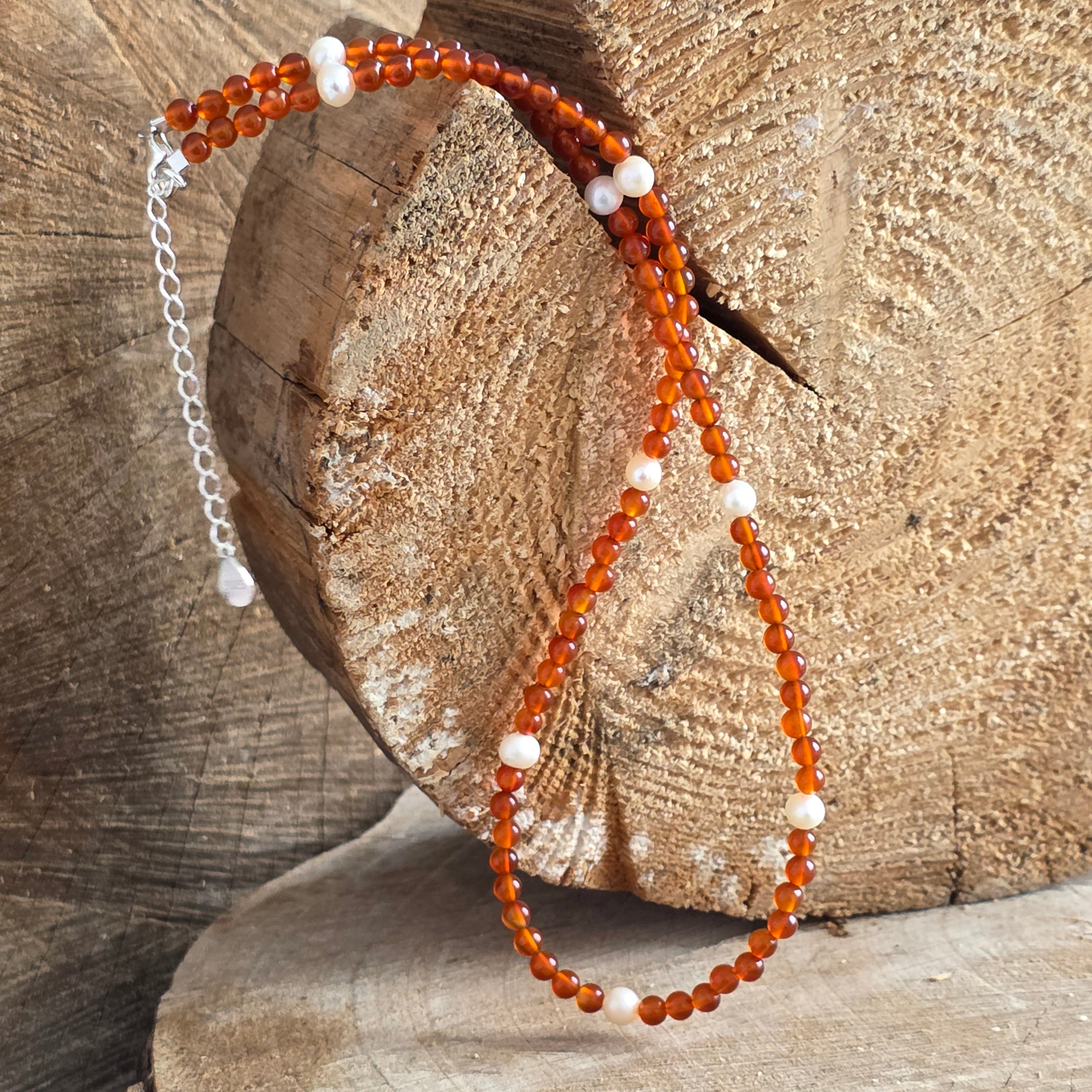 • Υλικά: φυσικό γυαλιστερό καρνεόλιο, σφαιρικές χάντρες 4mm, φυσικές πέρλες 6mm, ασήμι 925