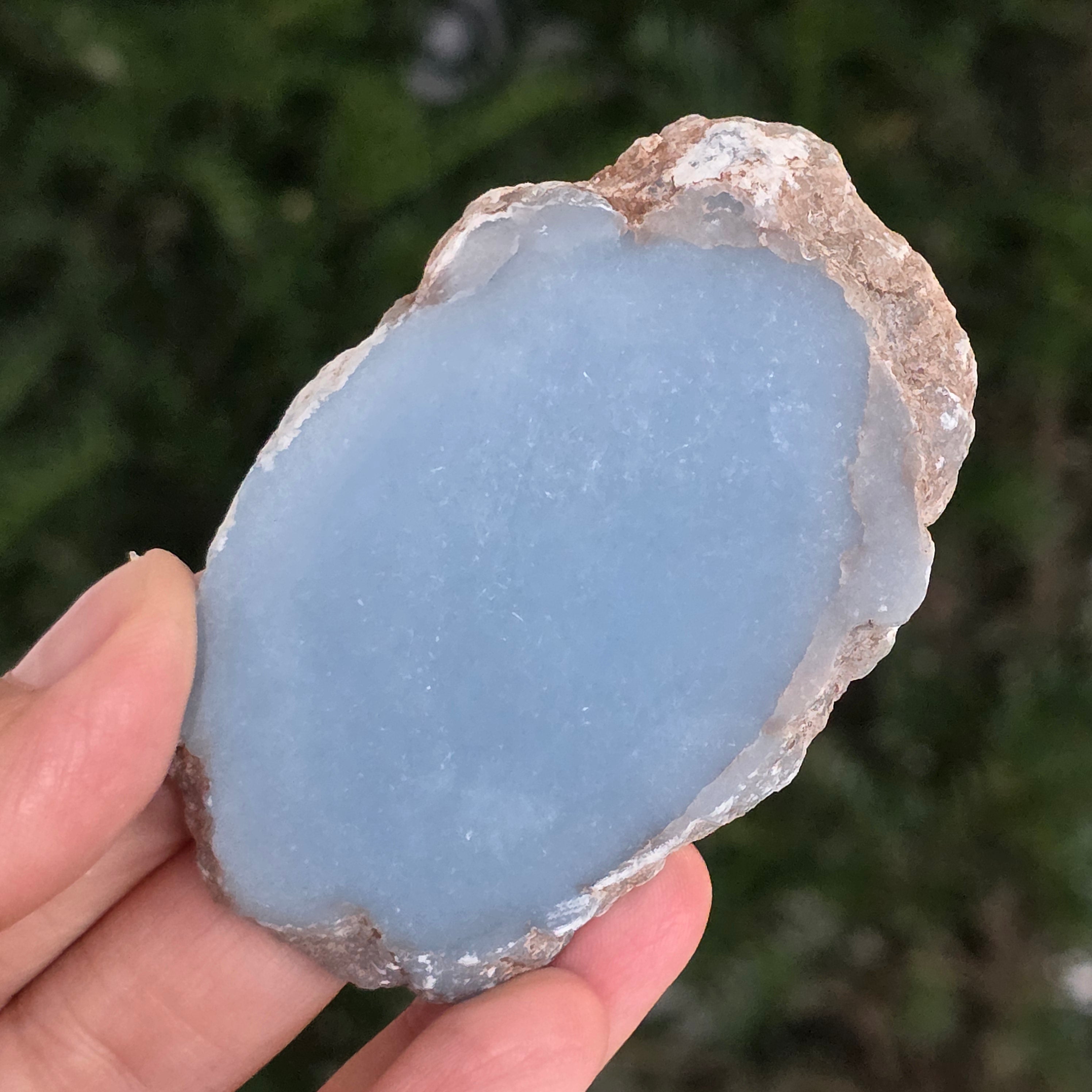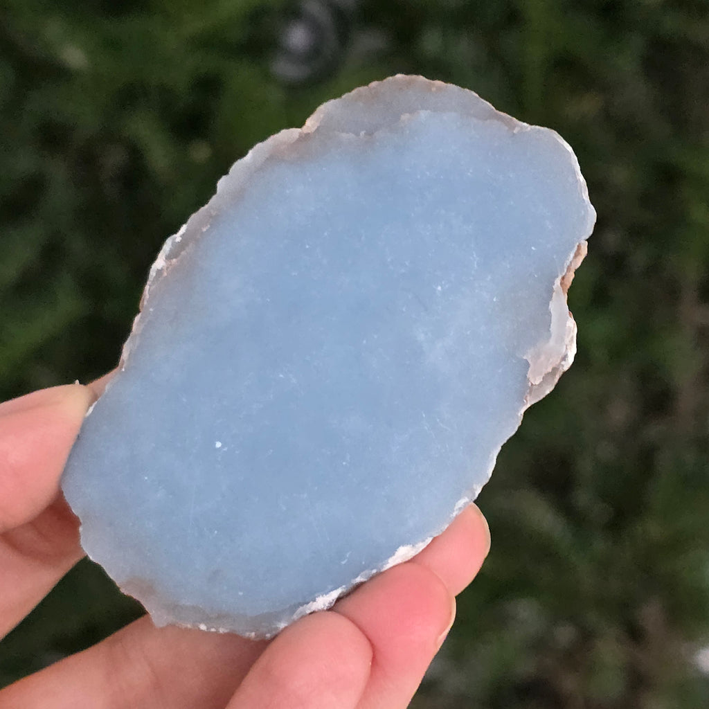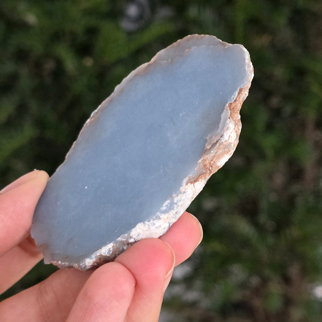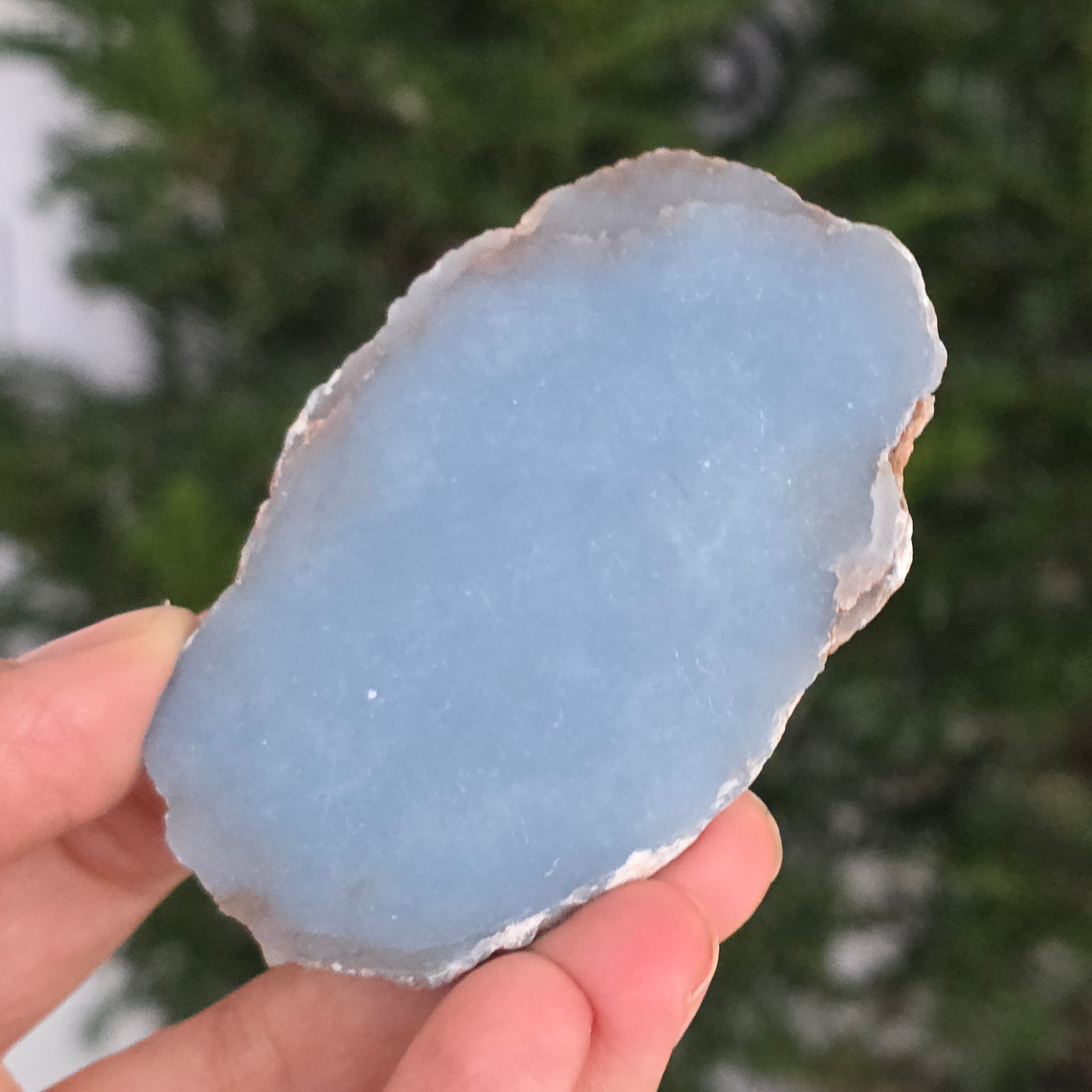 O piesă rară, ce pare desprinsă din seninul cerului. Această felie de angelit natural, dezvăluie un albastru delicat, lăptos, străbătut de nuanțe fine de gri și alb sidefat. Suprafața netedă și textura sa mată emană liniște și puritate – o bijuterie minerală a calmului și a echilibrului interior.