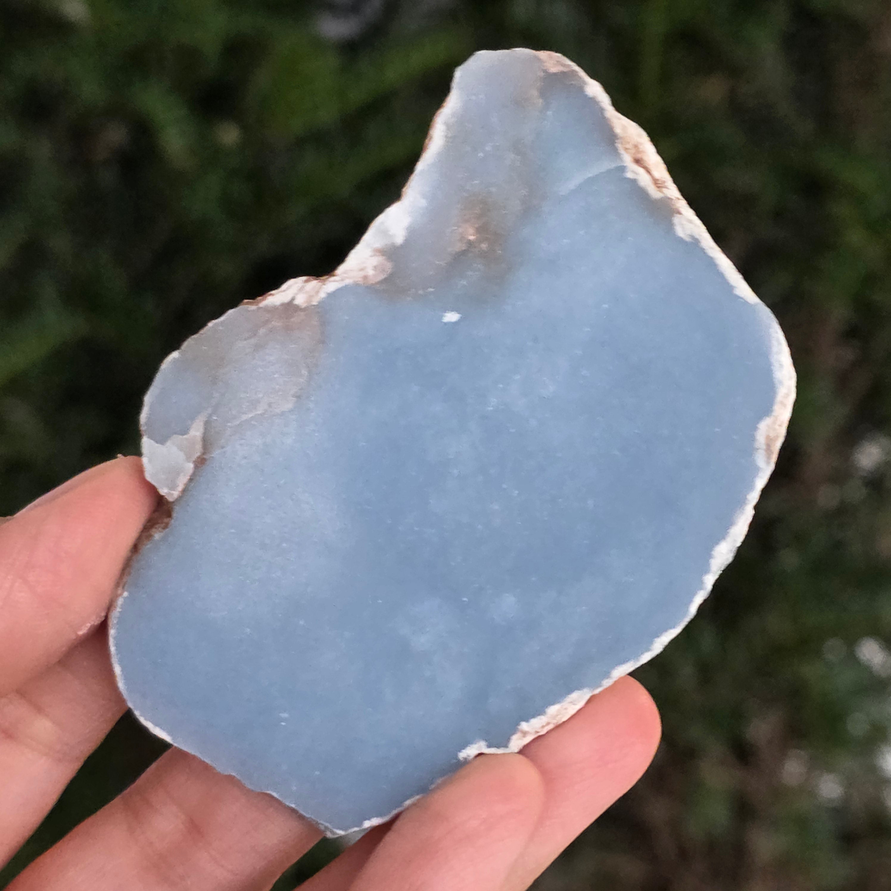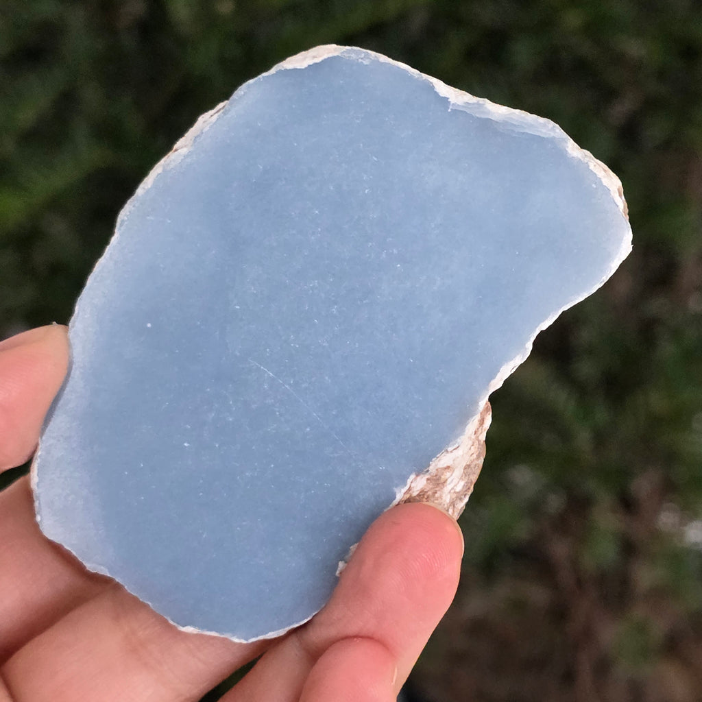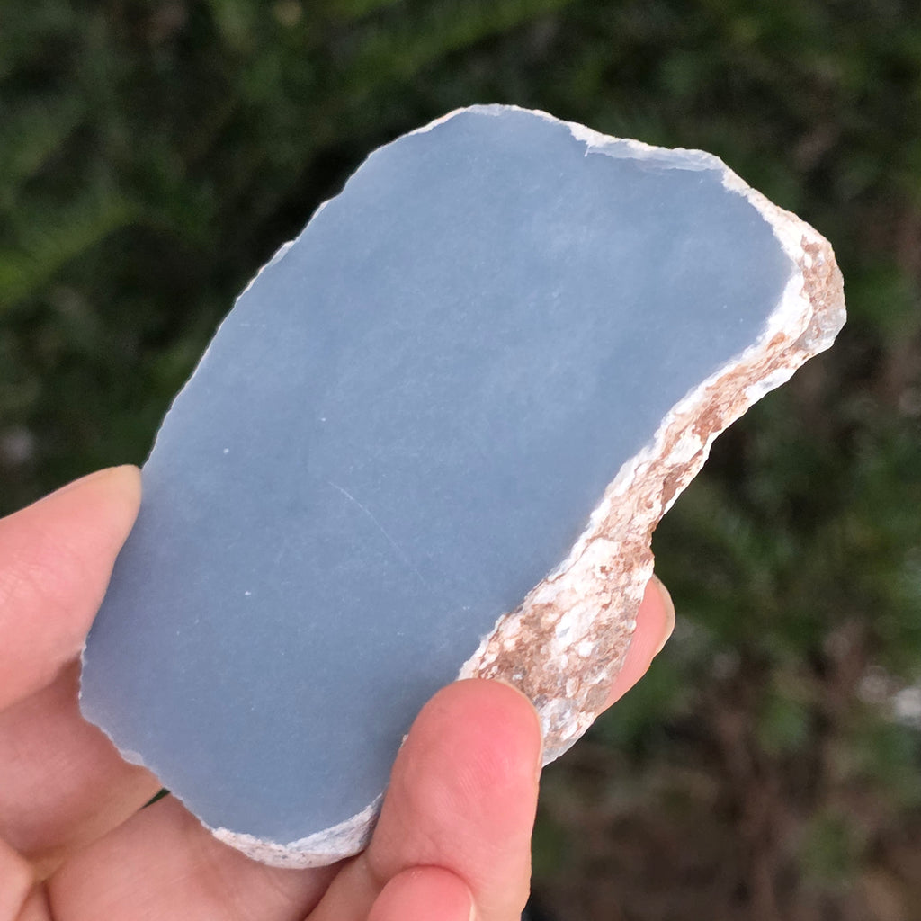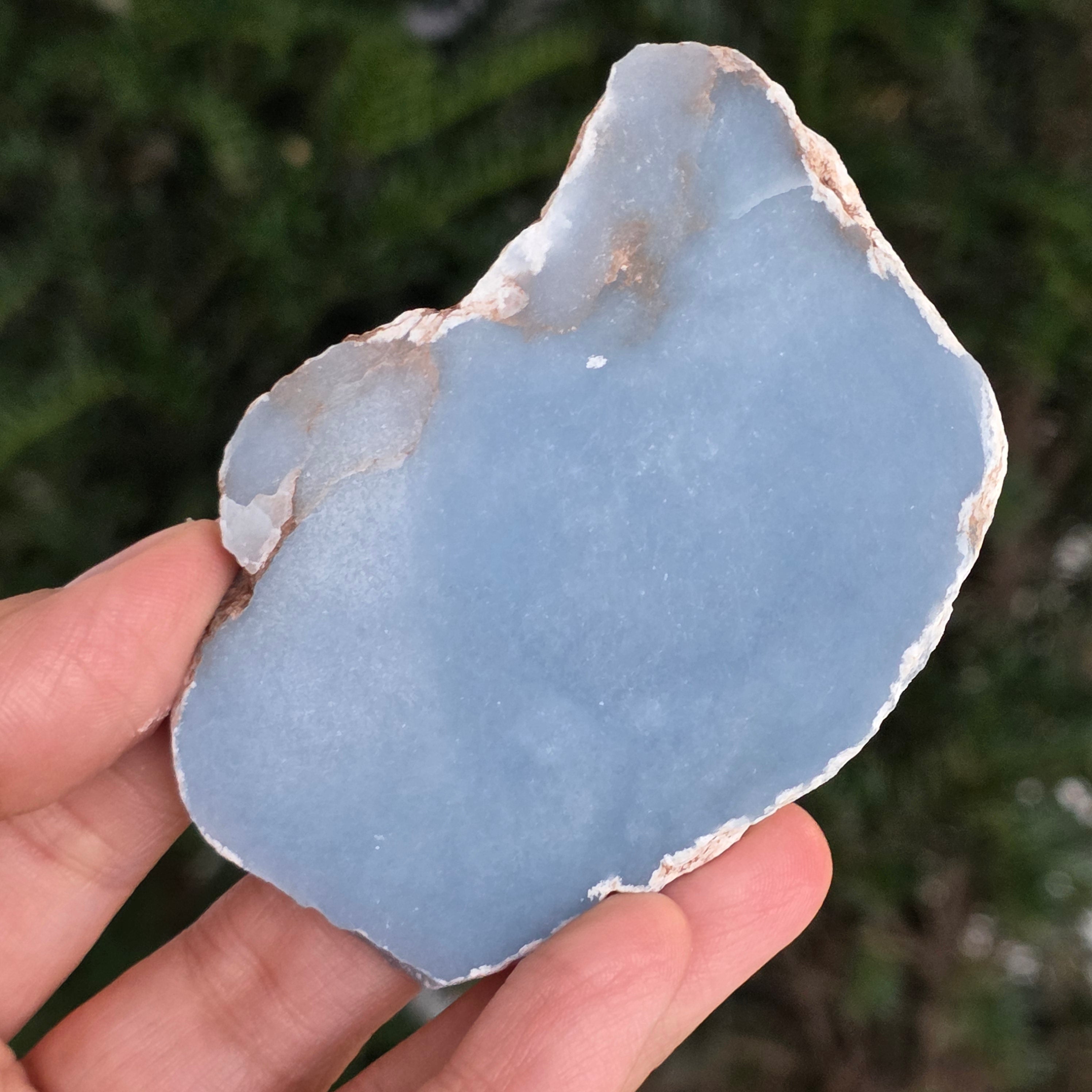 O piesă rară, ce pare desprinsă din seninul cerului. Această felie de angelit natural, dezvăluie un albastru delicat, lăptos, străbătut de nuanțe fine de gri și alb sidefat. Suprafața netedă și textura sa mată emană liniște și puritate – o bijuterie minerală a calmului și a echilibrului interior.