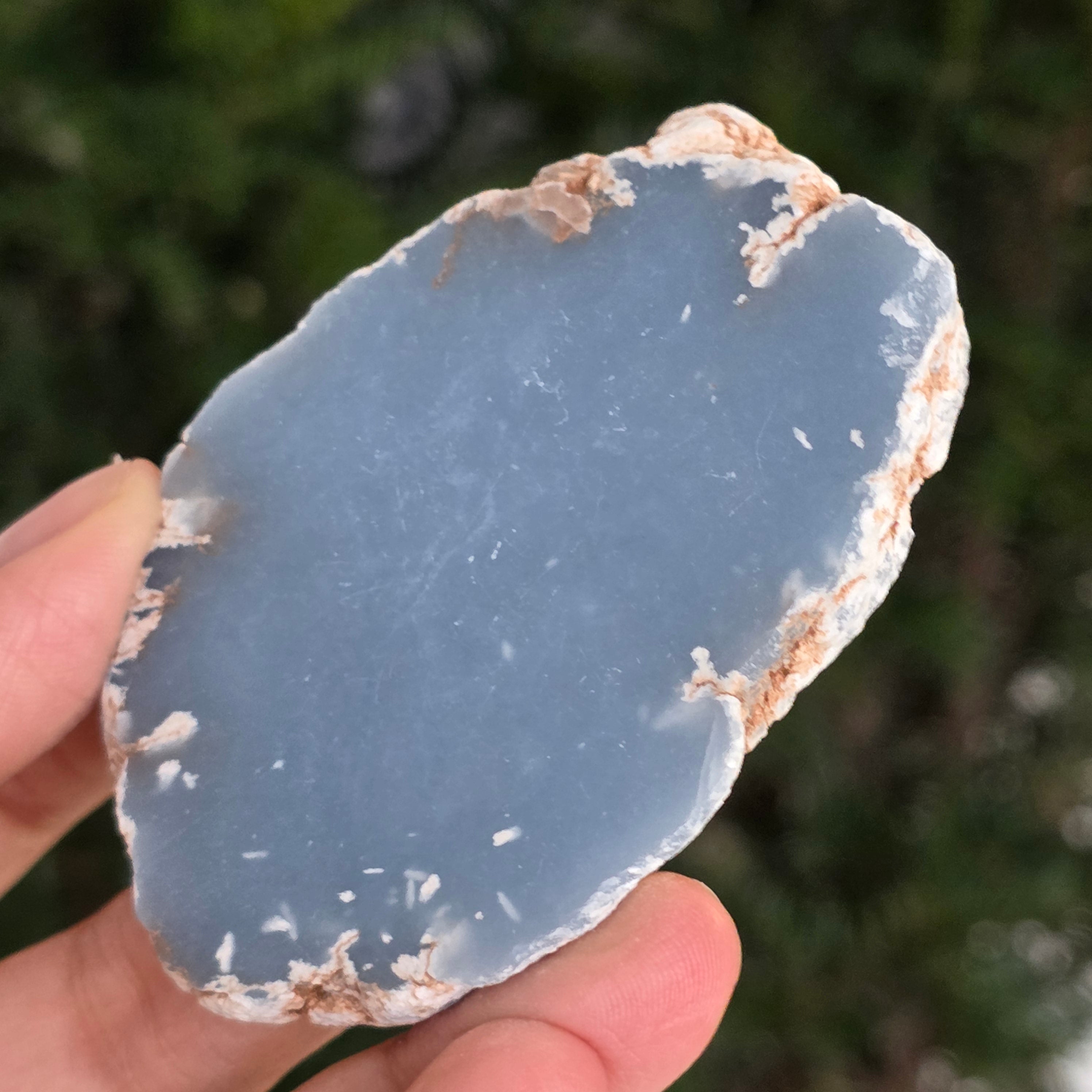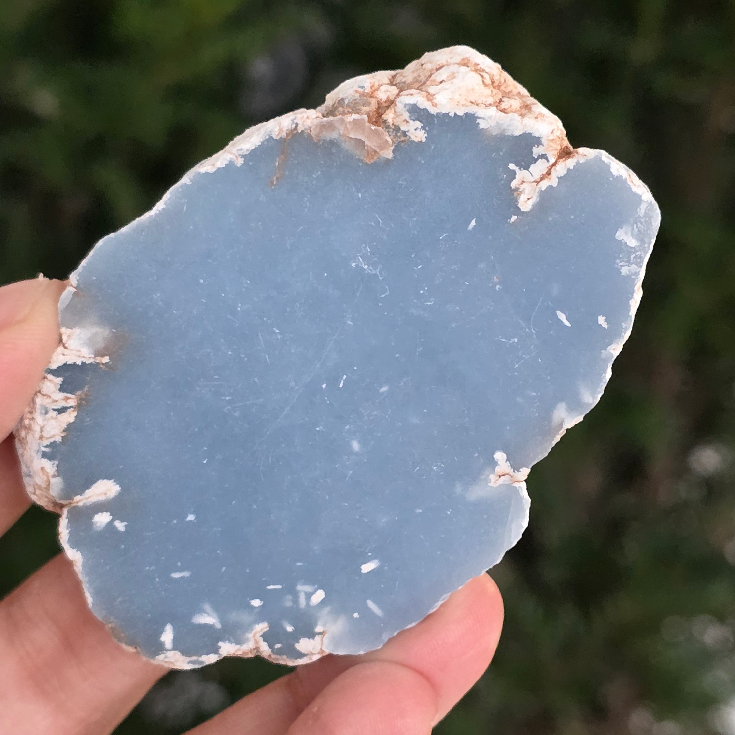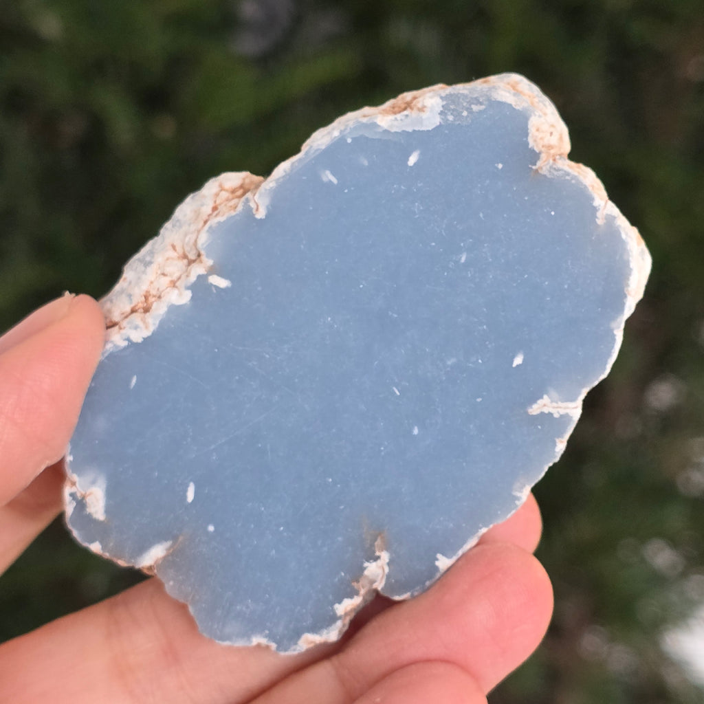 O piesă rară, ce pare desprinsă din seninul cerului. Această felie de angelit natural, dezvăluie un albastru delicat, lăptos, străbătut de nuanțe fine de gri și alb sidefat. Suprafața netedă și textura sa mată emană liniște și puritate – o bijuterie minerală a calmului și a echilibrului interior.