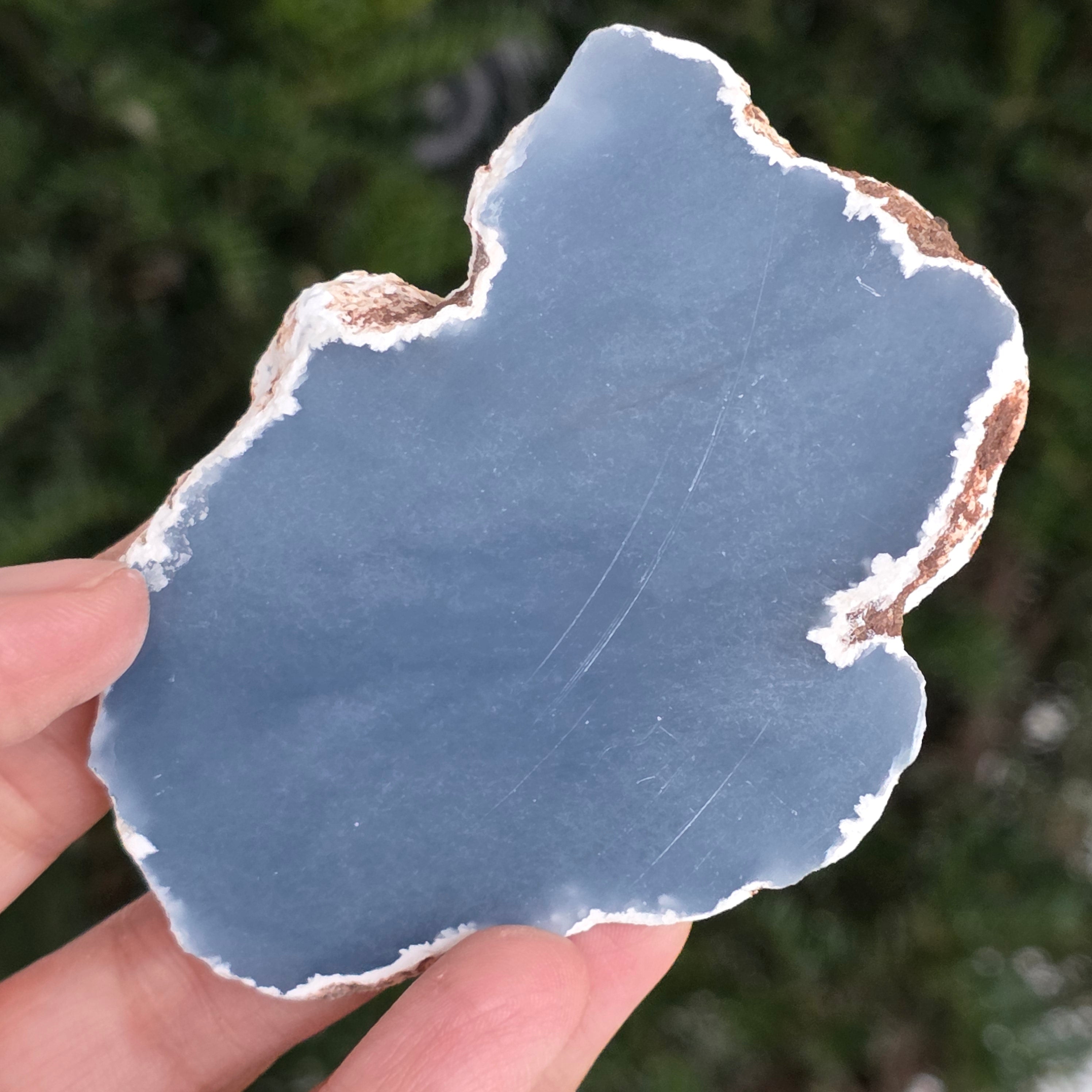 O piesă rară, ce pare desprinsă din seninul cerului. Această felie de angelit natural, dezvăluie un albastru delicat, lăptos, străbătut de nuanțe fine de gri și alb sidefat. Suprafața netedă și textura sa mată emană liniște și puritate – o bijuterie minerală a calmului și a echilibrului interior.
