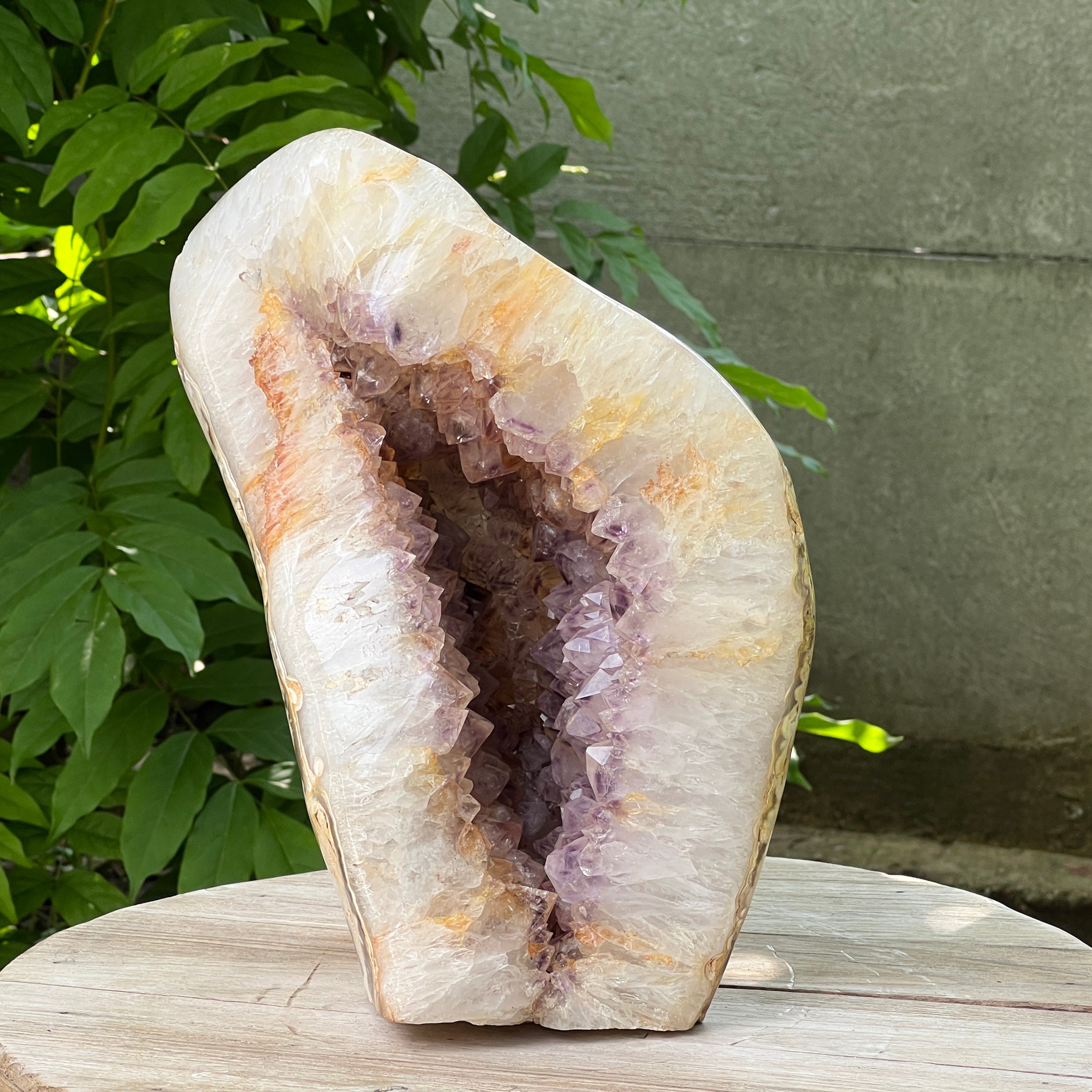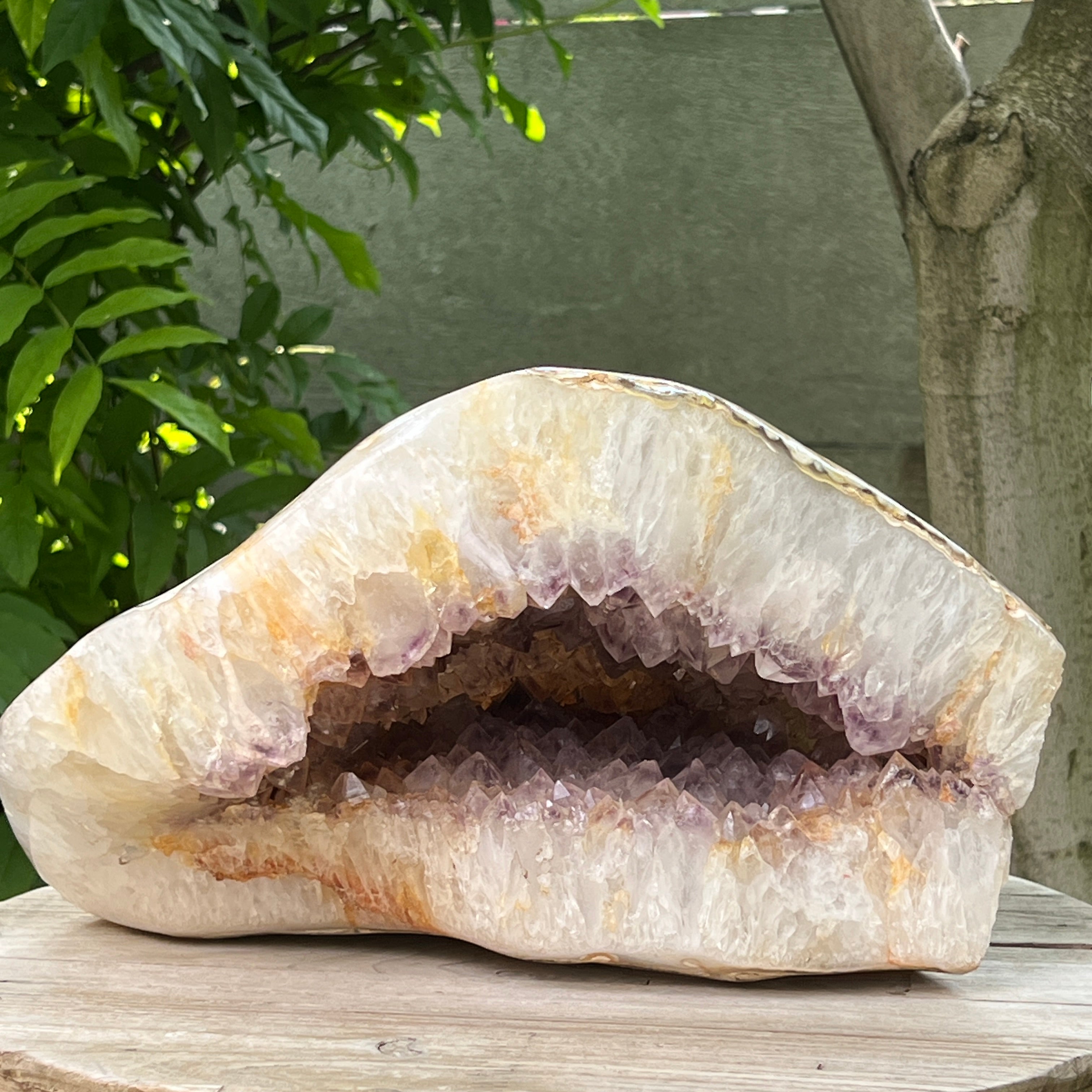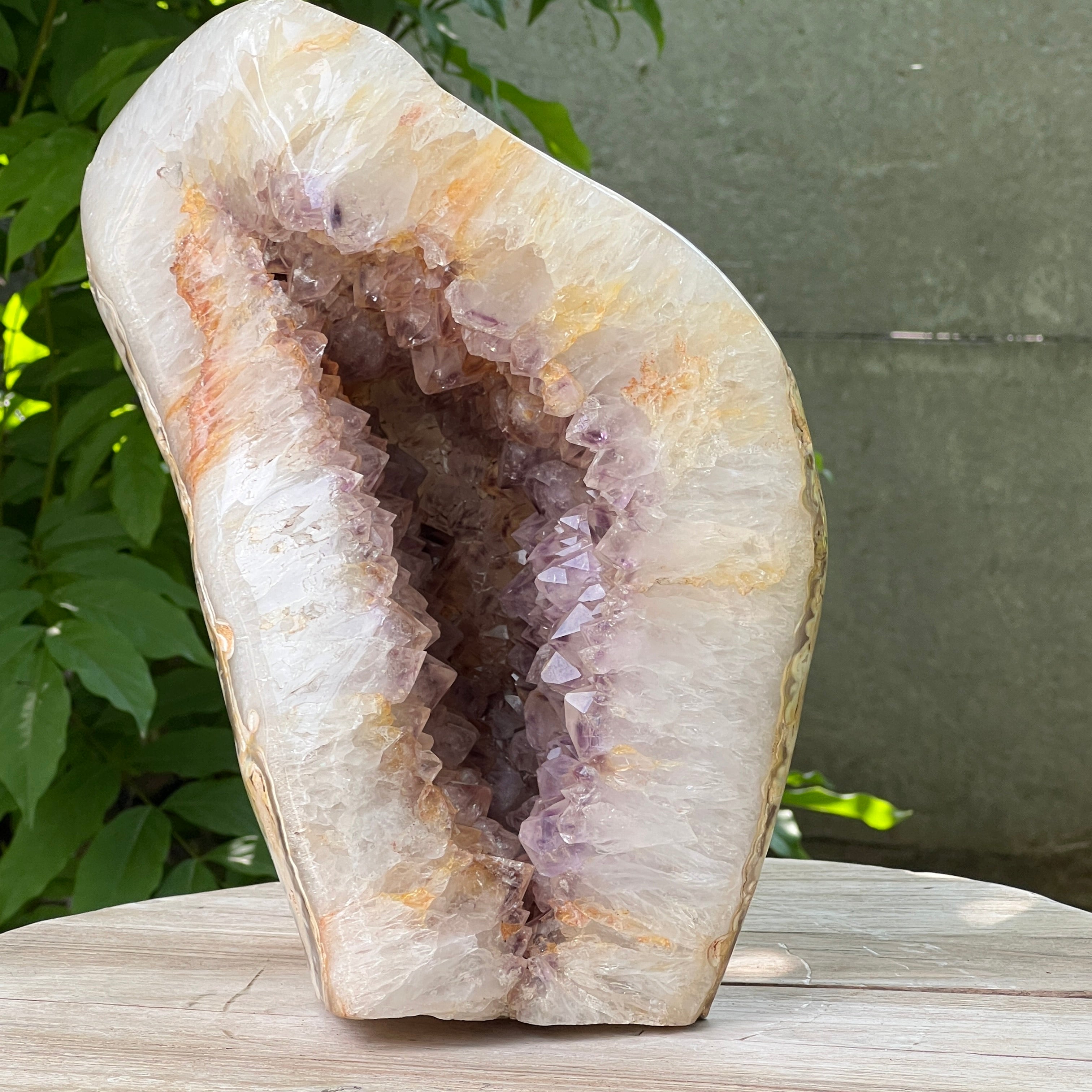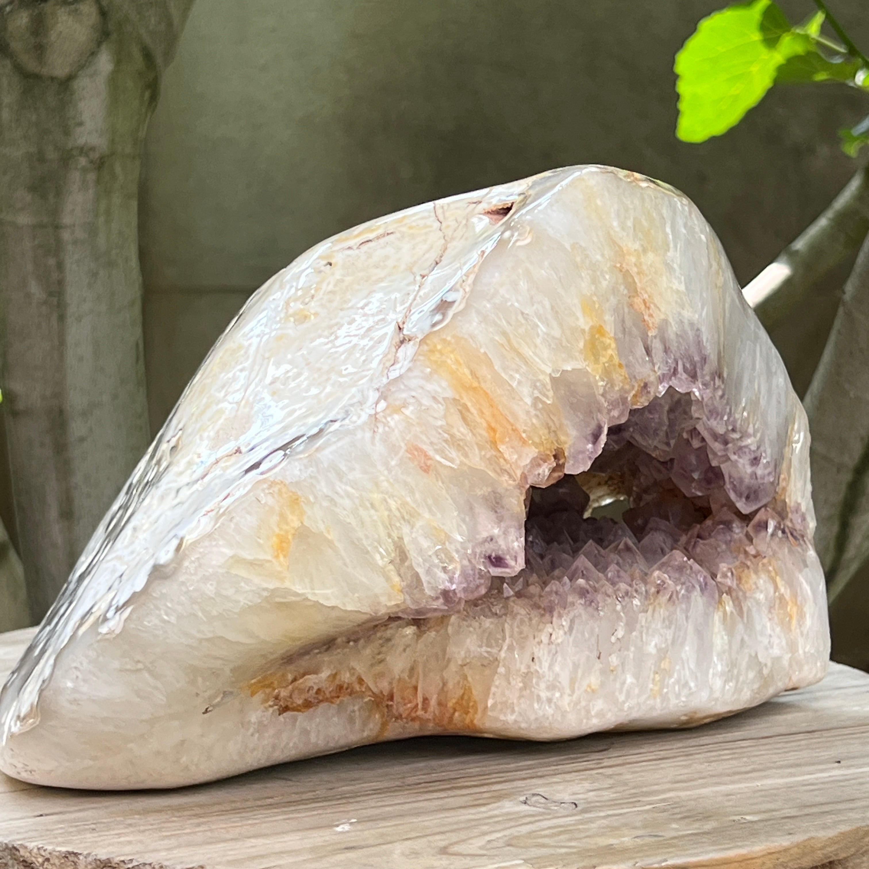 Αυτή η θεαματική geode συνδυάζει το βαθύ μυστήριο του Αμέθυστου με τη στρωματοποιημένη ηρεμία του αχάτη, αποκαλύπτοντας έναν θησαυρό της φύσης που έχει χαραχθεί από το χρόνο και την ενέργεια. Κάθε λεπτομέρεια του κρυμμένου εσωτερικού χώρου - φωτεινών κρυστάλλων αμέθυστων σε ιώδεις αποχρώσεις - επισημαίνεται από το λεπτό και σταθερό περίγραμμα του αχάτη, ως καρδιά που προστατεύεται από φλοιό σοφίας.