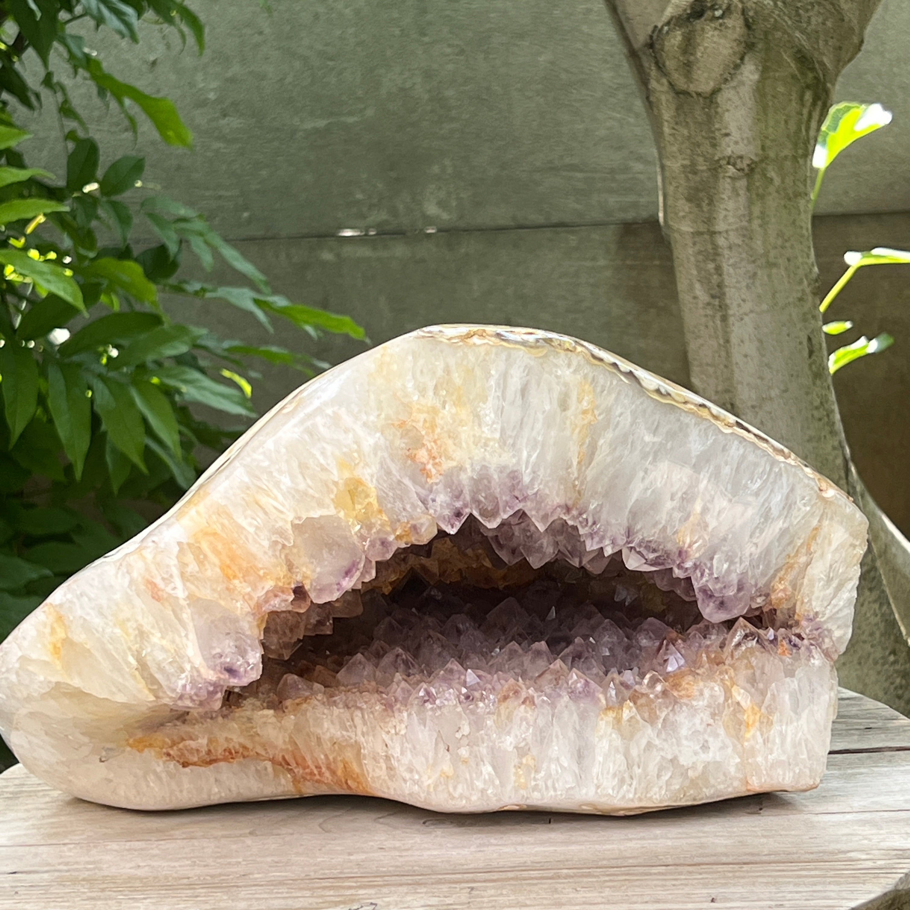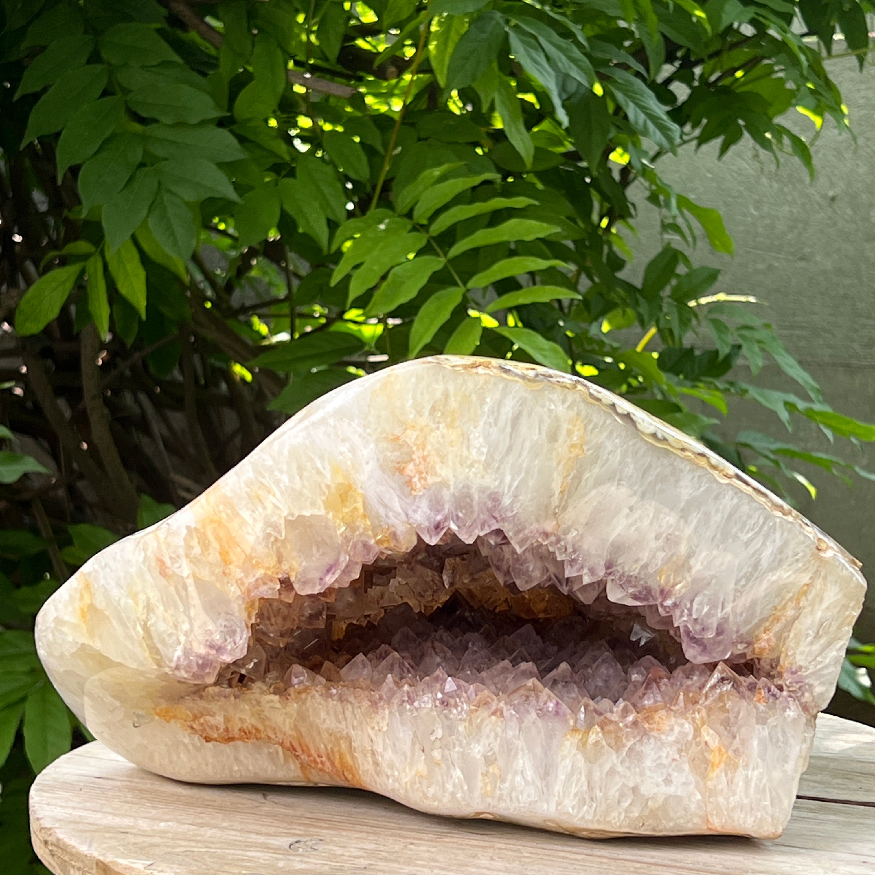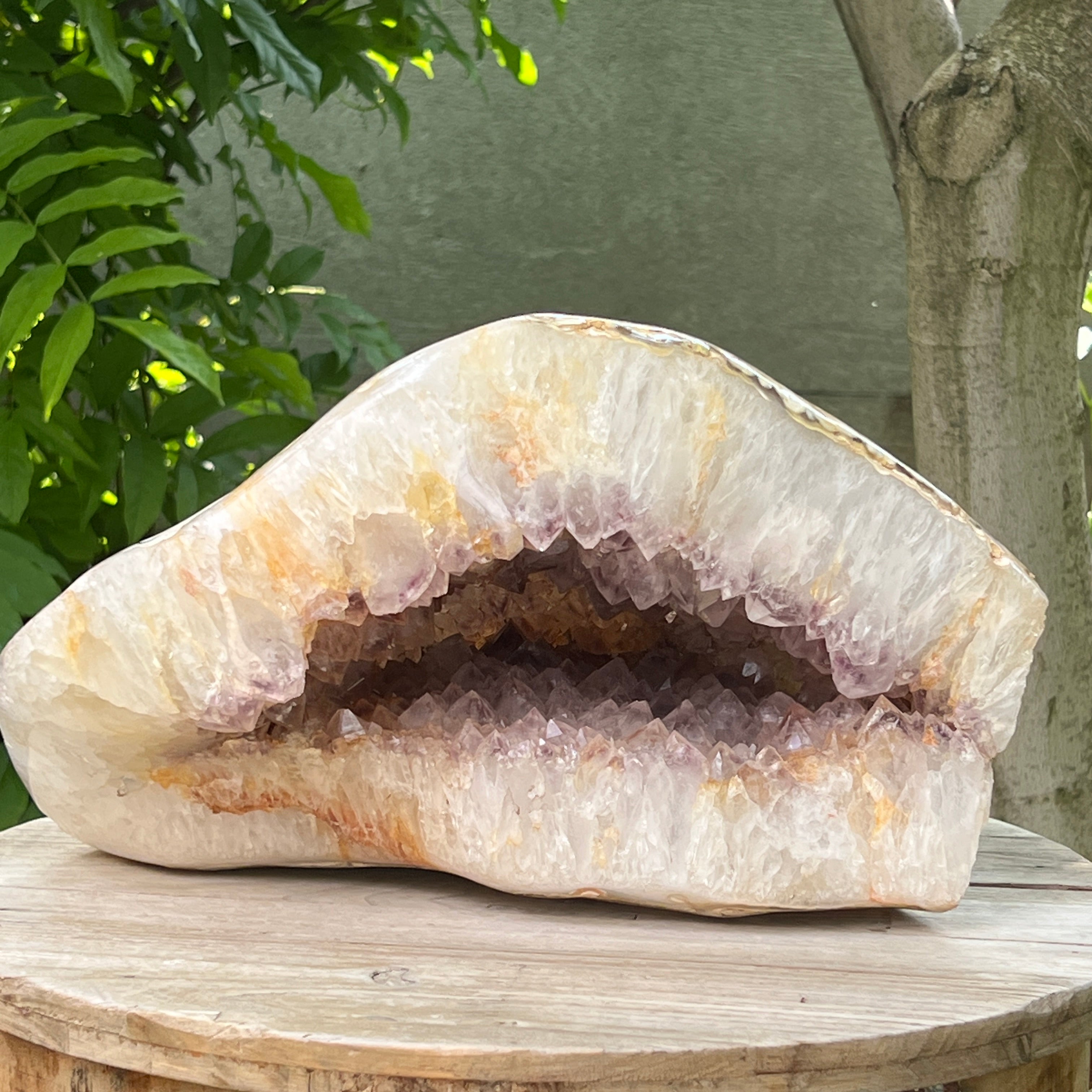 Αυτή η θεαματική geode συνδυάζει το βαθύ μυστήριο του Αμέθυστου με τη στρωματοποιημένη ηρεμία του αχάτη, αποκαλύπτοντας έναν θησαυρό της φύσης που έχει χαραχθεί από το χρόνο και την ενέργεια. Κάθε λεπτομέρεια του κρυμμένου εσωτερικού χώρου - φωτεινών κρυστάλλων αμέθυστων σε ιώδεις αποχρώσεις - επισημαίνεται από το λεπτό και σταθερό περίγραμμα του αχάτη, ως καρδιά που προστατεύεται από φλοιό σοφίας.