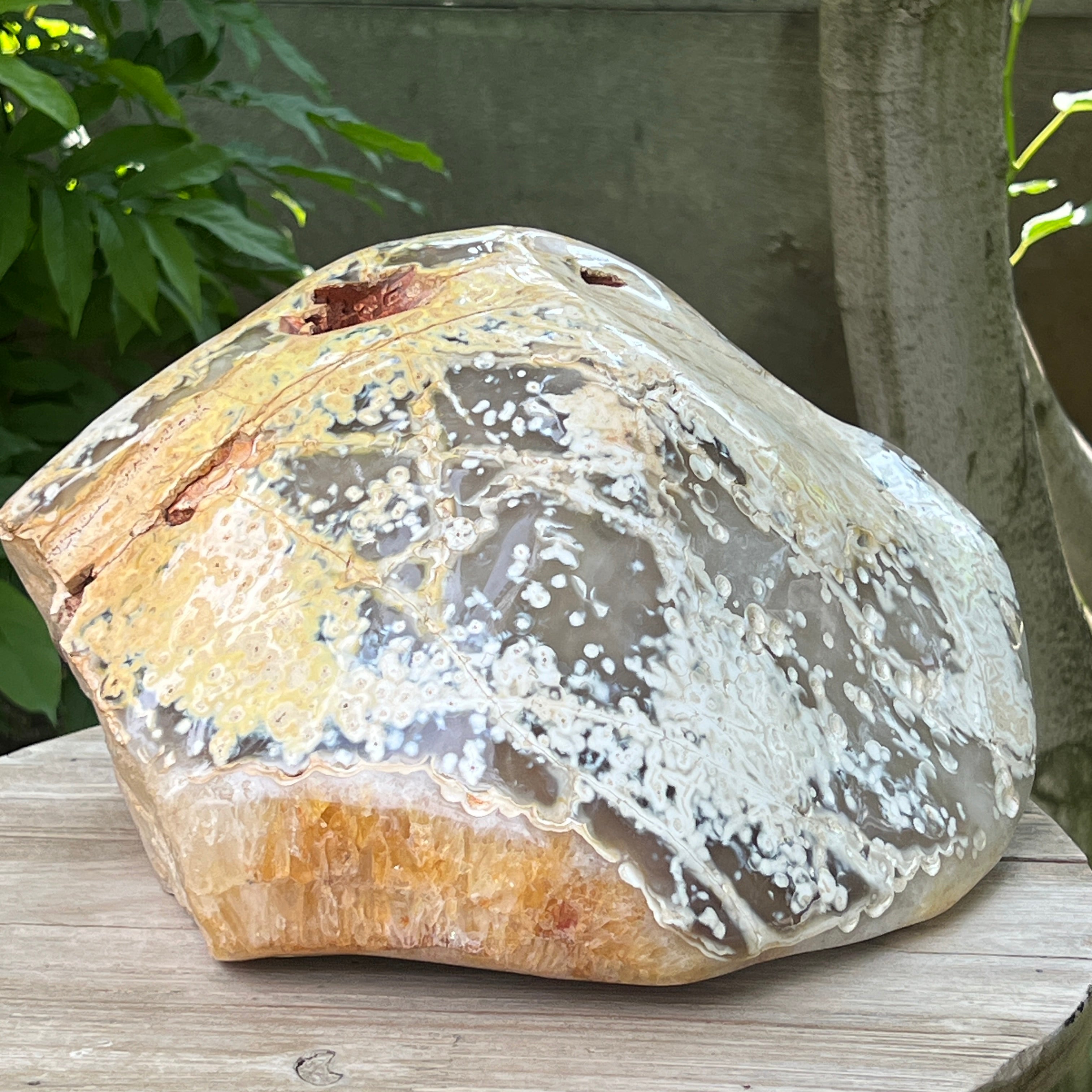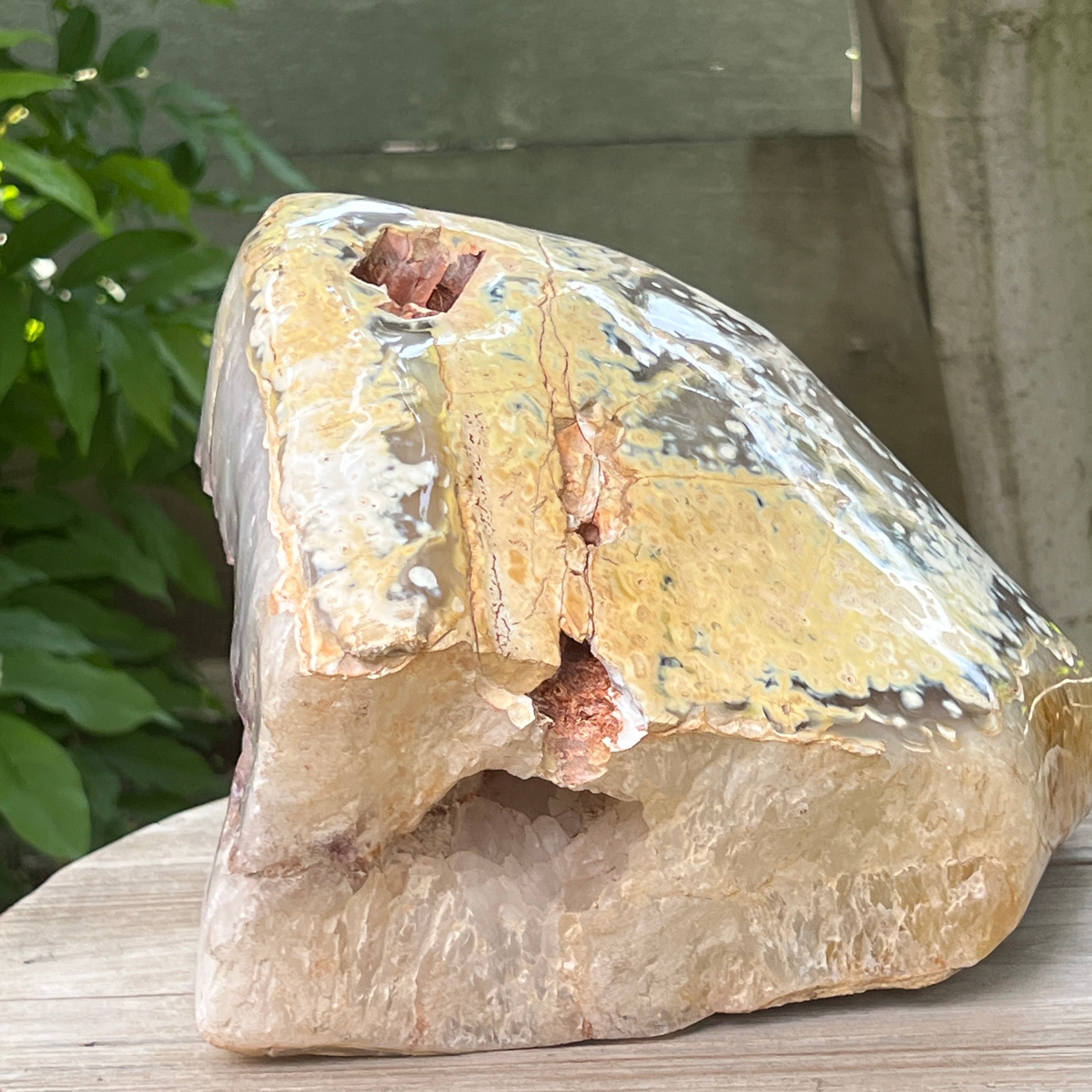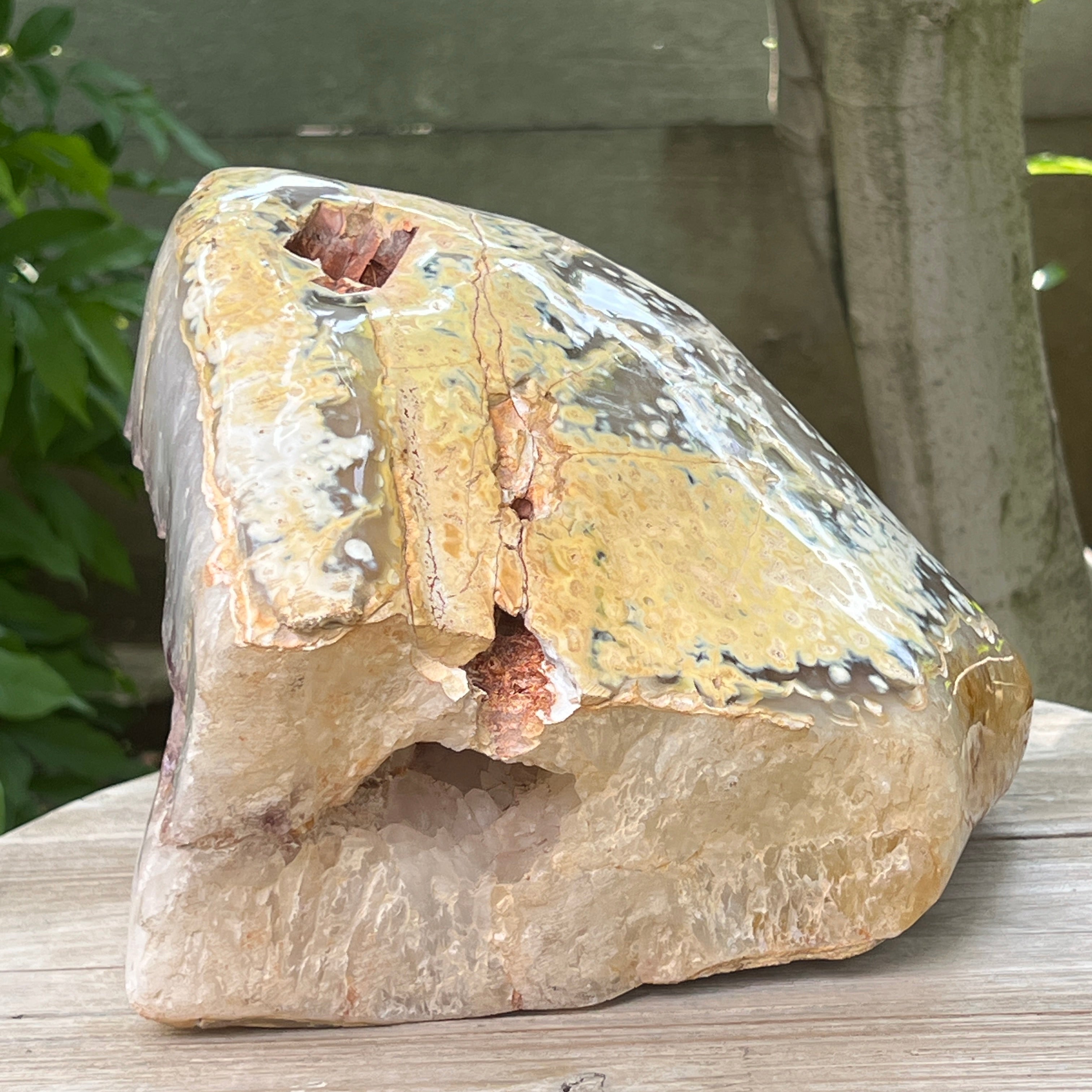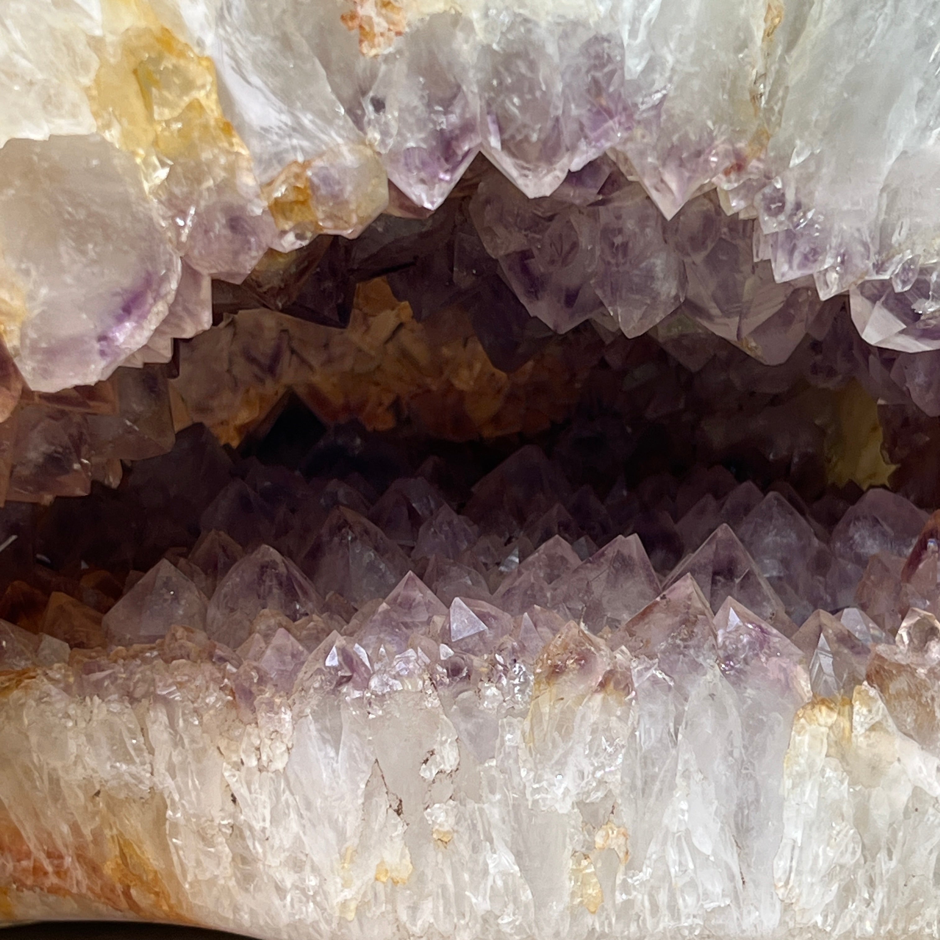 Αυτή η θεαματική geode συνδυάζει το βαθύ μυστήριο του Αμέθυστου με τη στρωματοποιημένη ηρεμία του αχάτη, αποκαλύπτοντας έναν θησαυρό της φύσης που έχει χαραχθεί από το χρόνο και την ενέργεια. Κάθε λεπτομέρεια του κρυμμένου εσωτερικού χώρου - φωτεινών κρυστάλλων αμέθυστων σε ιώδεις αποχρώσεις - επισημαίνεται από το λεπτό και σταθερό περίγραμμα του αχάτη, ως καρδιά που προστατεύεται από φλοιό σοφίας.