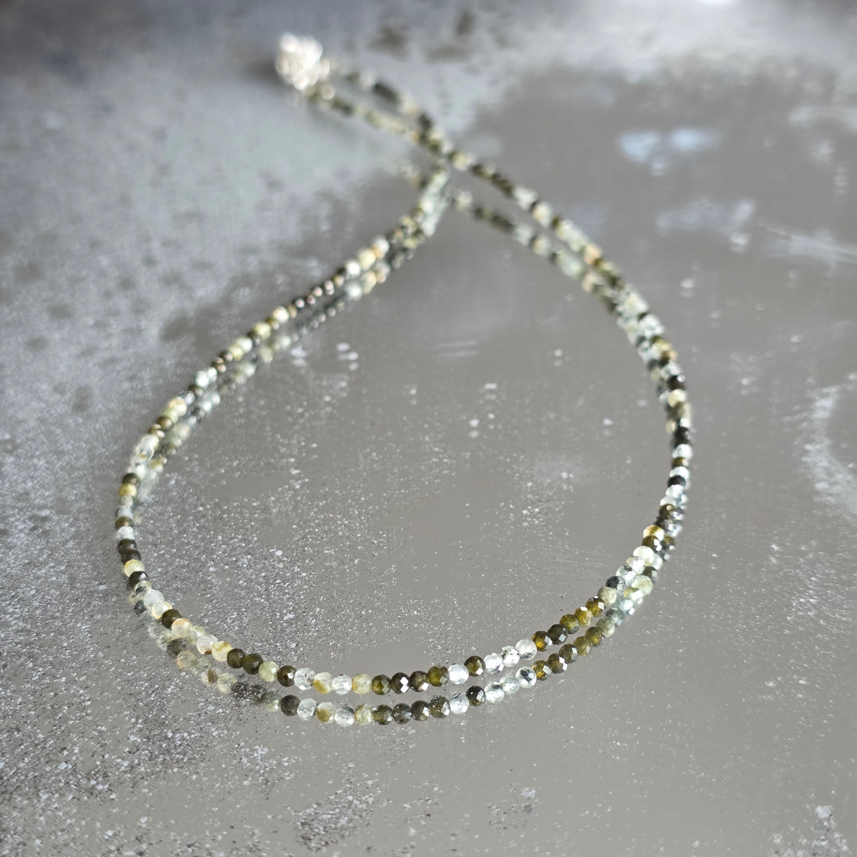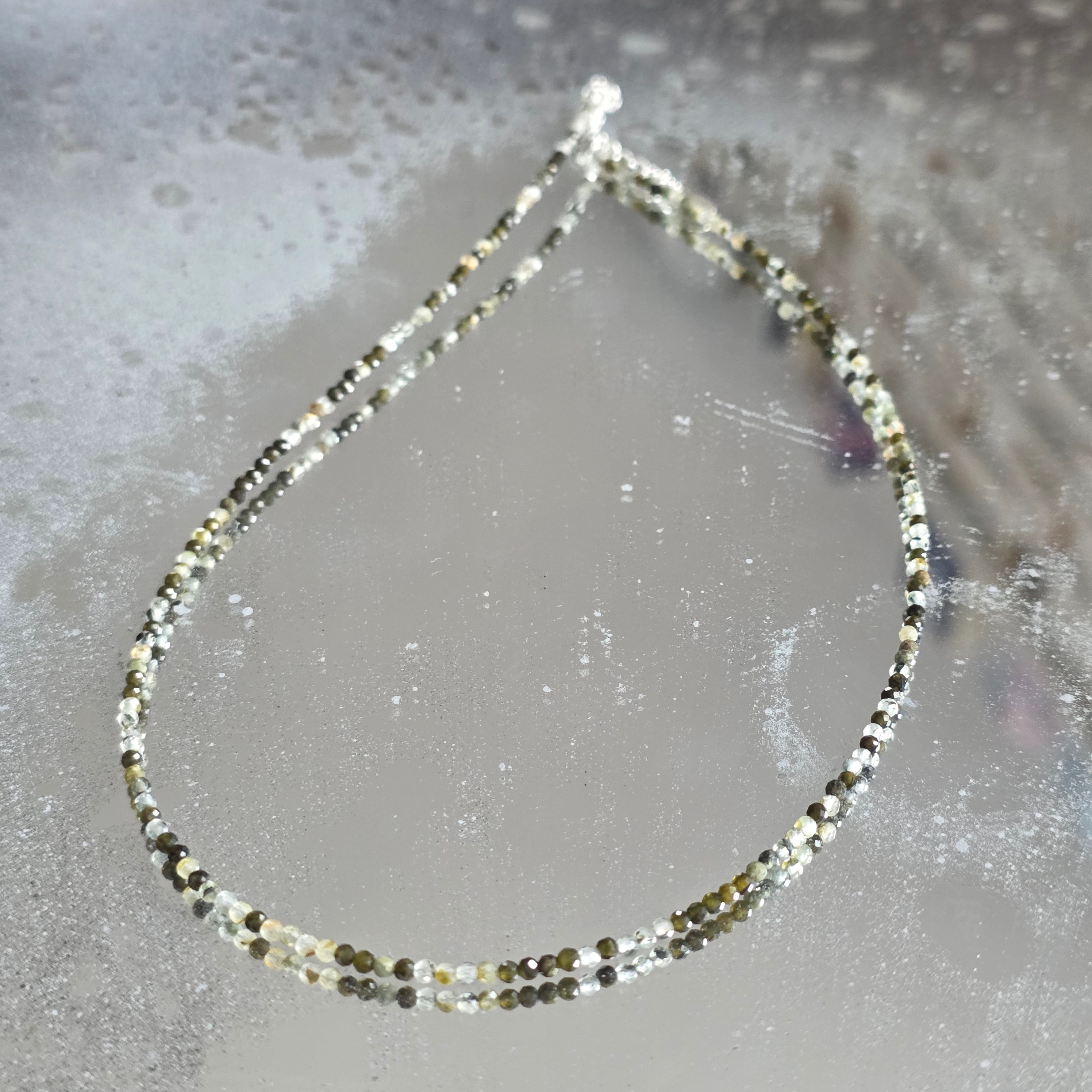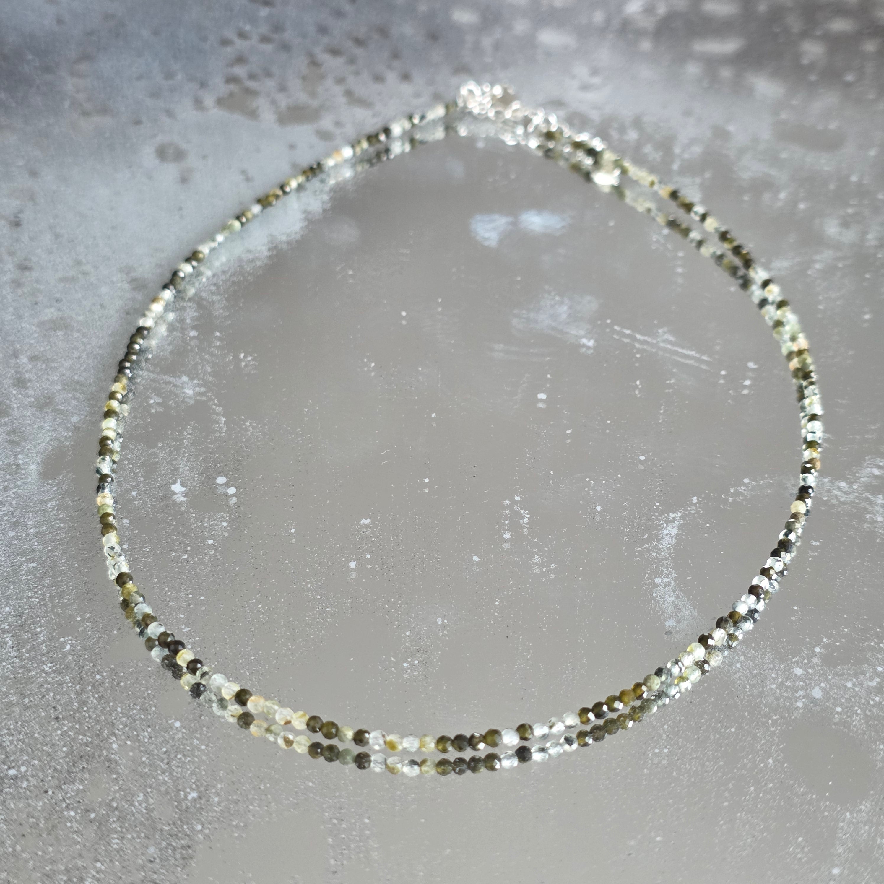 Ένα κολιέ που συνδυάζει τη δύναμη με την ομορφιά της διαφορετικότητας. Φυσική τουρμαλίνη 2mm αποκαλύπτει μια συμφωνία γήινων και παστέλ χρωμάτων, σαν ένας φθινοπωρινός κήπος που αιχμαλωτίζεται στο φως. Οι λεπτές όψεις του αντανακλούν διακριτικά κάθε απόχρωση, δίνοντας στο κολιέ έναν αέρα φινέτσας και γεμάτο ζωντάνια.