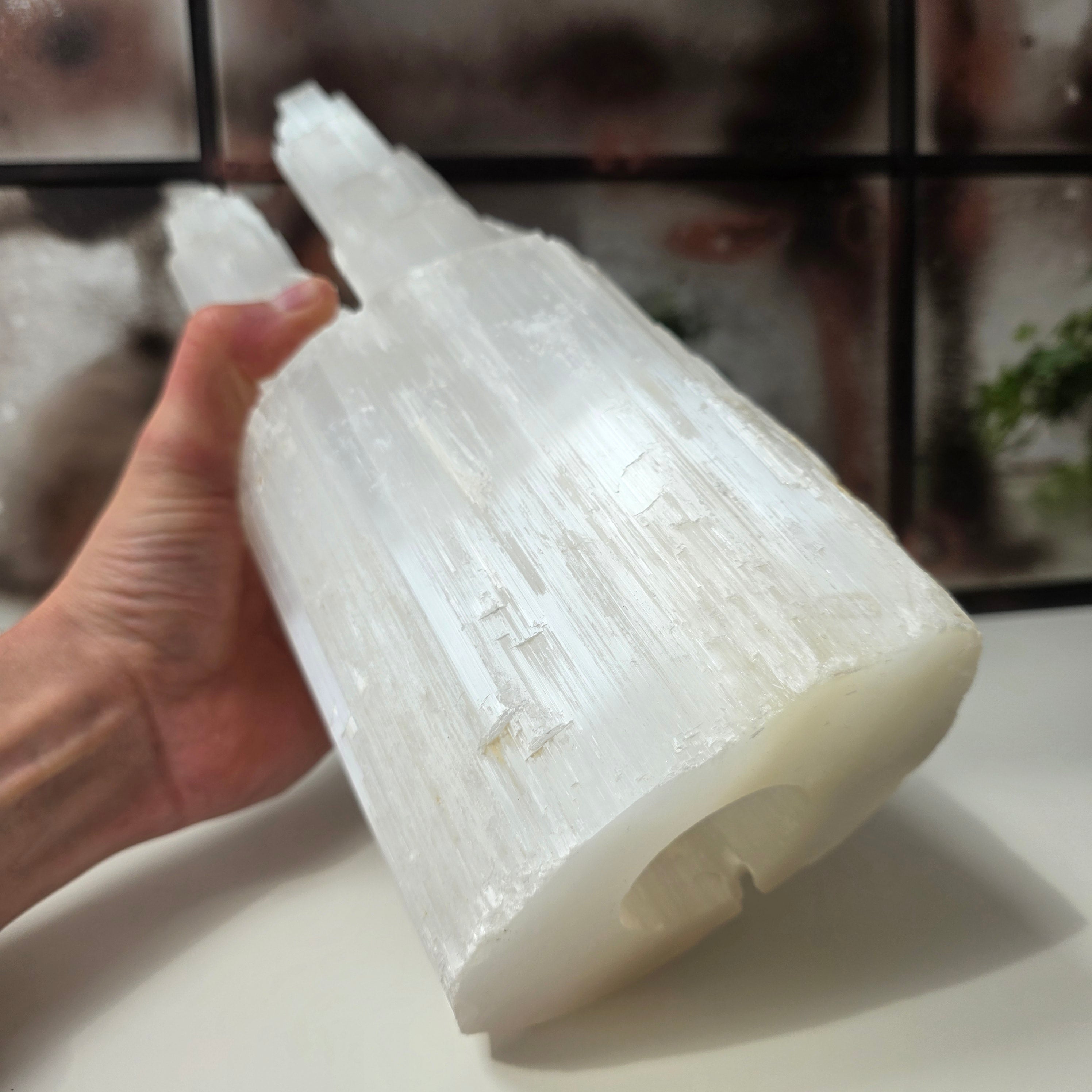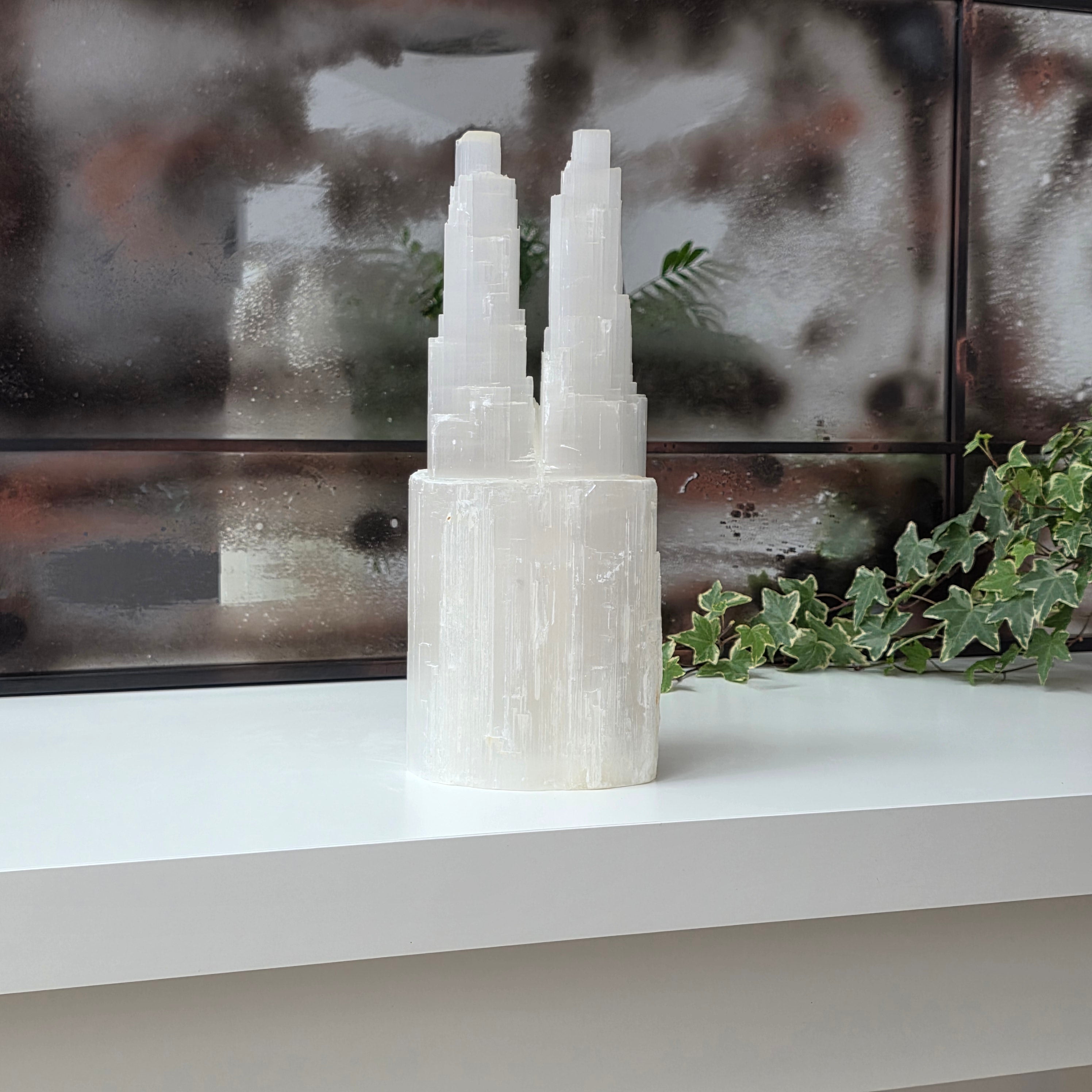 Αυτό το κηροπήγιο σε σχήμα πύργου, κατασκευασμένο από φυσικό σεληνίτη, φέρνει μια νότα μαγείας και φωτός σε κάθε χώρο. Ο σεληνίτης θεωρείται η πέτρα της αγνότητας και της εσωτερικής γαλήνης.
