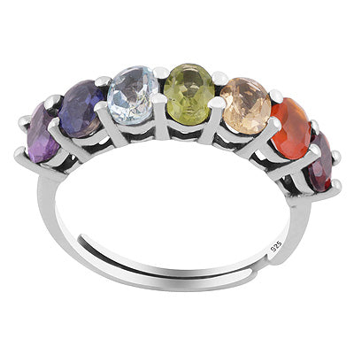 Acest inel spectaculos din argint 925 reunește șapte pietre semiprețioase autentice, fiecare corespondentă unei chakre principale din corpul uman.