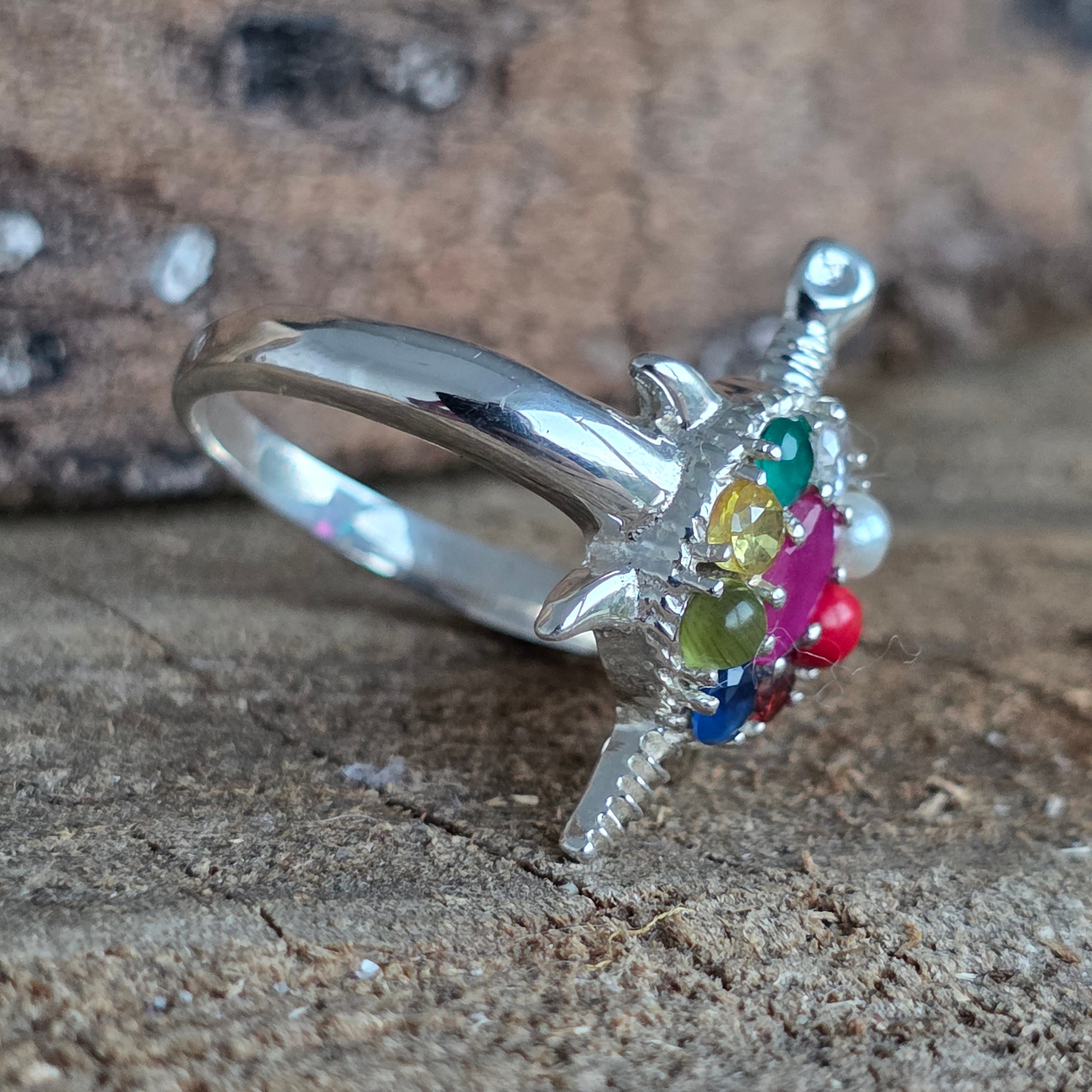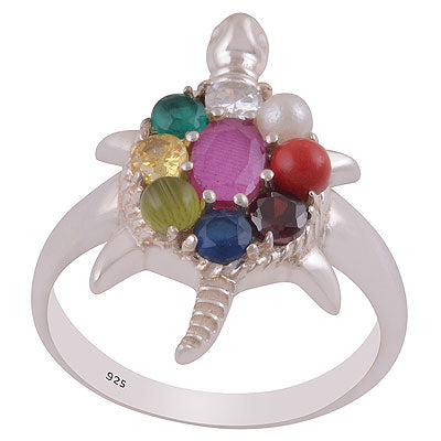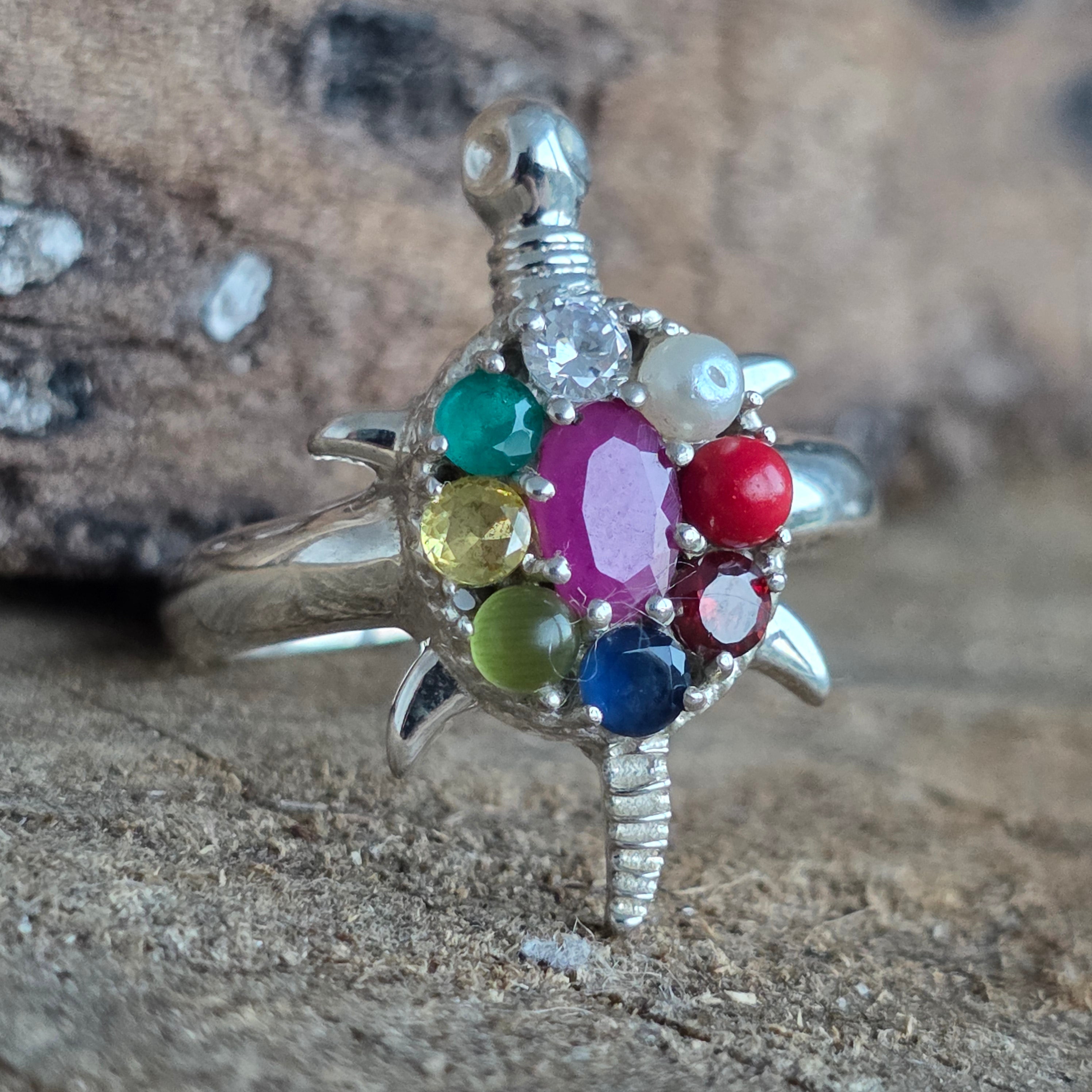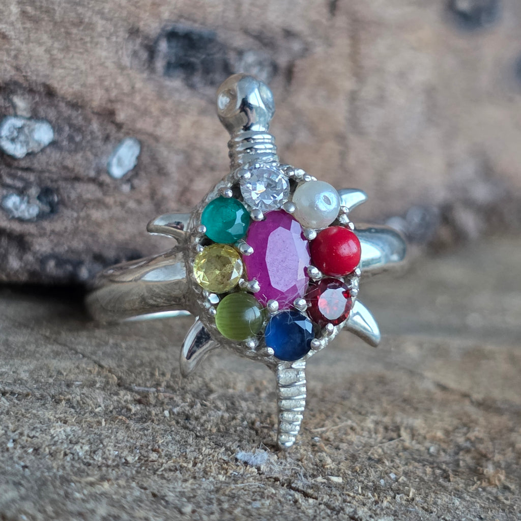 Un inel de inspirație tradițională, lucrat cu atenție în argint 925, ce îmbină simbolul antic al țestoasei cu cele nouă pietre sacre Navratna – fiecare purtând energia unei planete din astrologia vedică.